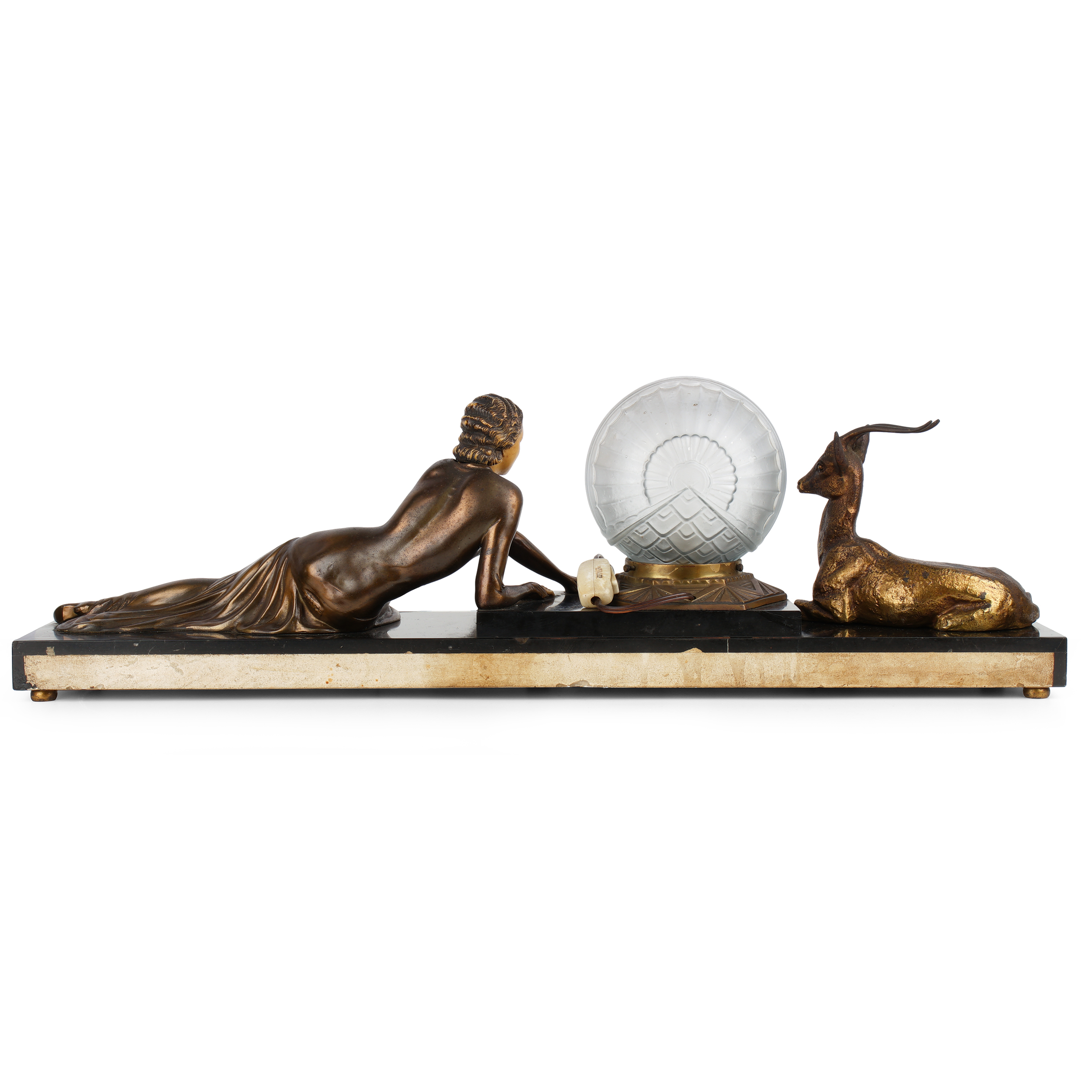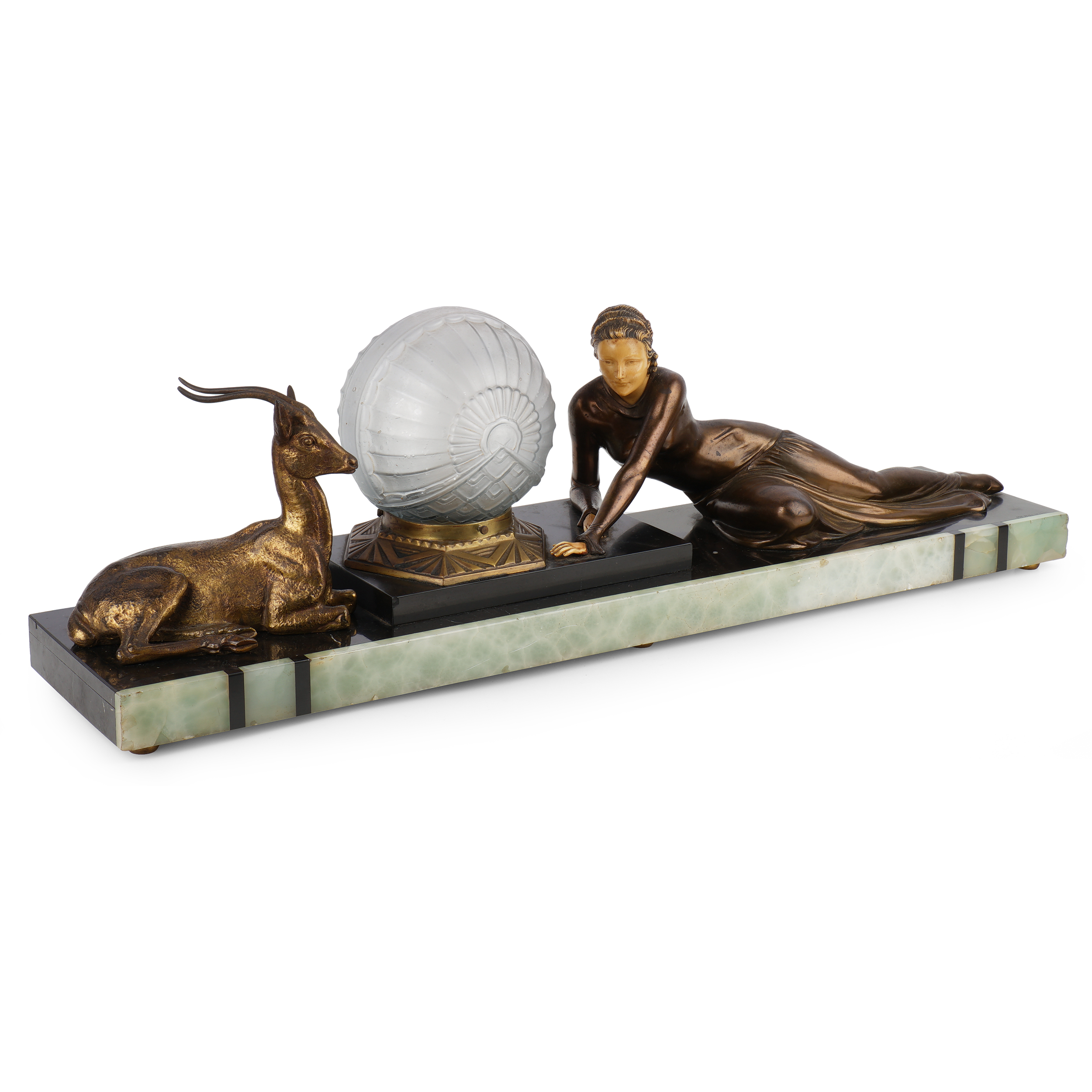 Кабинетная скульптура с лампой в стиле ар-деко. Бронза, литье, окраска, мрамор, оникс, матовое стекло,размер (в/ш/г): 24 х 77 х 17 см