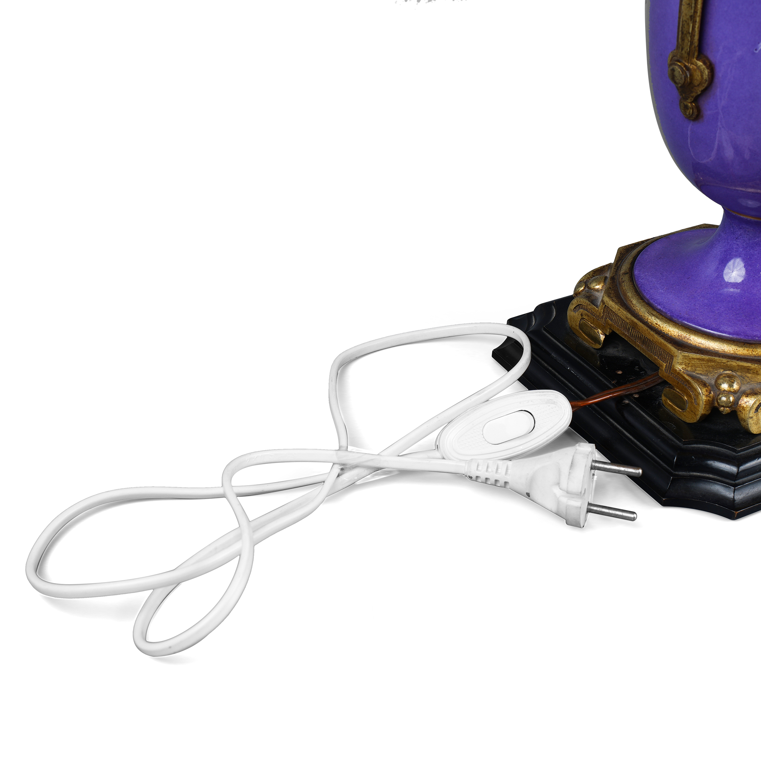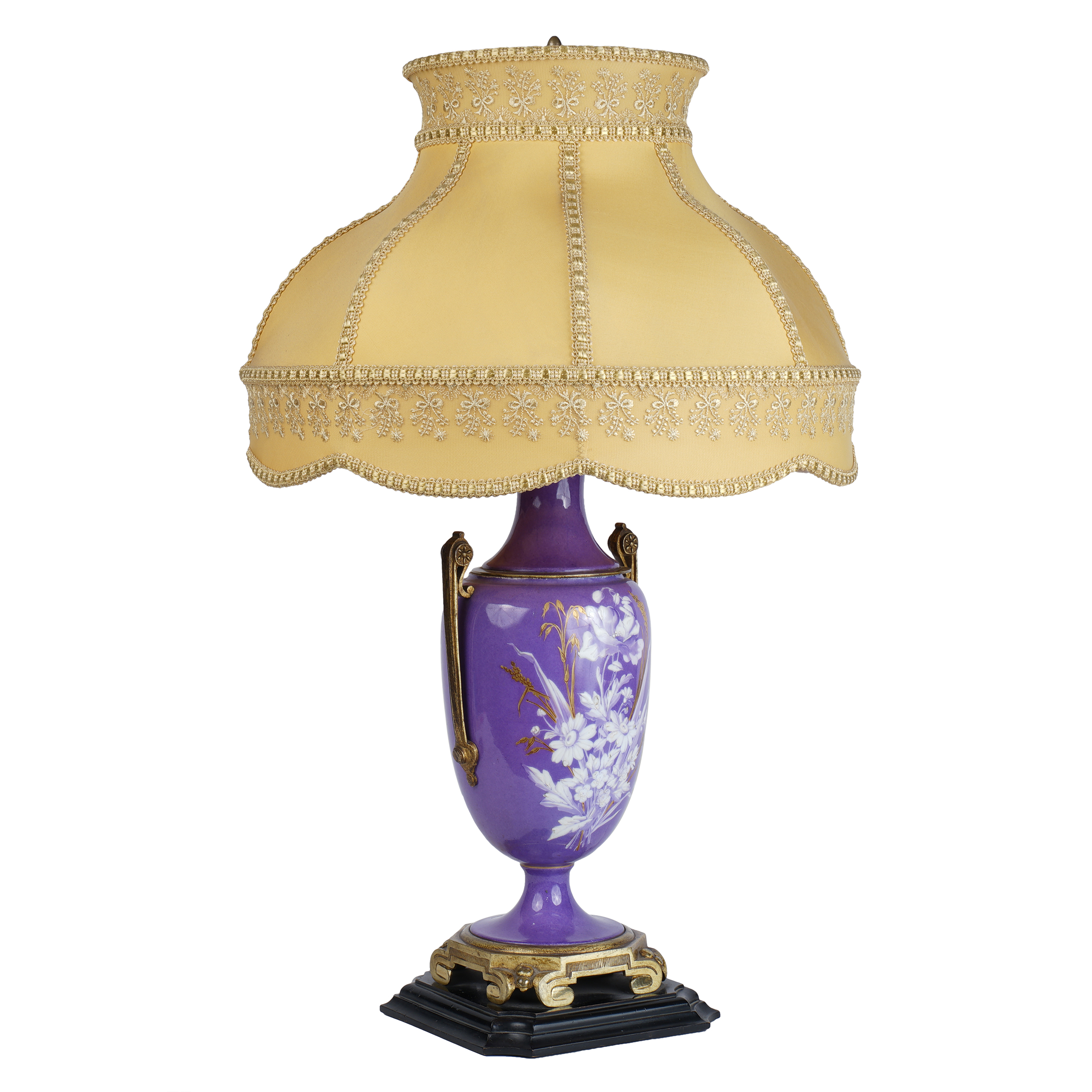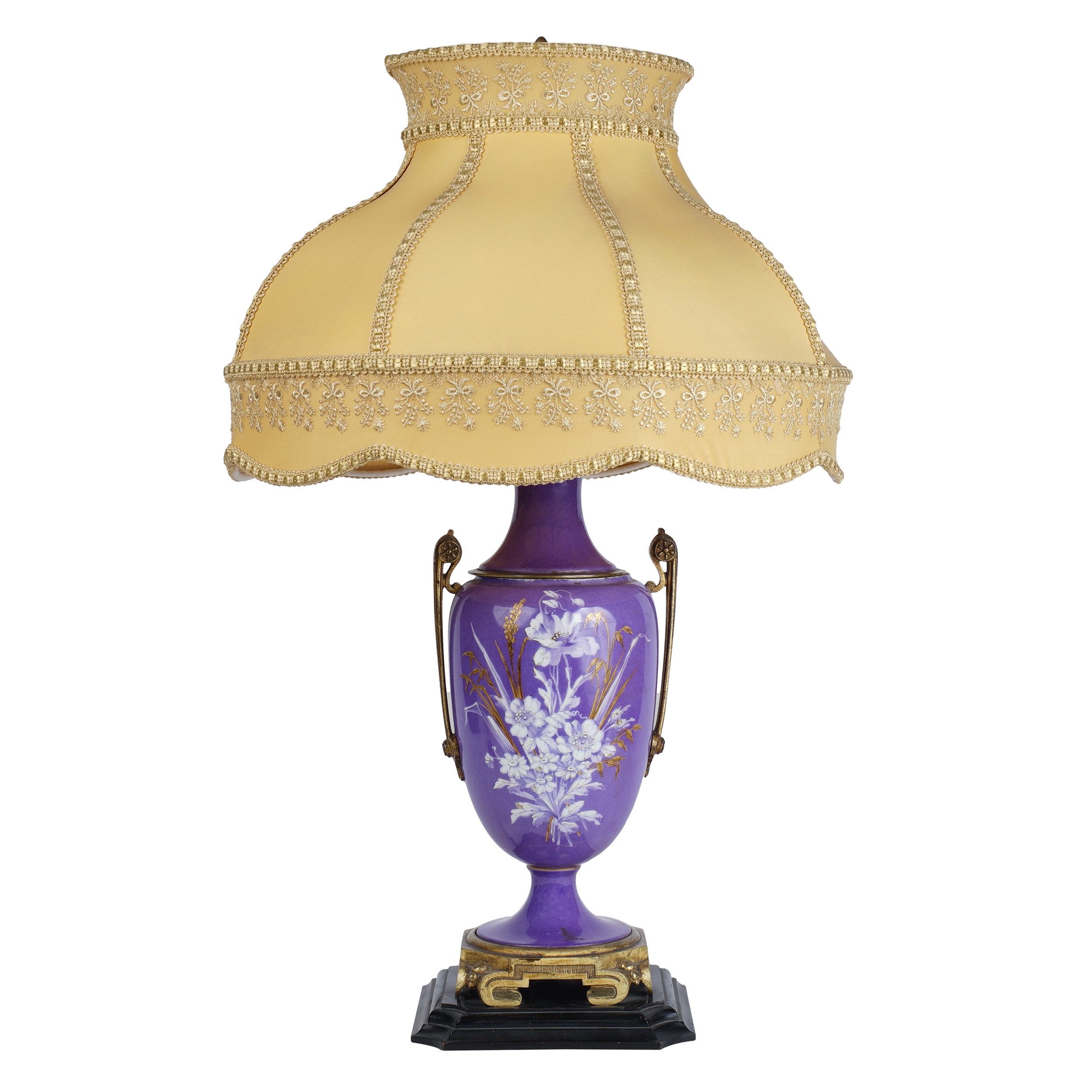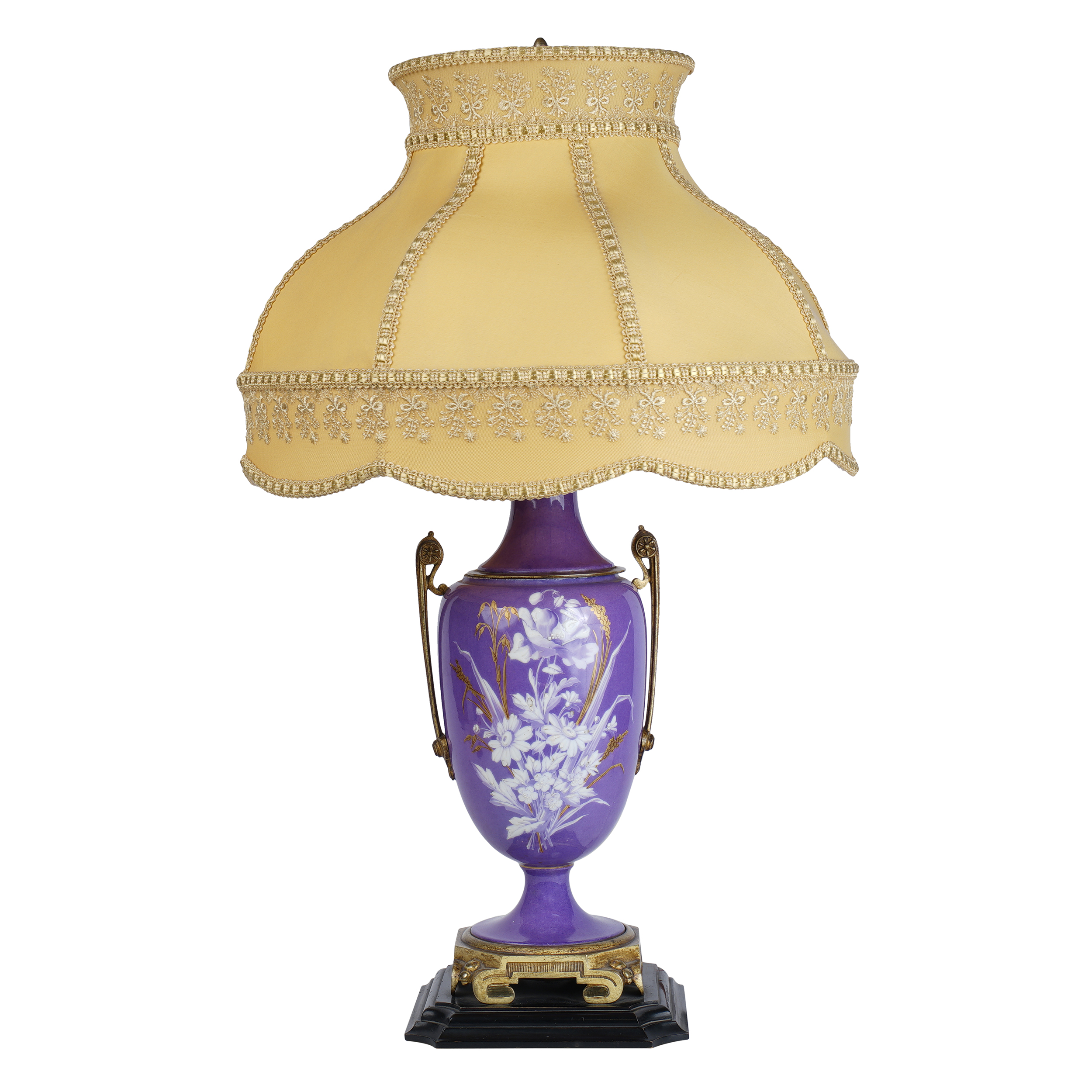 Фарфор, крытье фиолетовым, полихромная надглазурная цветочная роспись, бронза, золочение, текстиль, заказной абажур ручной работы.