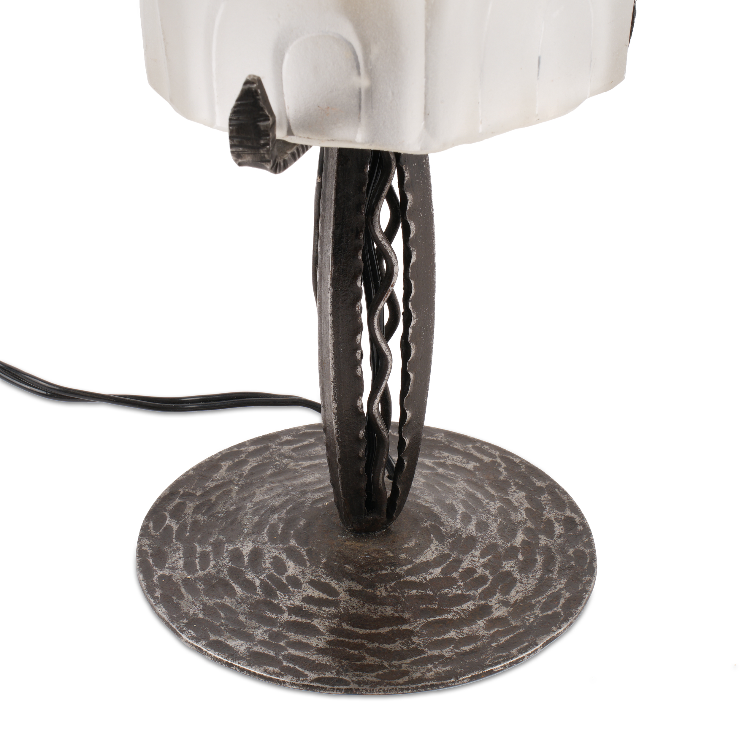 Настольный светильник в стиле Арт Деко. Металл, ковка, плафон из литого стекла с геометрическим рельефом, Франция, ок. 1925 года., высота - 29 см