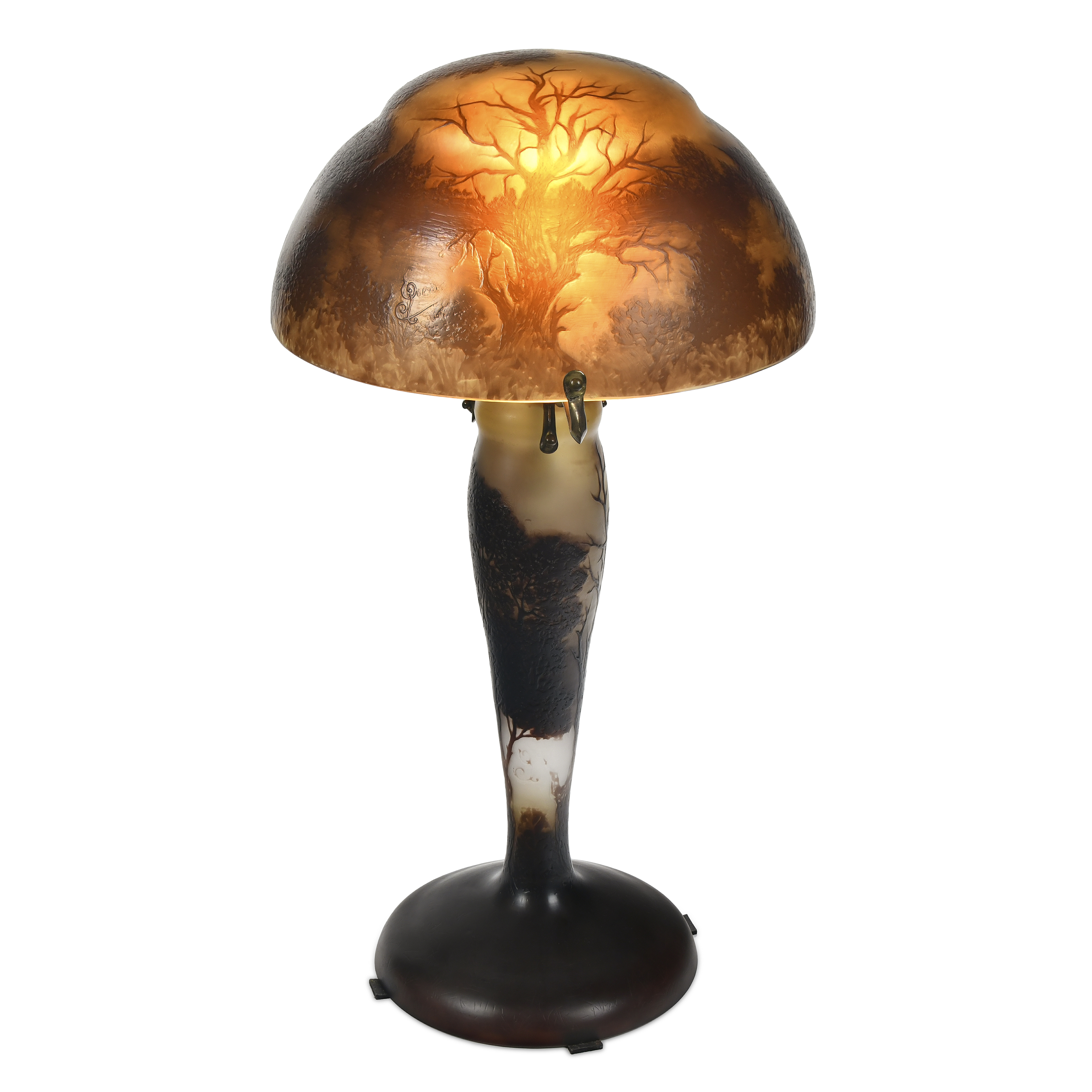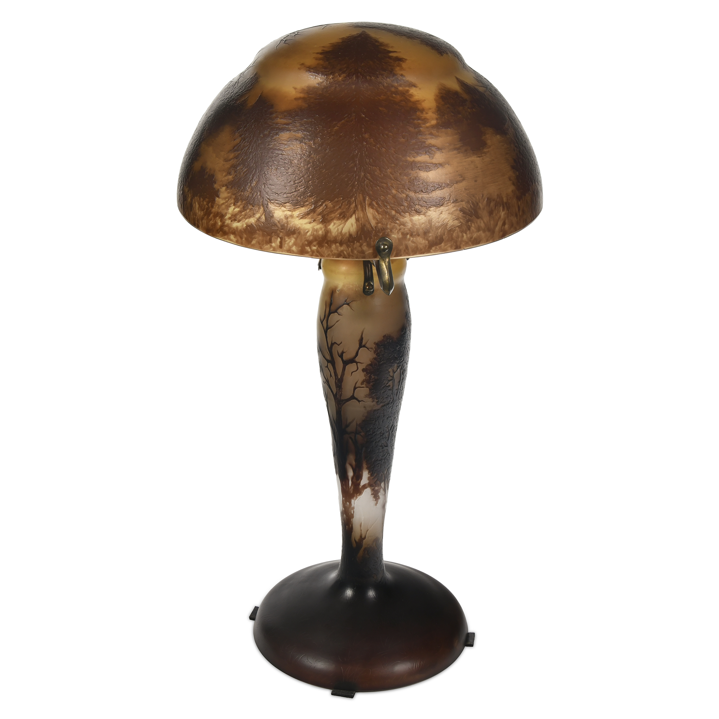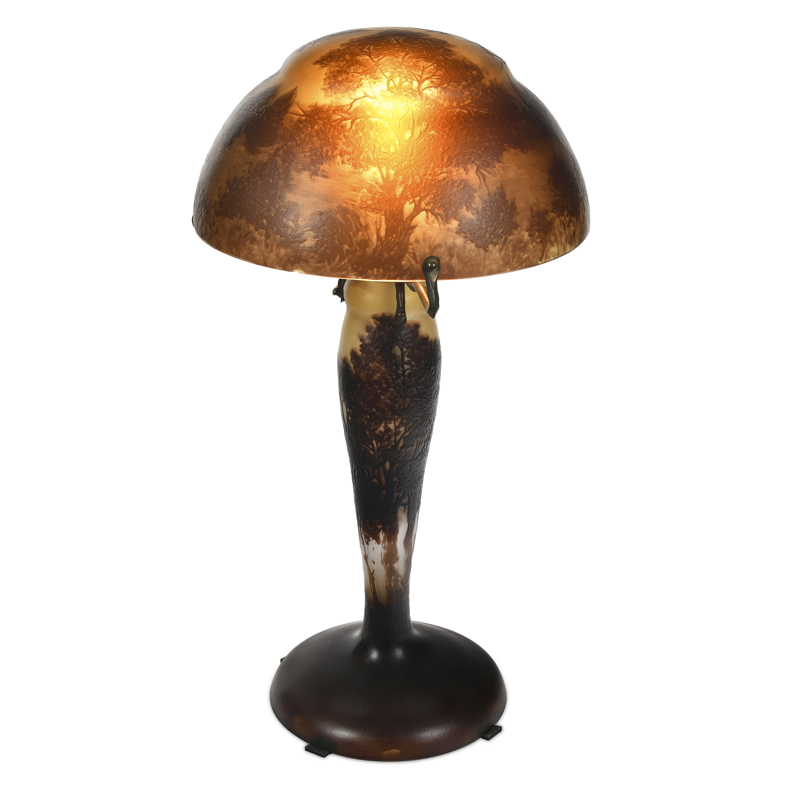 Декор лампы построен на мотиве лесного пейзажа, выполненного в технике камео-стекла: на нескольких слоях цветной массы травлением создается рельефный силуэт деревьев и ветвей. Переходы от насыщенного коричневого к мягким оранжевым оттенкам дают выразительный эффект рассветного или закатного света — при включении лампа усиливает эту градацию и создает характерное для нансийского стекла ощущение глубины пространства. Ножка выполнена в почти монохромной гамме, построенной на сочетании прозрачных и матированных участков. Грибовидная форма лампы, плавные переходы масс перекликаются с формами природного происхождения, что было одним из ключевых принципов декоративного искусства в Лотарингии начала XX века.