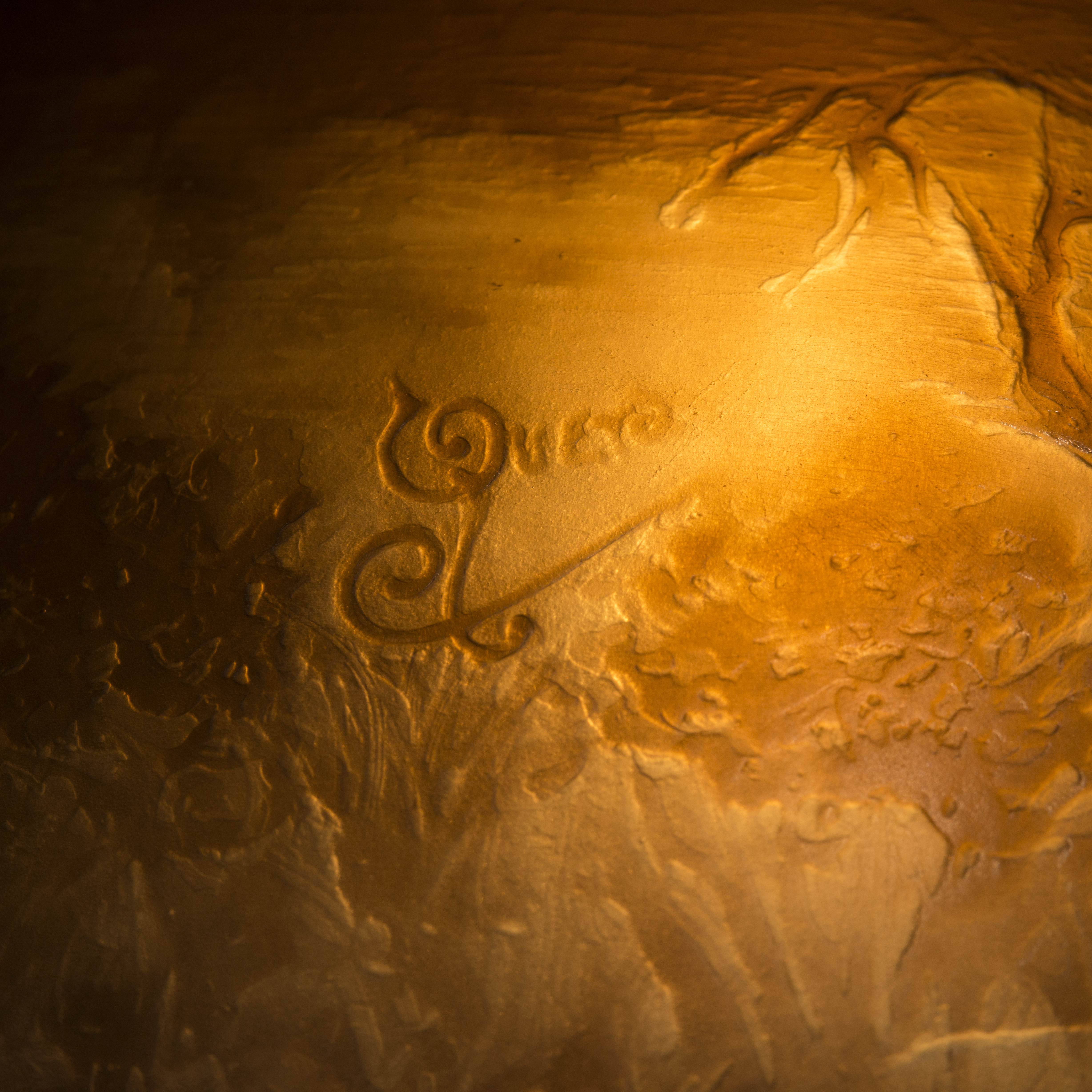 Настольная лампа «Лесной пейзаж» выполнена во Франции в 1920–1930-е годы и относится к произведениям лотарингской школы, работающей в традиции техники, развитой Эмилем Галле и мастерами Школы Нанси. Плафон и основание изготовлены из многослойного цветного стекла в оттенках коричневого, охры и оранжевого; декор выполнен методом травления и последующего матирования. На плафоне присутствует травленая сигнатура «QUETO C», на ножке — «QC», характерная для ряда мастерских Лотарингии, работавших по мотивам наследия Галле. Конструктивные детали лампы дополнены латунной арматурой. Высота — 61 см, диаметр плафона — 32,5 см.