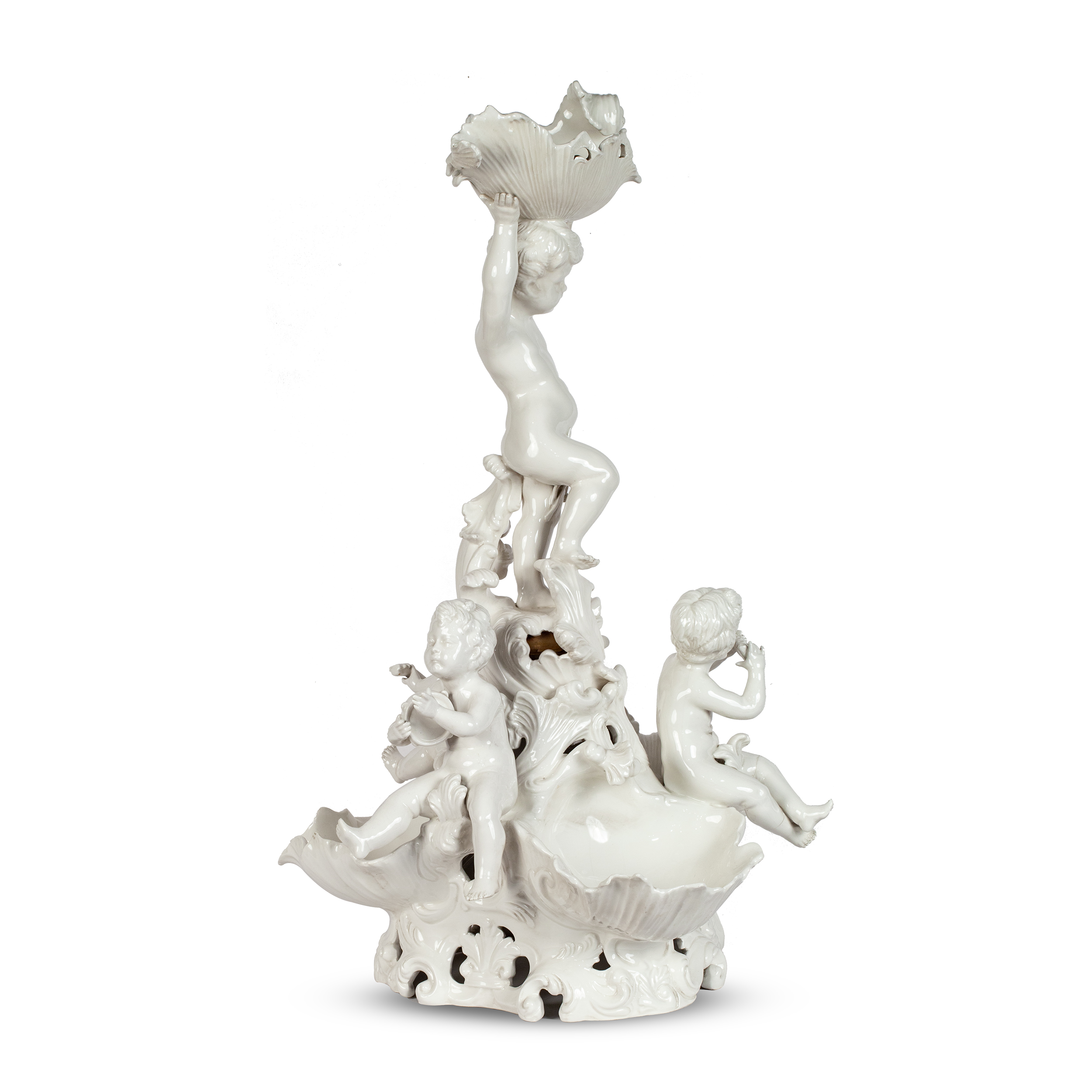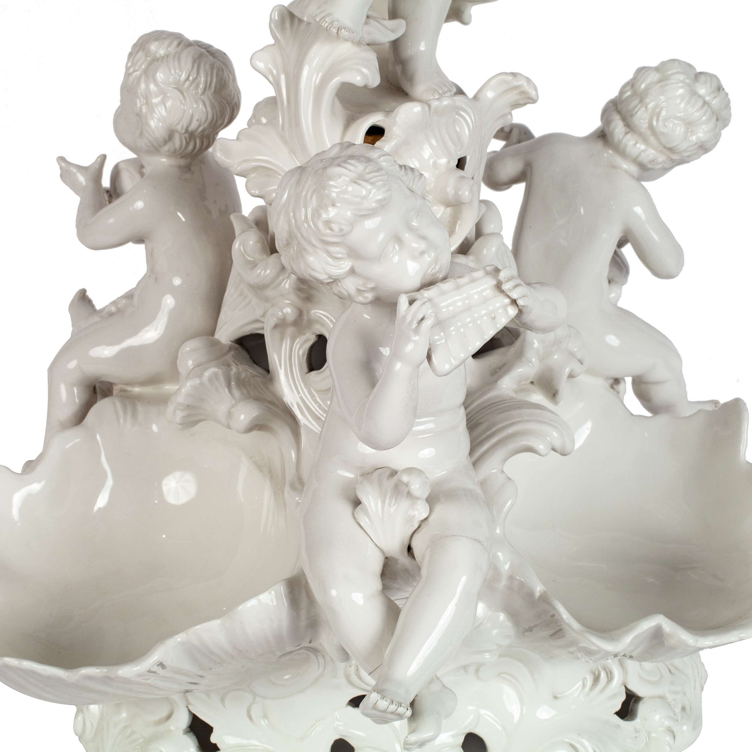 Центрпис со скульптурными изображением трех херувимов, играющих на музыкальных инструментах, дополнением композиции служит фигура мальчика, держащая морскую раковину.