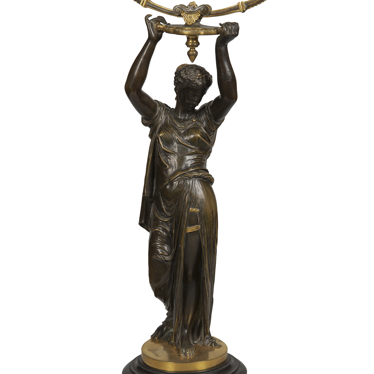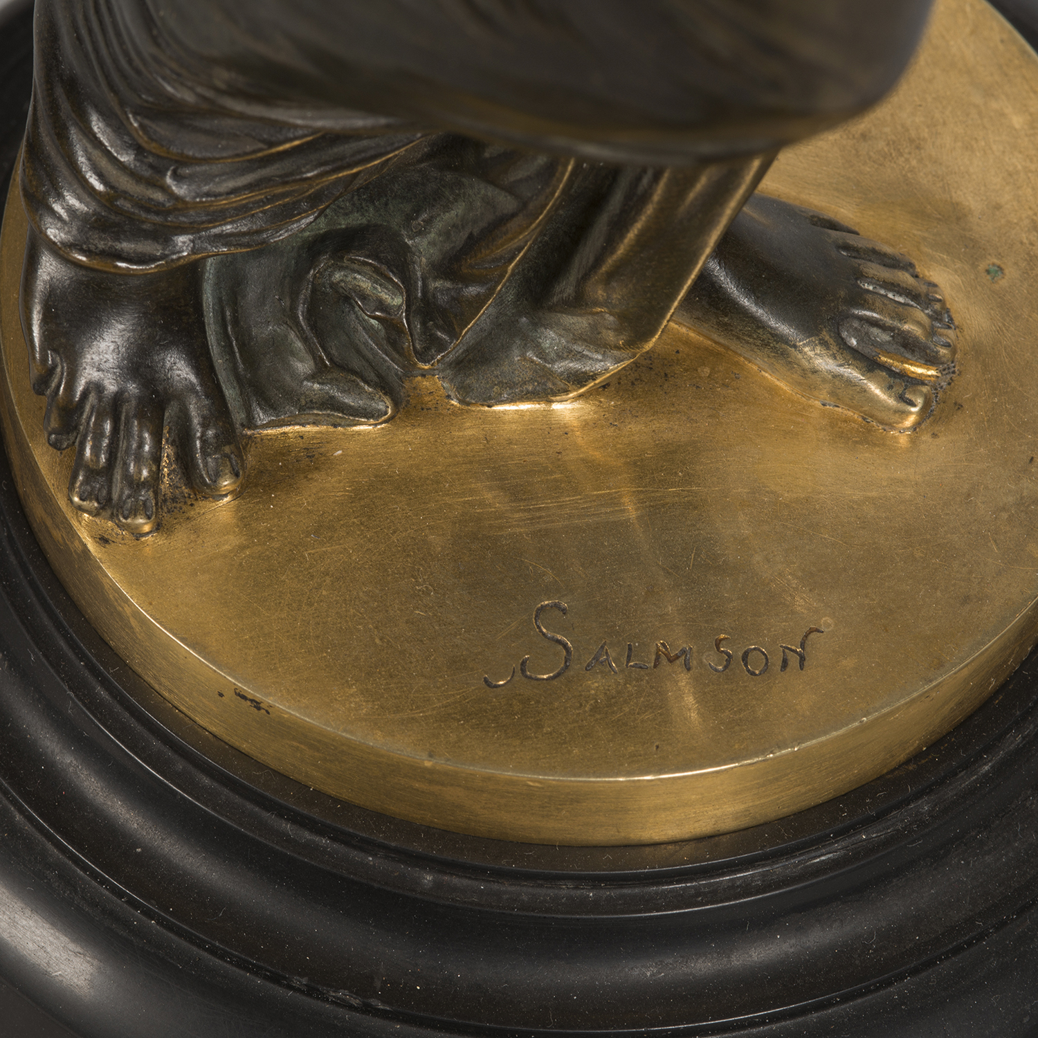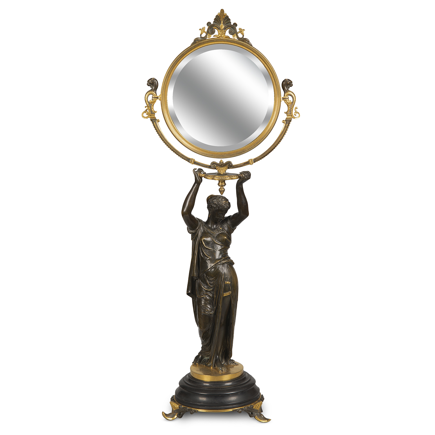 Зеркало для туалетного столика в стиле историзм. Бронза, литье, патинирование, монтировка, зеркальное стекло с фацетом, основание черный мрамор, клейма: «G&S» под звездой, в литье воспроизведение подписи мастера «Salmson», автор модели – французский скульптор Жан Жюль Салмсон (Jean Jules Salmson, 1823-1902), Франция, конец XIX века, размеры: высота 64 см, диаметр основания 18 см