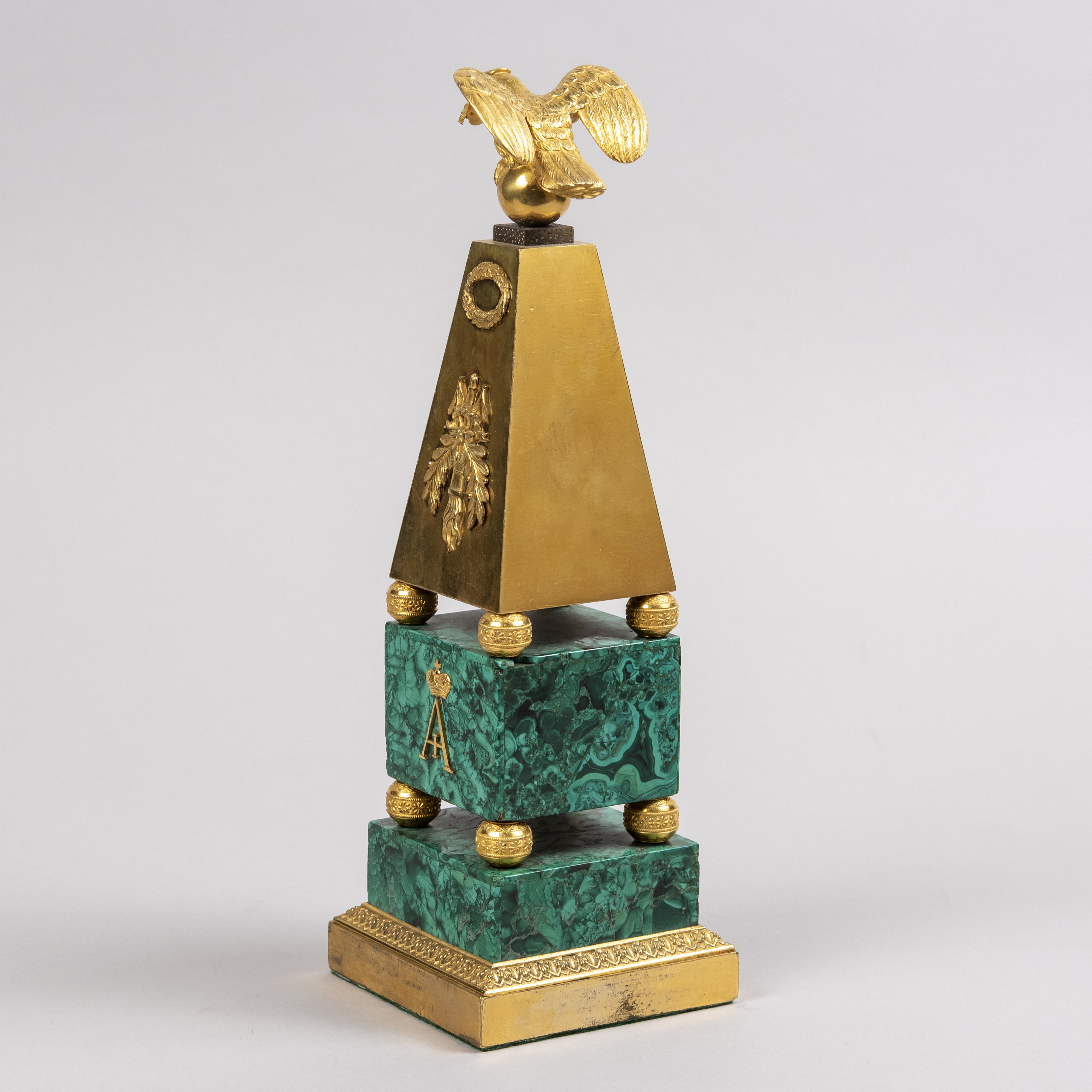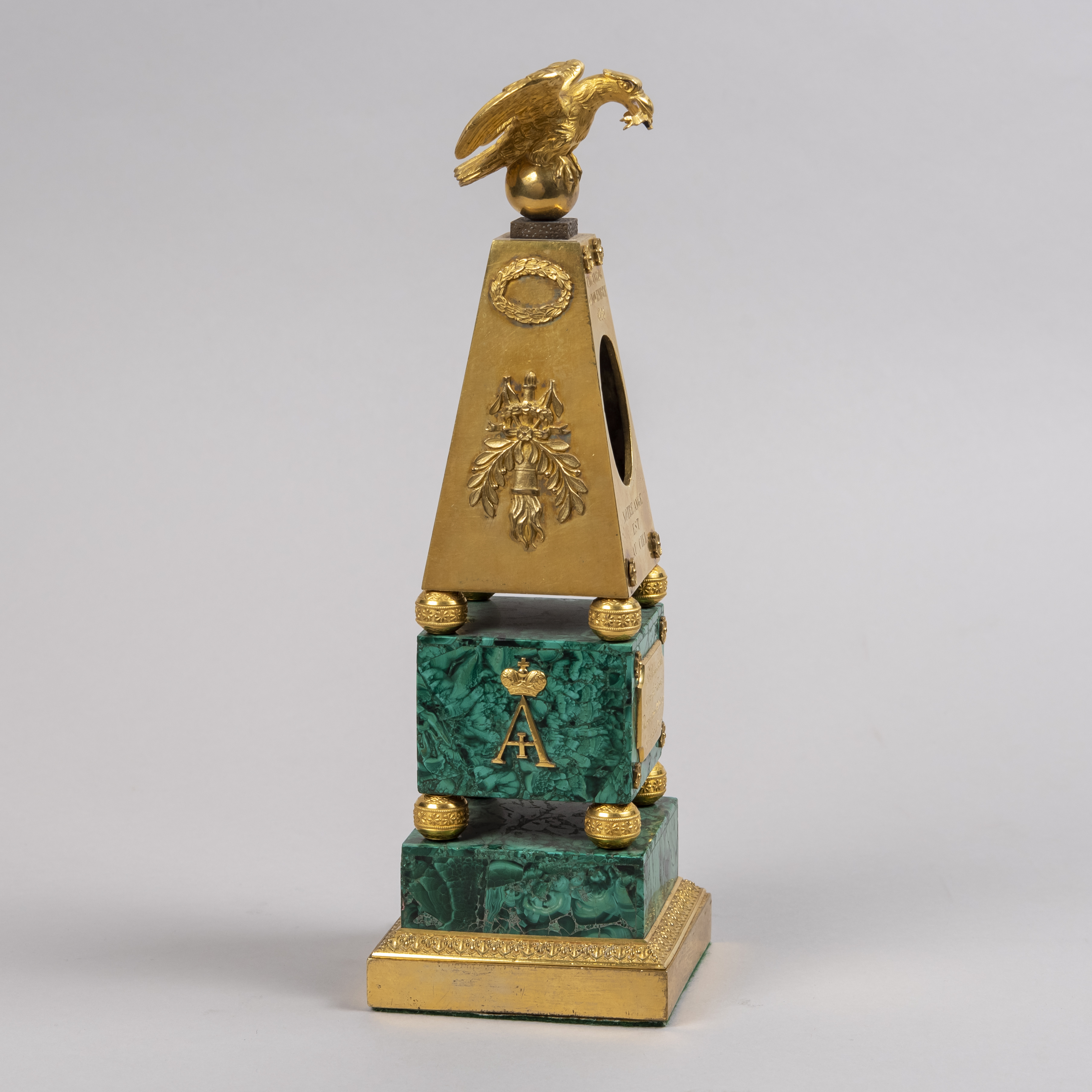 Подобный настольный, выполненный в бронзе обелиск-реликварий с гипсовым портретом Александра Первого хранится в собрании ГМЗ «Царское Село».