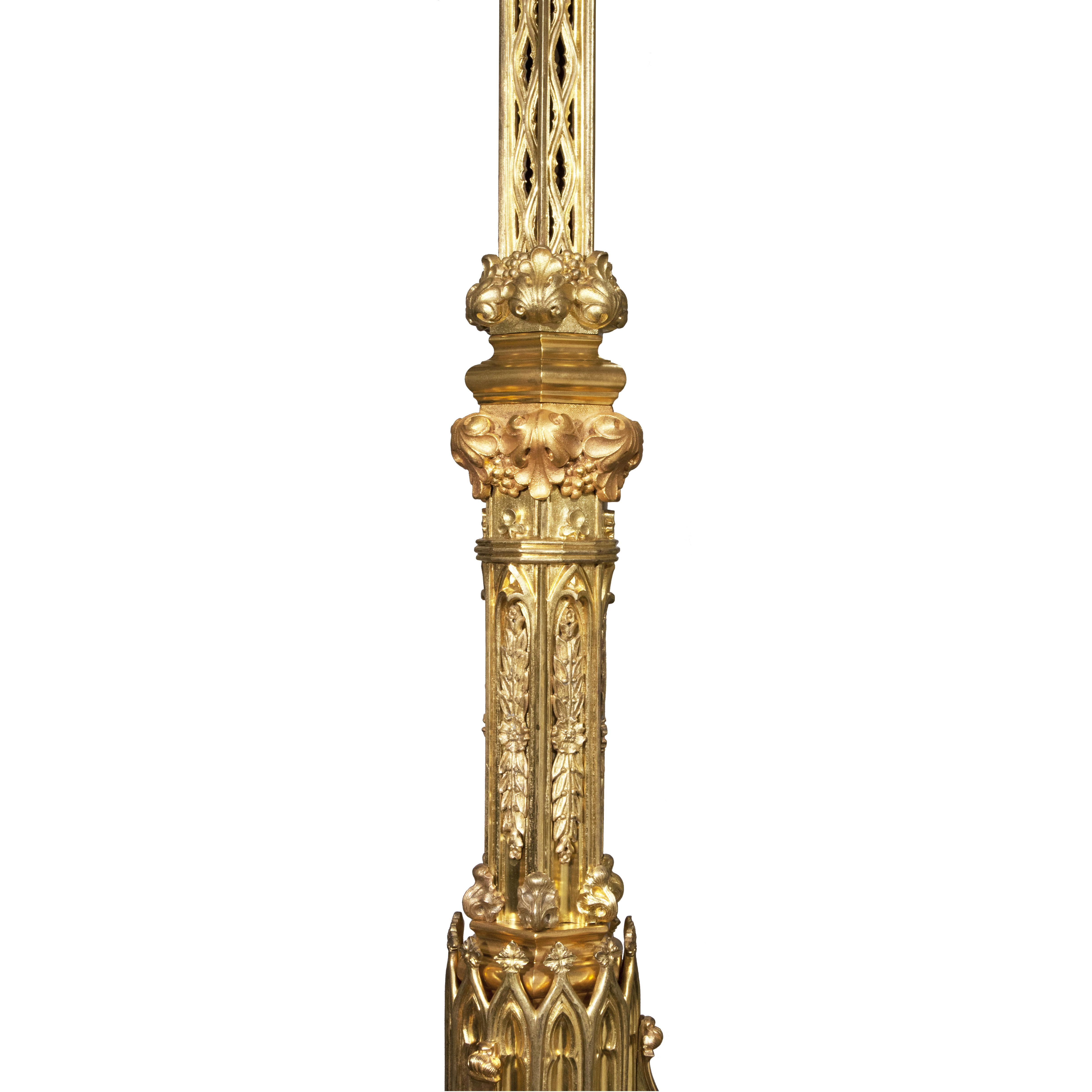 Торшера на 13 свечей с основаниями, декоративно решенными в виде порталов готического собора. Бронза, литье, чеканка, плафоны бесцветного стекла, выдувание, прессование, резьба; высота - 205 см, диаметр по рожкам – 70 см, высота плафона - 25 см