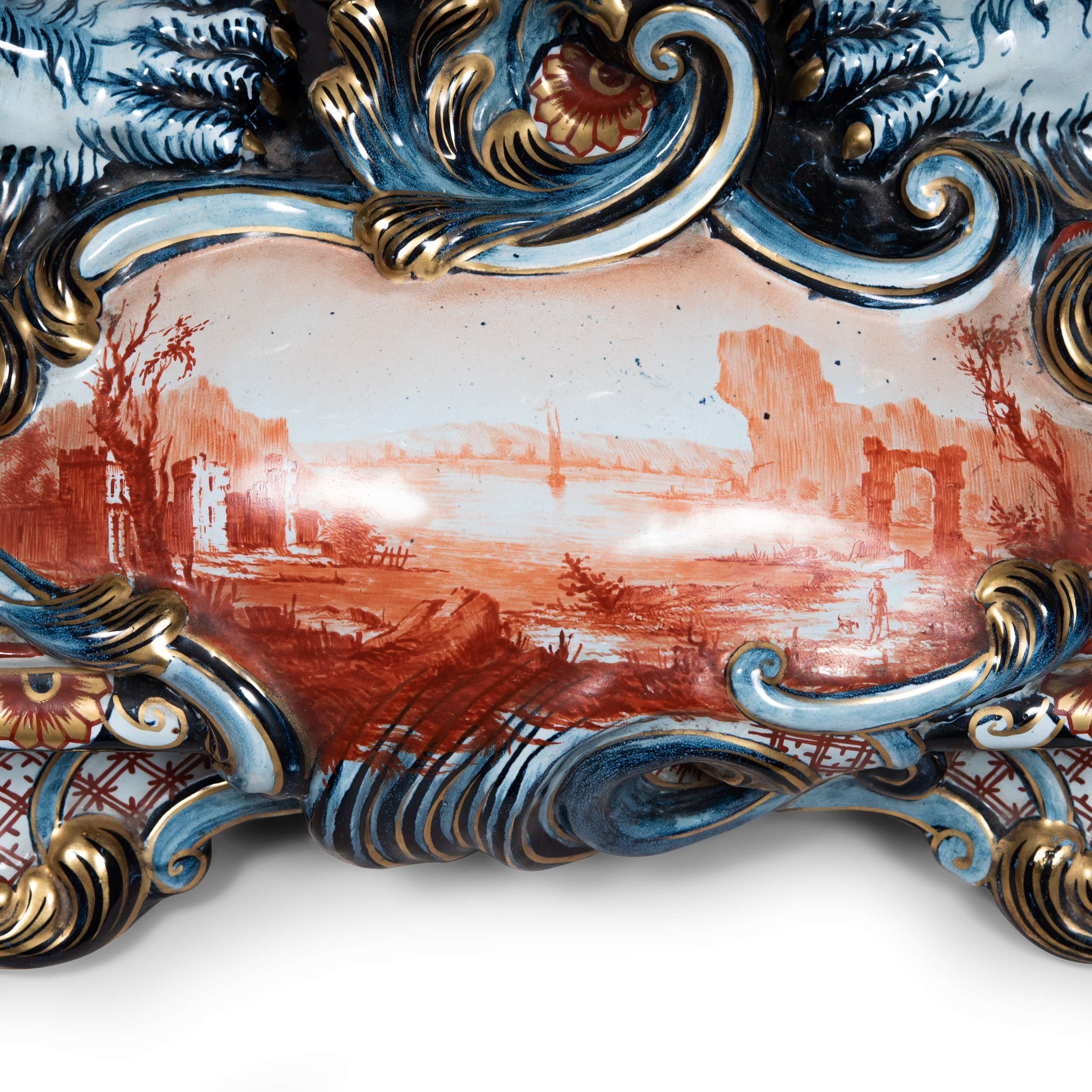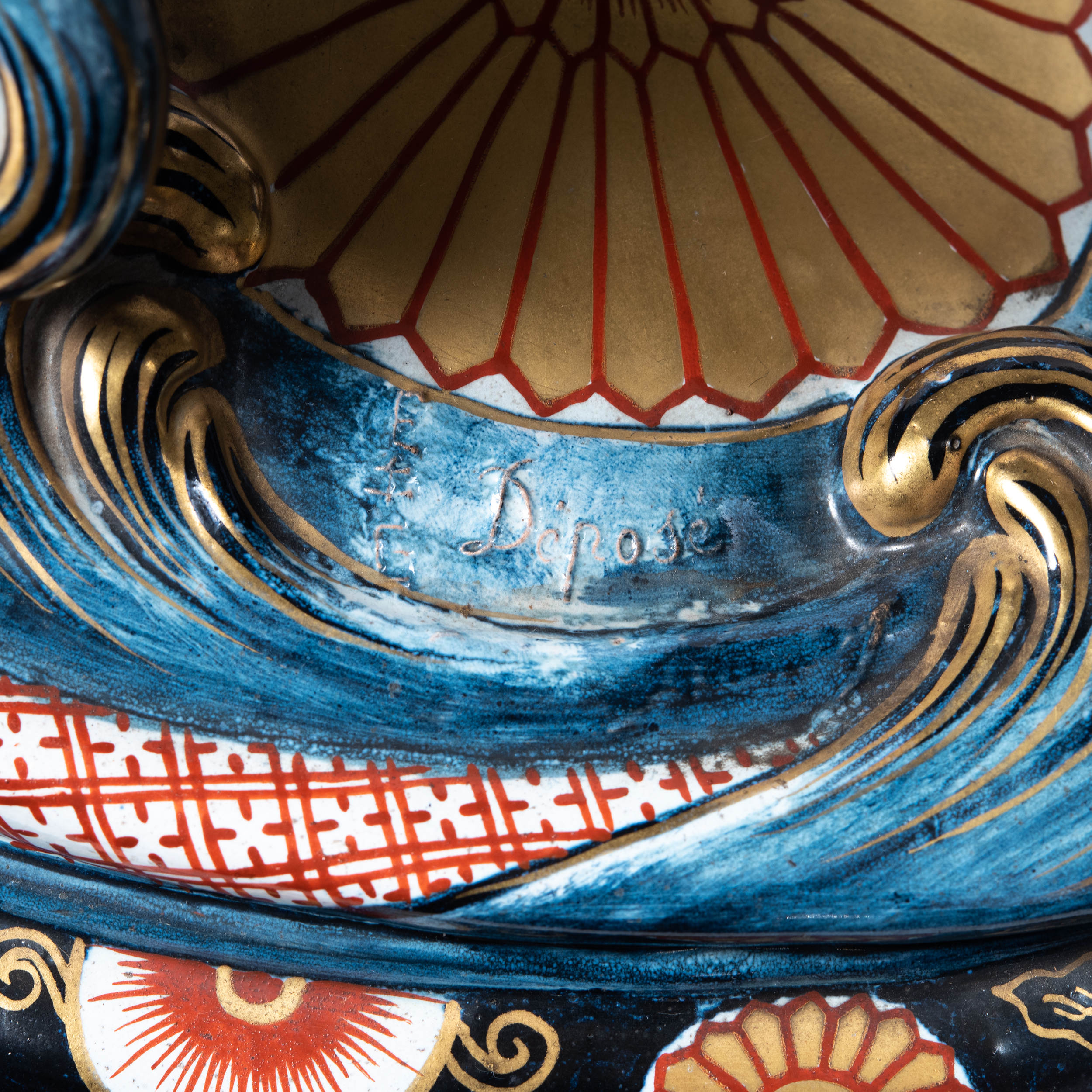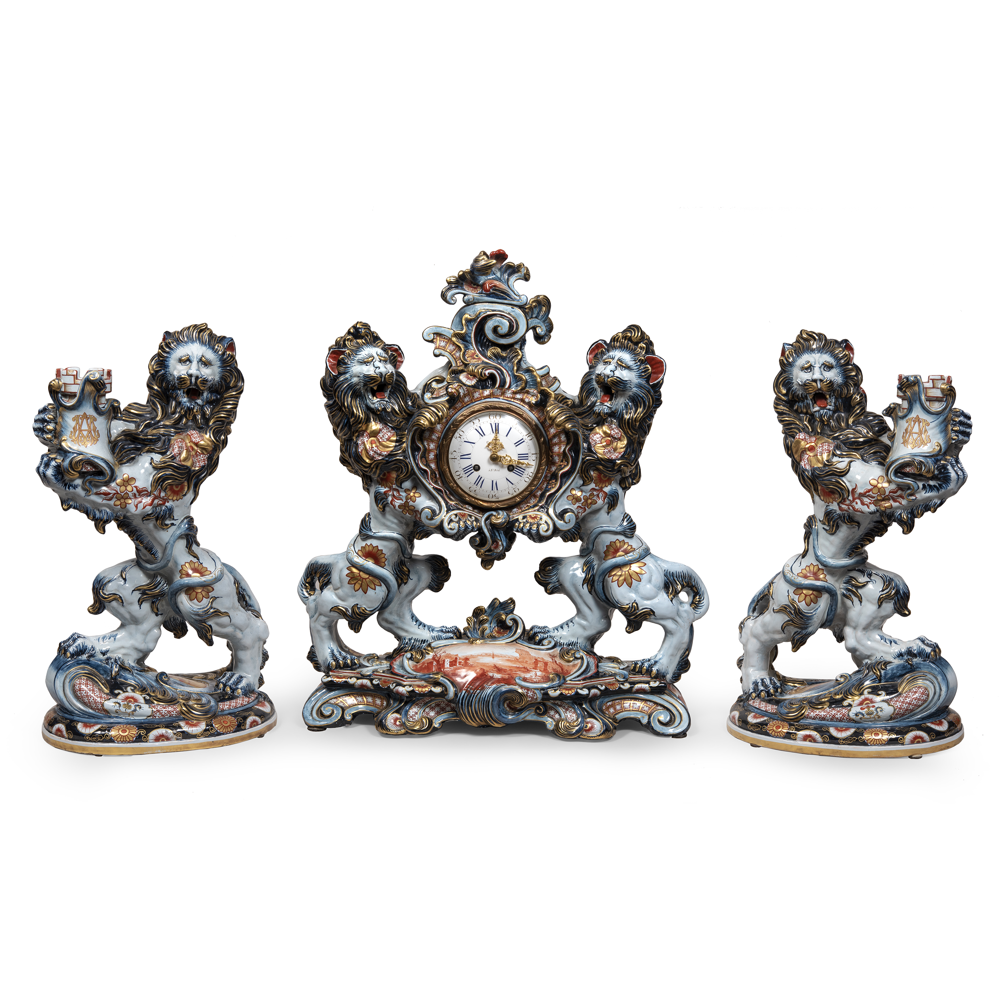 Каминные часы с парой канделябров. Керамика, полихромная роспись, глазурь, подпись на основании канделябров на лицевой стороне «A. Muller/ Raon L.Etape», подпись на завитке постамента часов на задней части «E. Galle Nancy/ Raon L.Etape 1885»; часовой механизм фирмы «GRELOT», эмалевый циферблат с римскими цифрами часов и делением на минуты, фигурные золоченые стрелки, стекло; Франция, Нанси, 1885 год, размер (в/ш/г): 60 х 58 х 23 см, высота канделябра – 49 см.