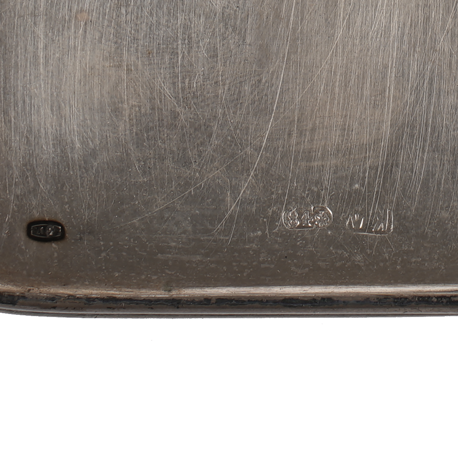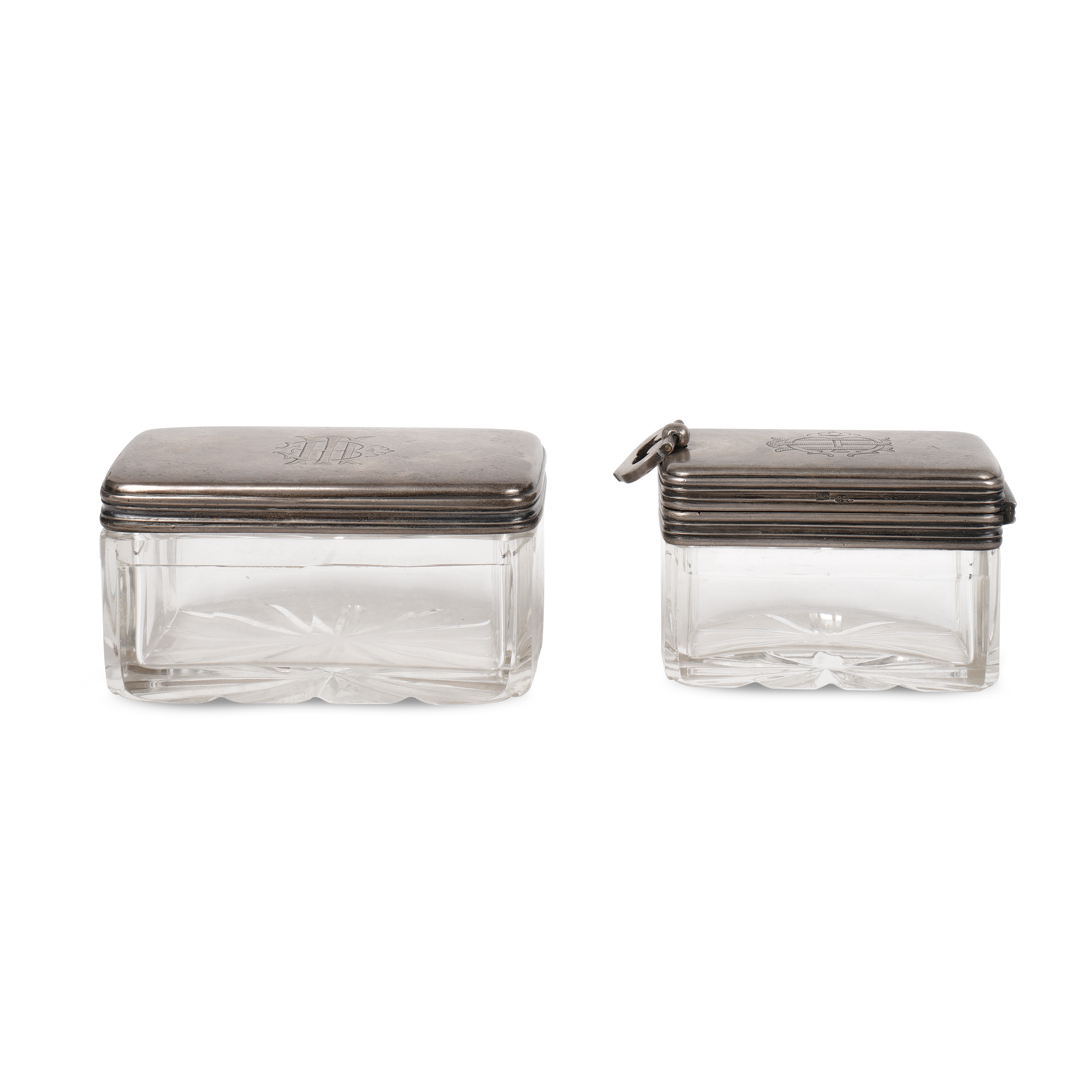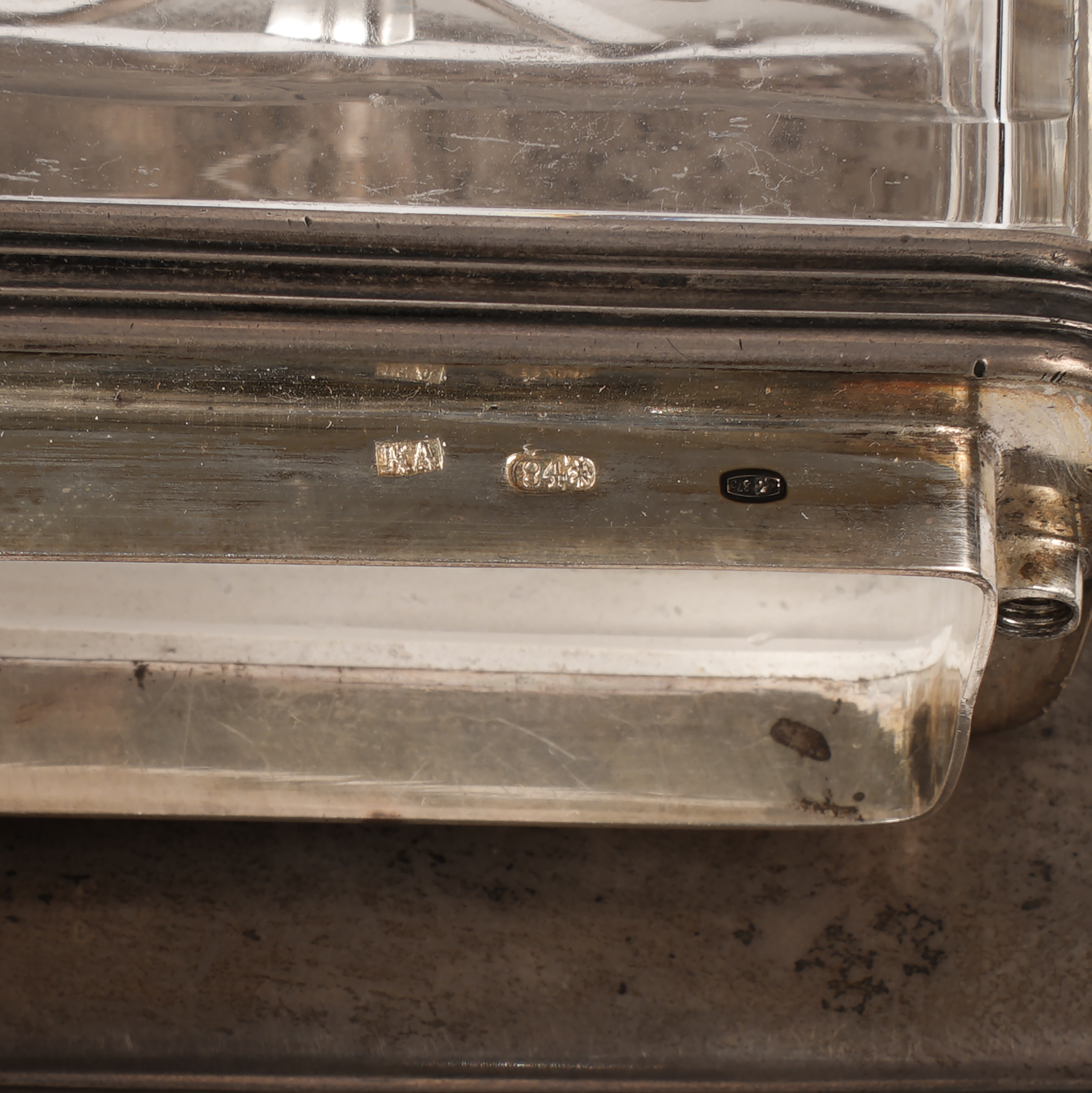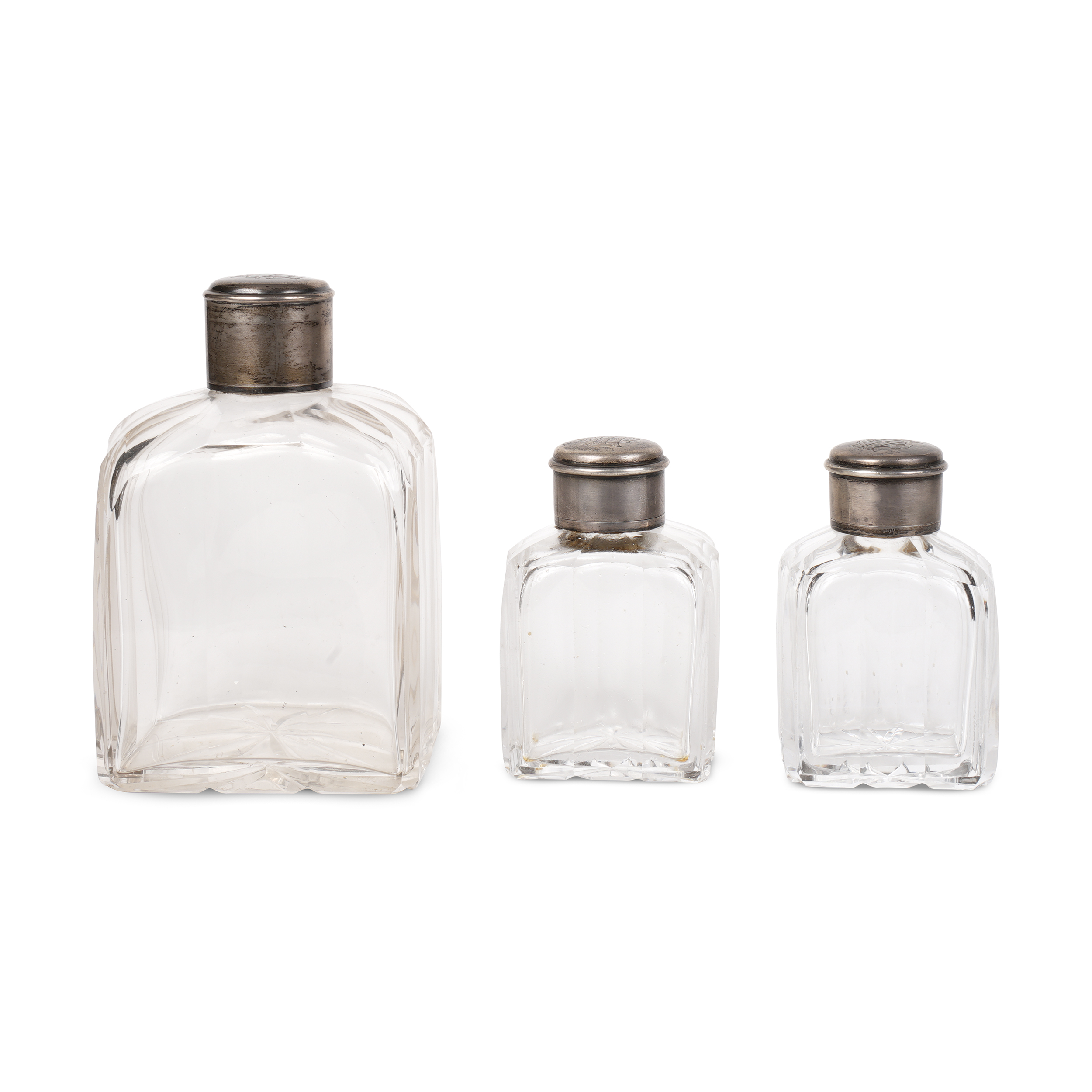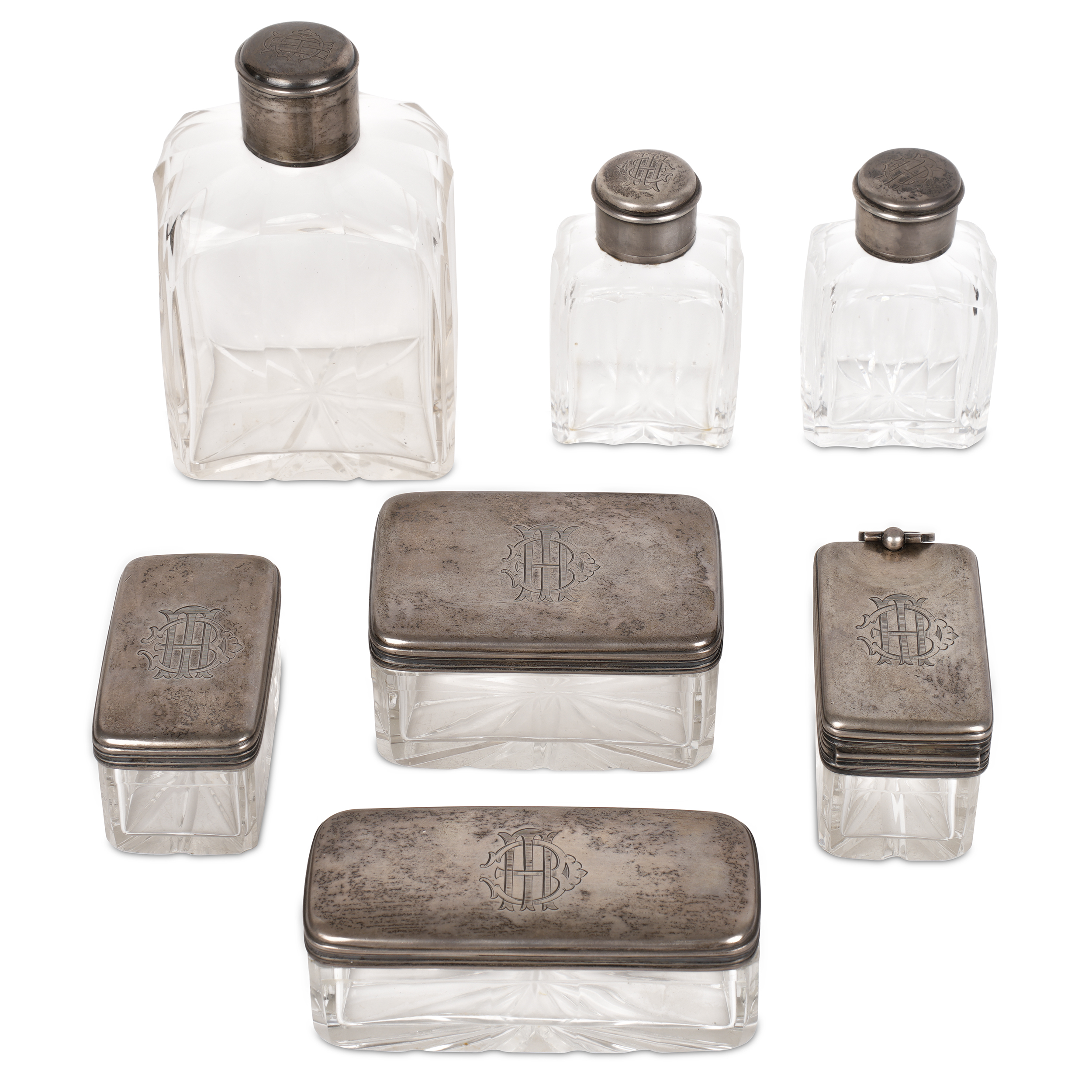 Состоит из 7 предметов. Серебро, литье, монтировка, монограмма, стекло, гранение, клейма: 84 пробы, герб города Санкт-Петербурга - «Два якоря и скипетр», клеймо «К.А» фабрики Кирилла (Карла) Федоровича Альбрехта, серебряного дела мастера (1874 - 1898), «ФР», переопробация 875 пробы. Россия, Санкт-Петербург, конец XIX века, размер (в/ш/г): 8,5 х 5,5 х 4 см; 14 х 8 х 6,5 см; 4,5 х 9 х 6 см; 4,5 х 10,8 х 4,5 см; 4,5 х 7 х 3,5 см; 4,5 х 7 х 4 см. общий вес: 1 755,6 гр.