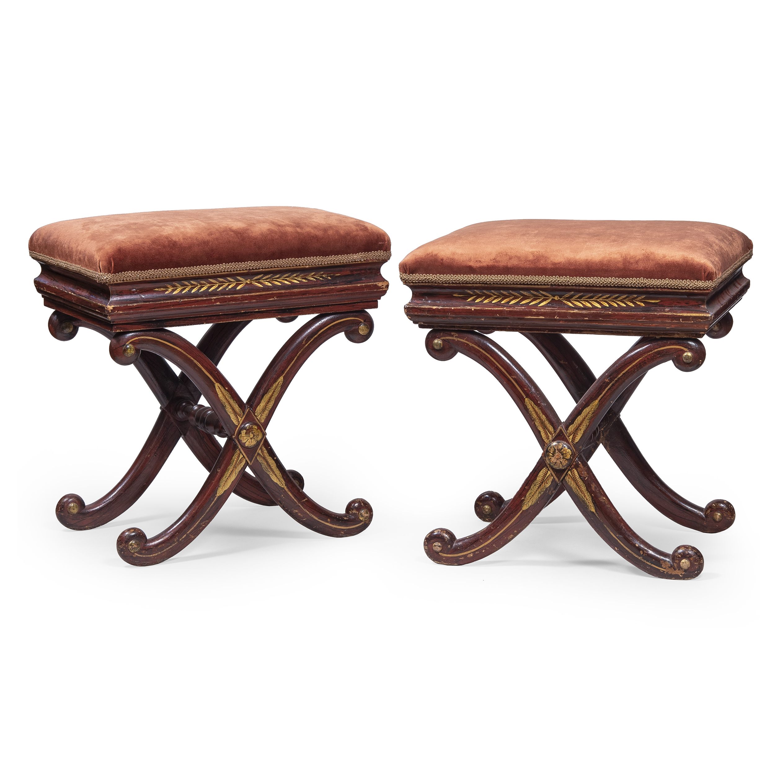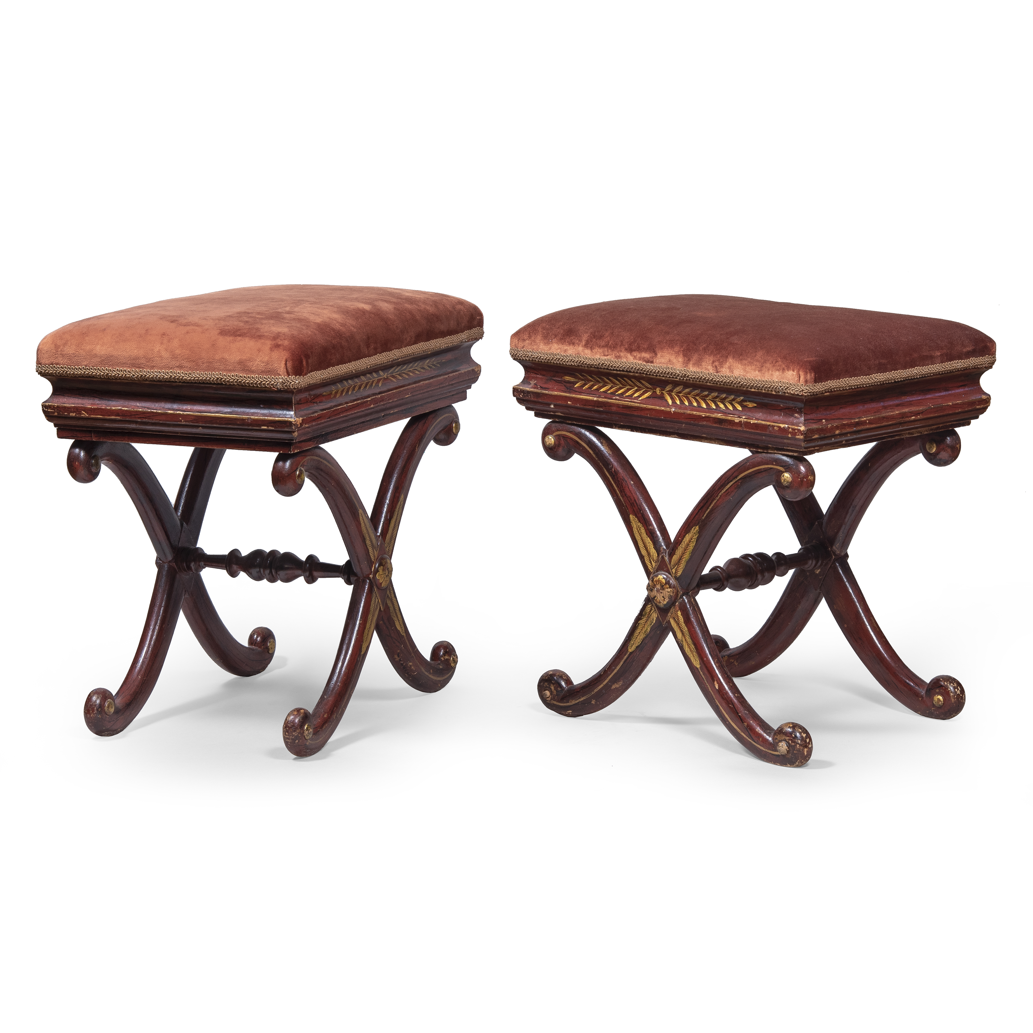 Табурет-банкетка с Х-образным основанием и мягким сиденьем, обтянутых бархатом. Дерево, тонировка, золочение, бордовый бархат, Европа, XIX век, размеры: высота 48 см; длина 45 см; ширина 35 см.