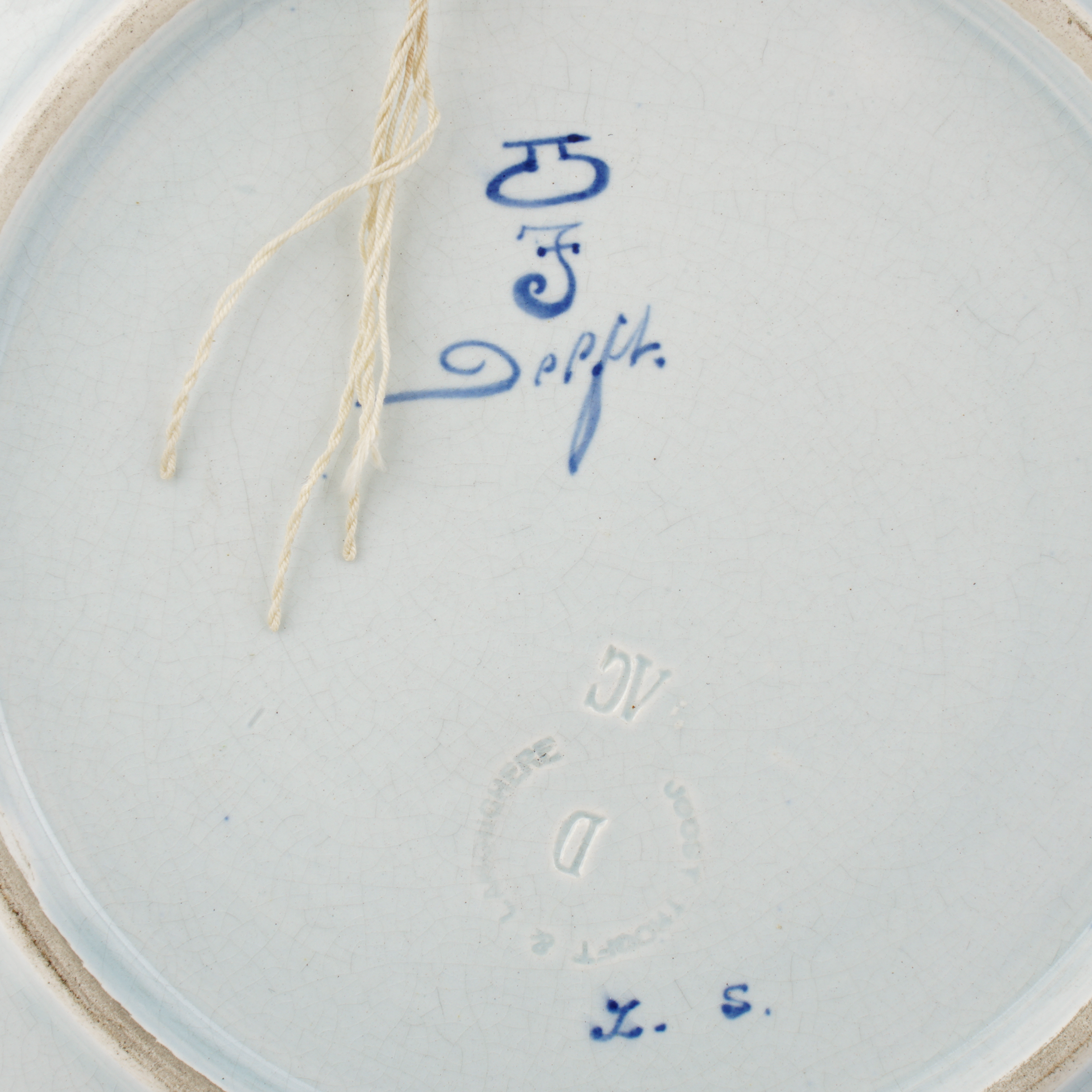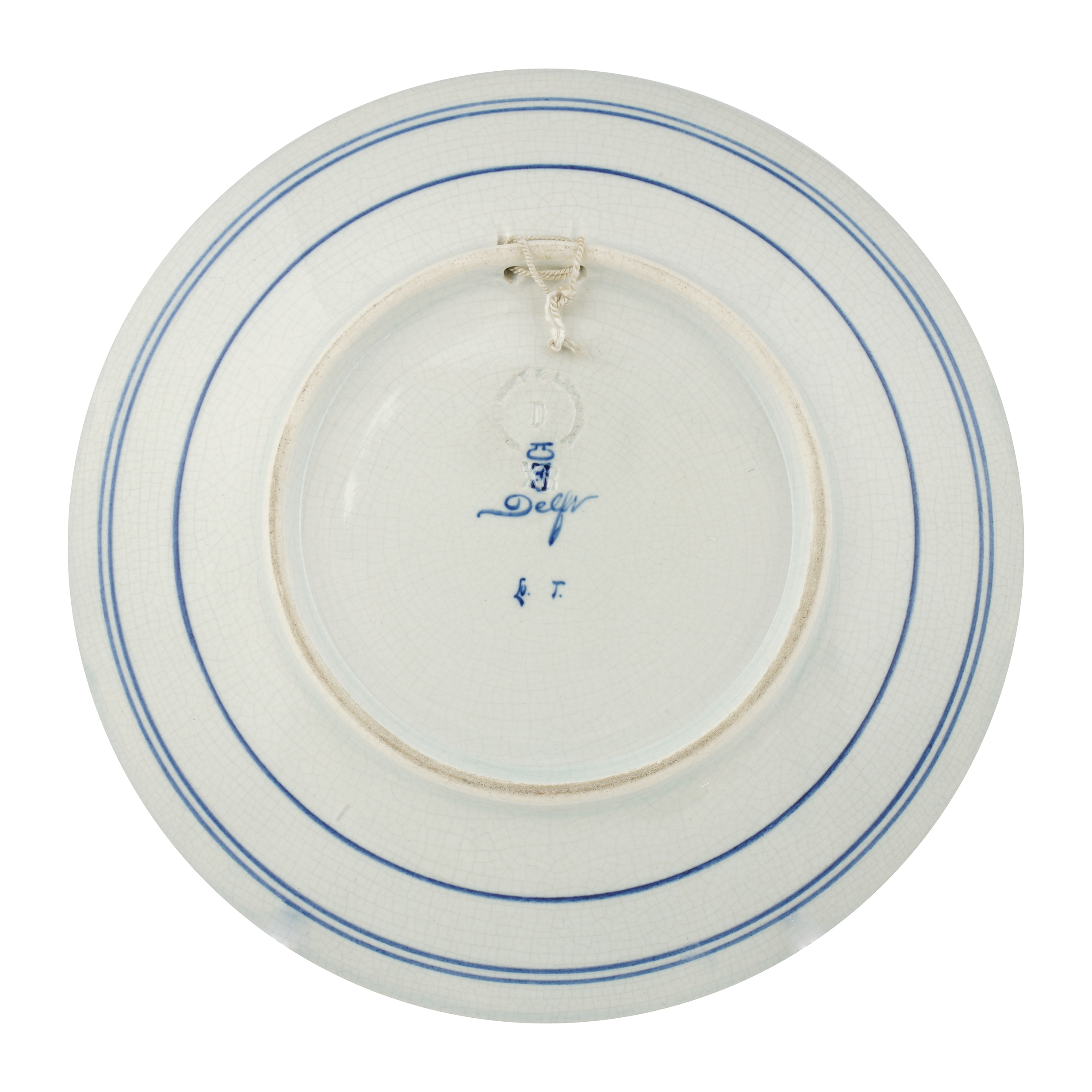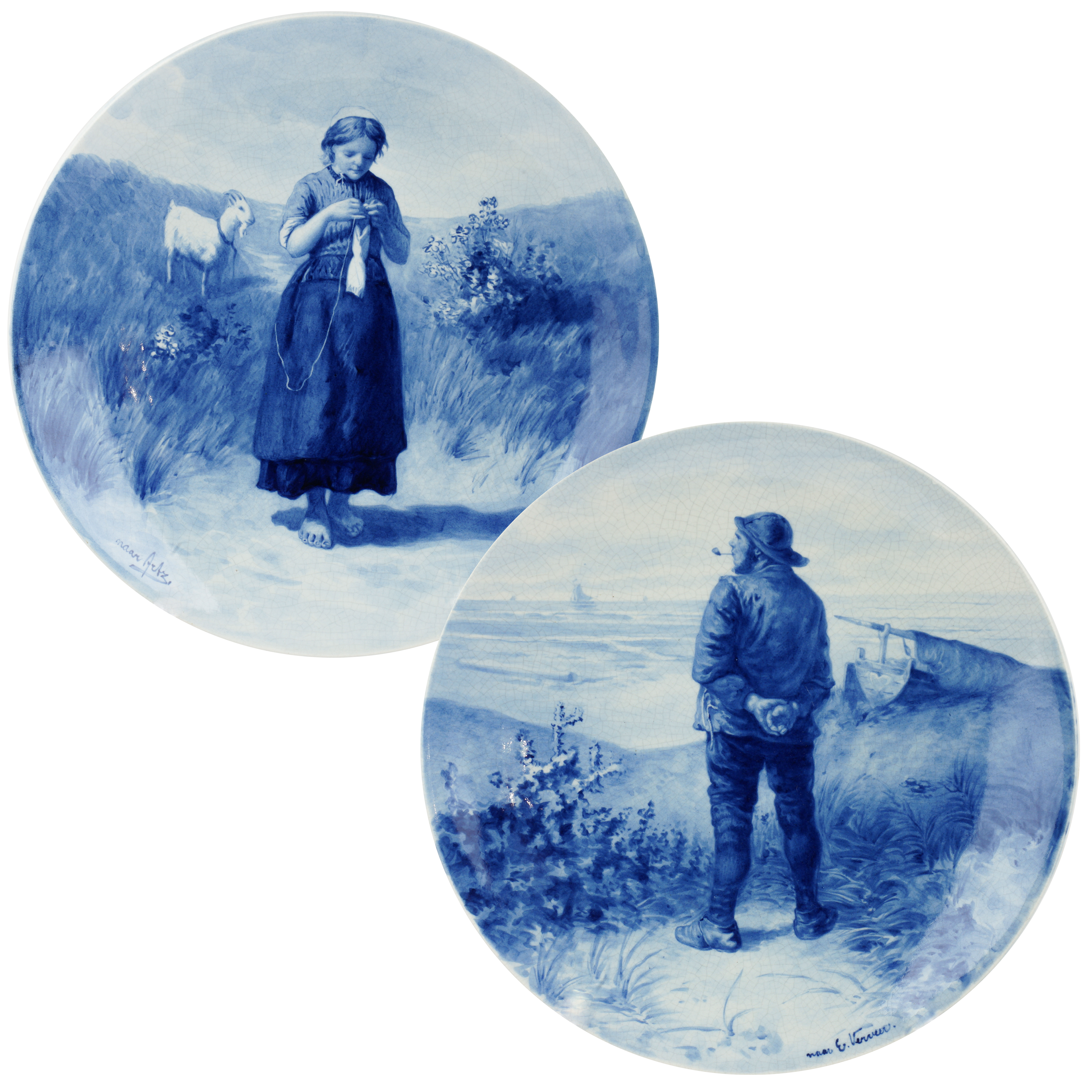 Фаянс, подглазурная роспись, клеймо в тесте «Joost Thooft & Labouchere», кобальтом «Delft» с монограммой «Z.S», на тарелке с изображением девочки подпись внизу справа «naar Artz», на тарелке с изображением рыбака - «naar E. Verveer», делфтская фабрика «Тоофт и Лабушер», Нидерланды, 1922 - 1925 годы, диаметр - по 24 см