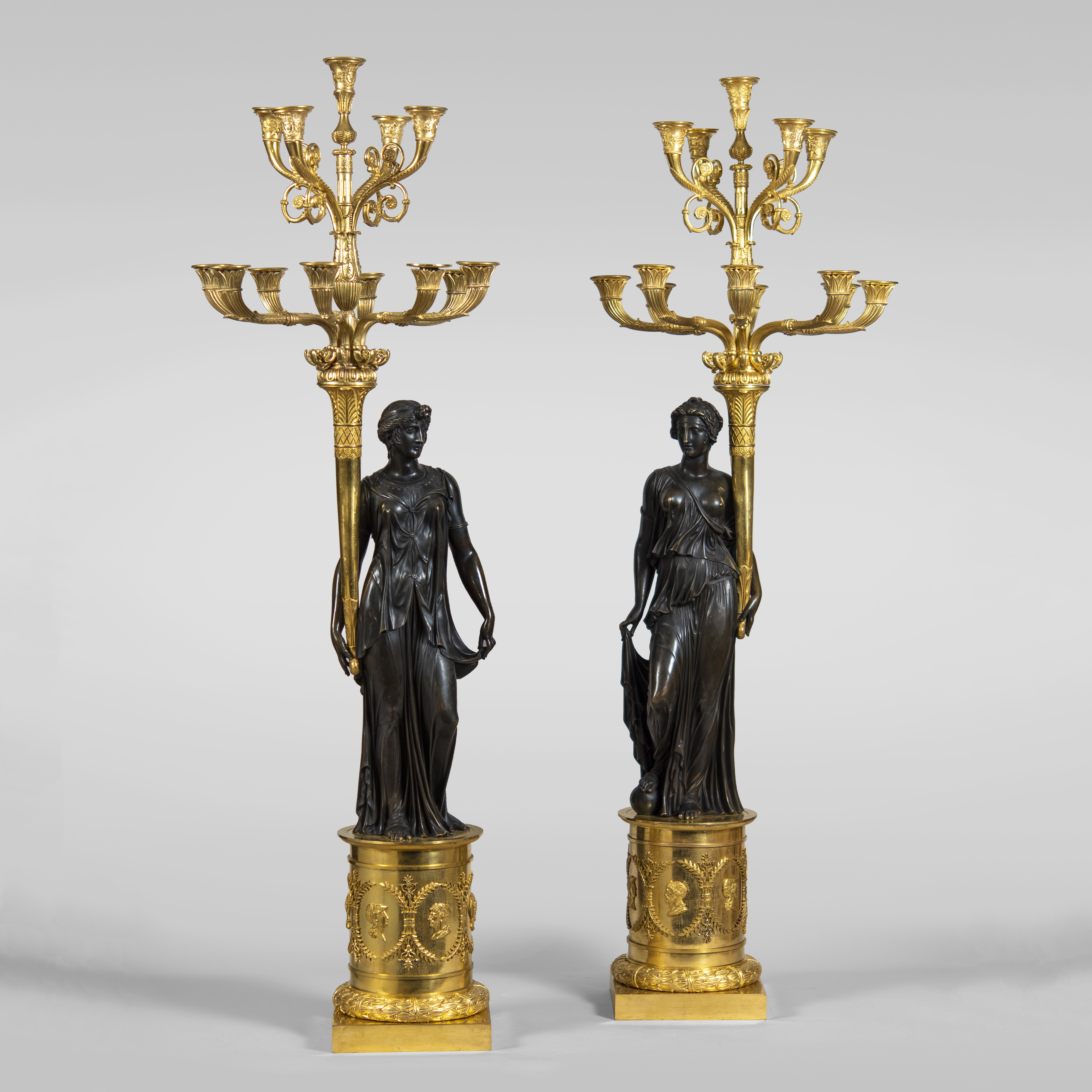 Модели канделябров были разработаны П.-Ф. Томиром в период наивысшего творческого расцвета и упоминаются в подряде 1807 года для Garde-Meuble – собрания мебели для императорских дворцов. Изображение одного из канделябров встречается в альбоме рисунков 1817 года, лично отправленных П.-Ф. Томиром королю Швеции К.Ю. Бернадоту.