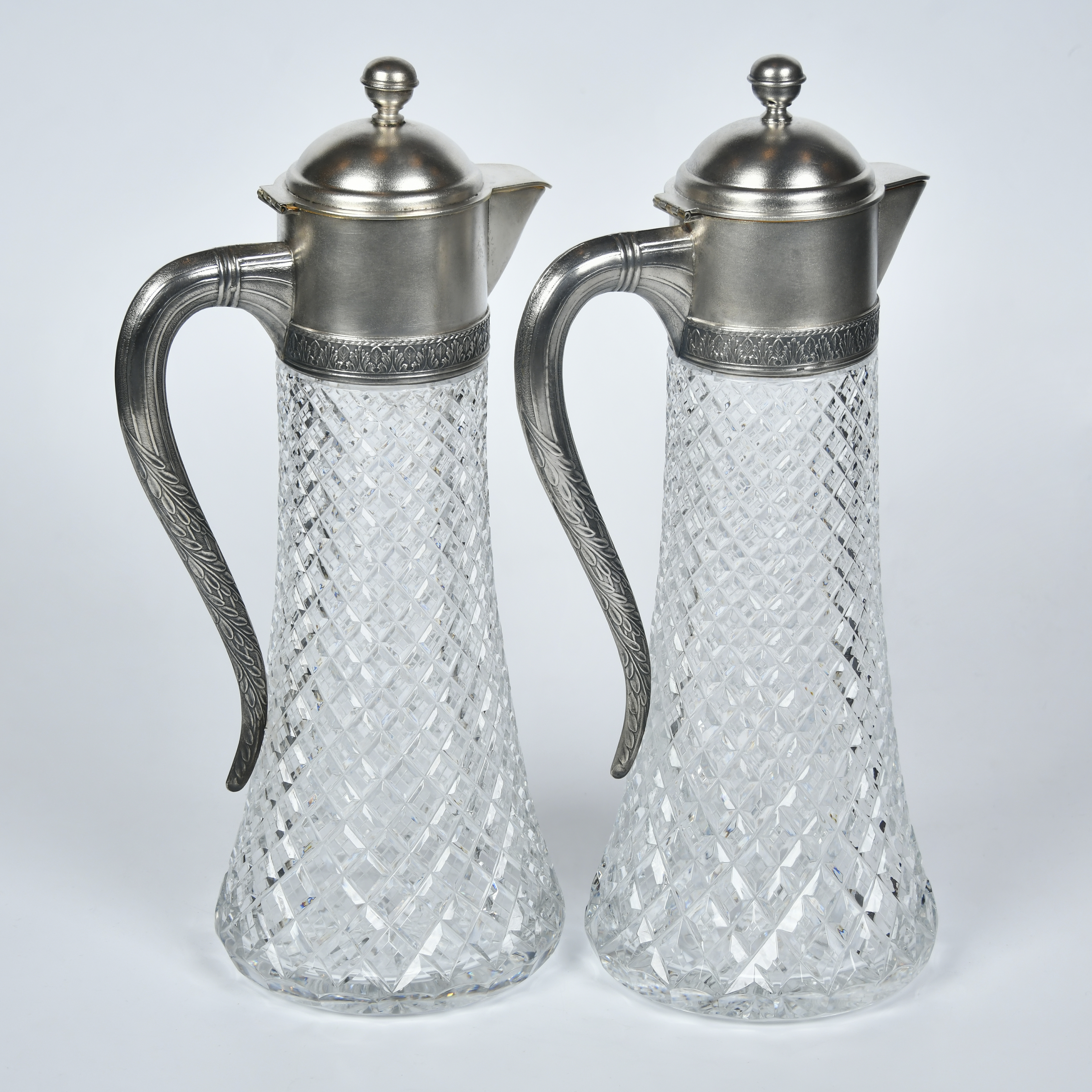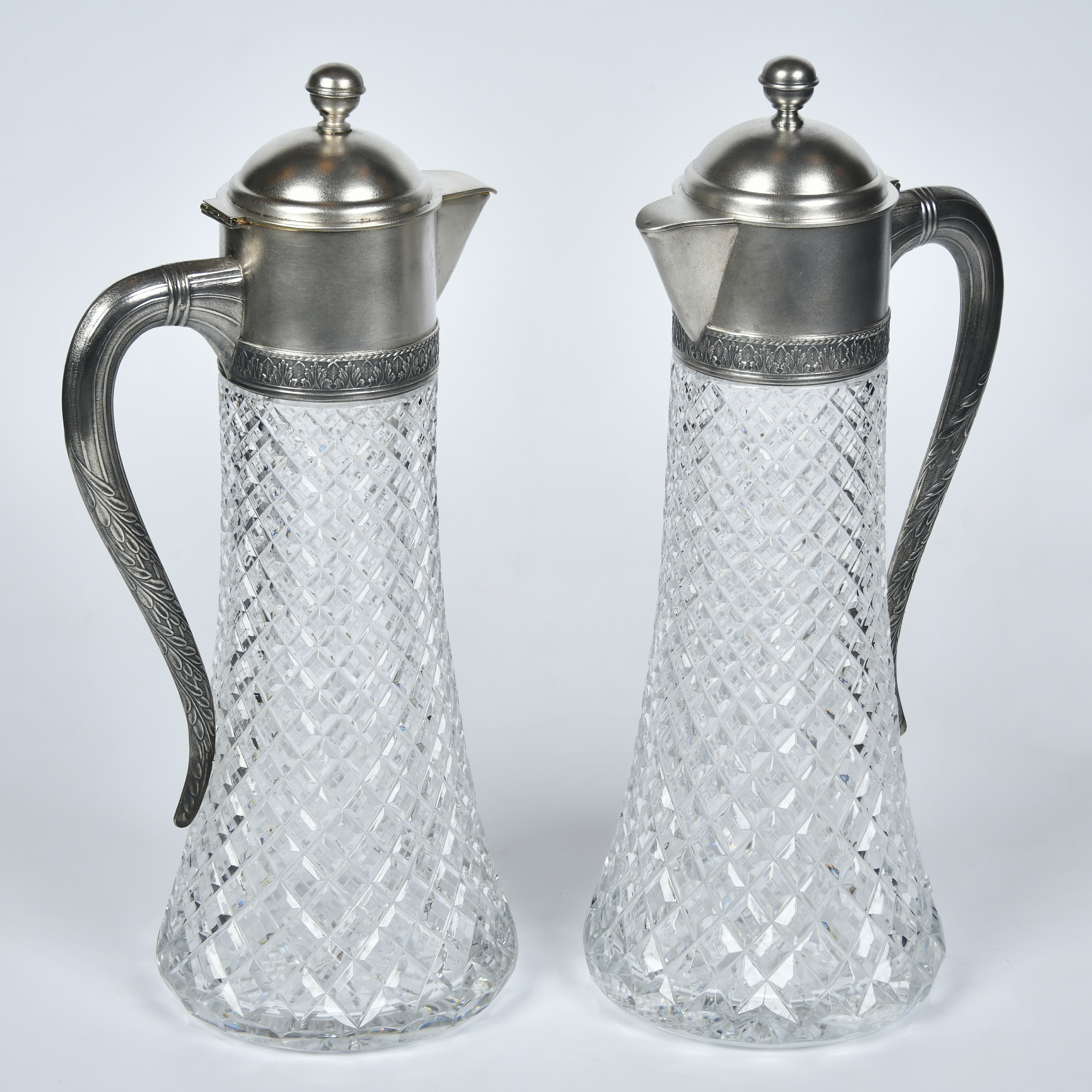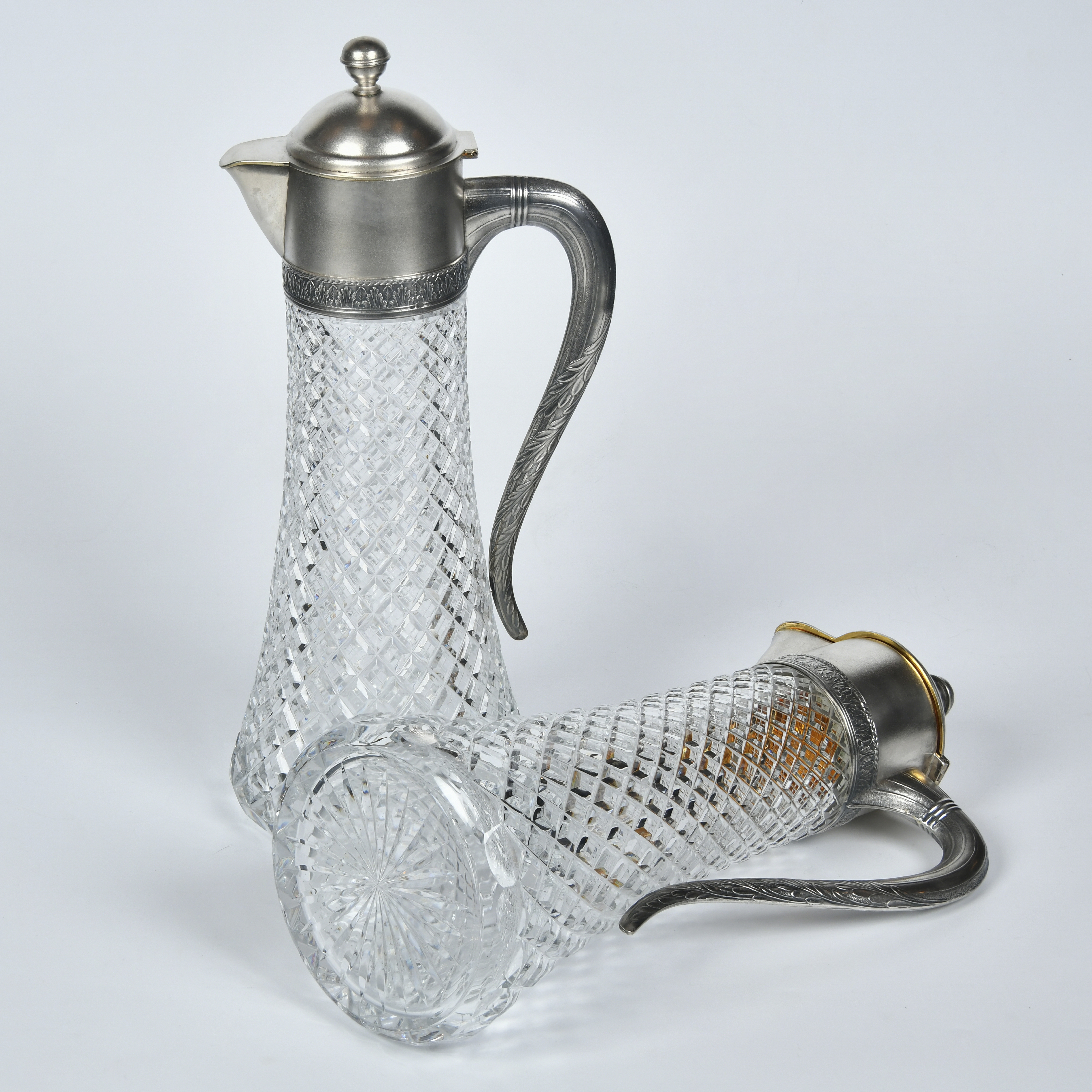 Хрусталь, гранение, монтировка, серебро, литье, чеканка, золочение. Клейма на оправе: 875 пробы с эмблемой серпа и молота на фоне пятиконечной звезды с шифром московской инспекции пробирного надзора; завода - «9МЮЗ», «1МЮ», клеймо переопробации 875 пробы; Московский ювелирный завод. Высота - 34 см, диаметр дна - 13 см; вес одного графина - 1, 897,73 грамм, второго - 2 095,35 грамм