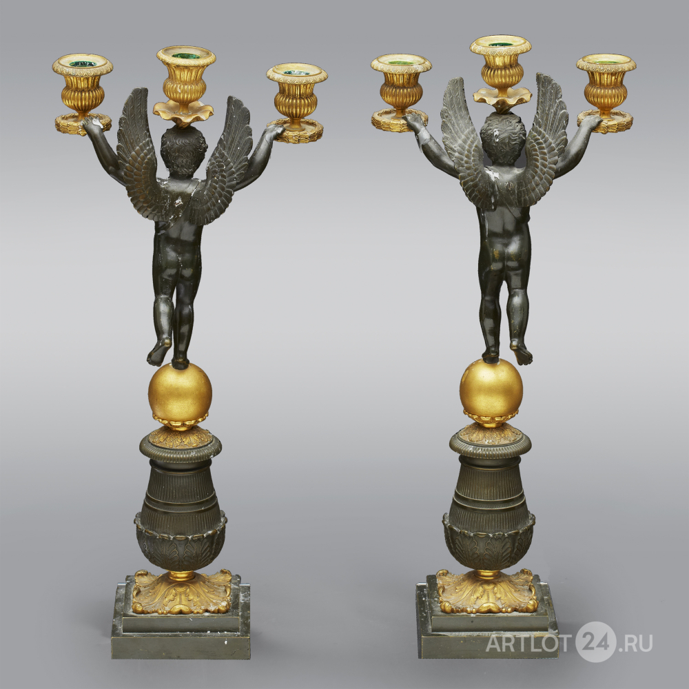 Канделябры на три свечи с фигурами амуров. Бронза, литье, патинирование, золочение, Франция, конец XIX века, размеры (в/ш/г): 52 х 23 х 9 см