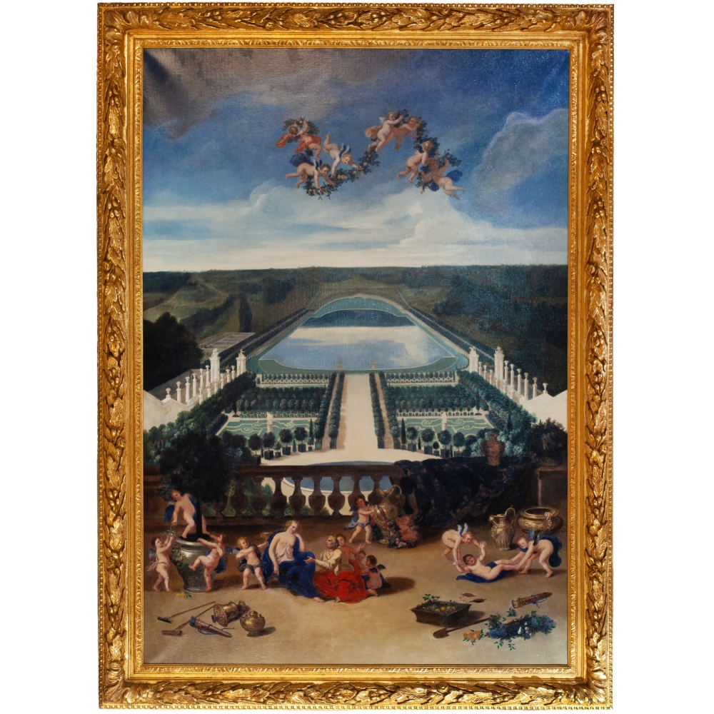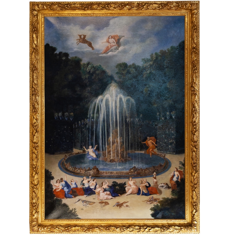 Копии полотен художника Жана Котелля Младшего (1646-1708) «Вид на Оранжерею и Швейцарское Озеро в 1688 году» и «Сцена у Боскета “Водная гора” (позже Боскет Звезды) в садах Версаля» с изображением в виде охотника бога реки Алфея, преследующего возлюбленную - нимфу Аретусу, спутницу Артемиды.