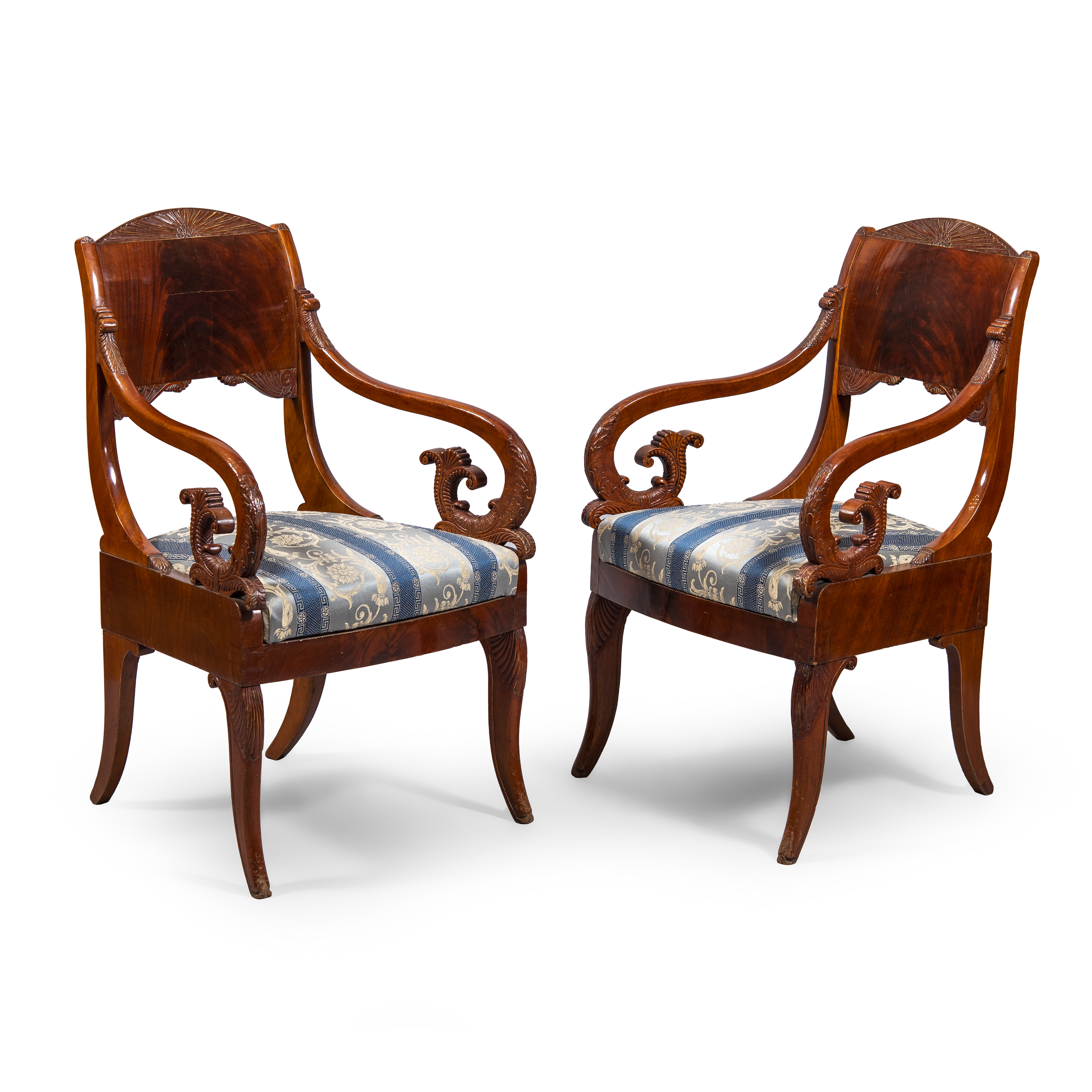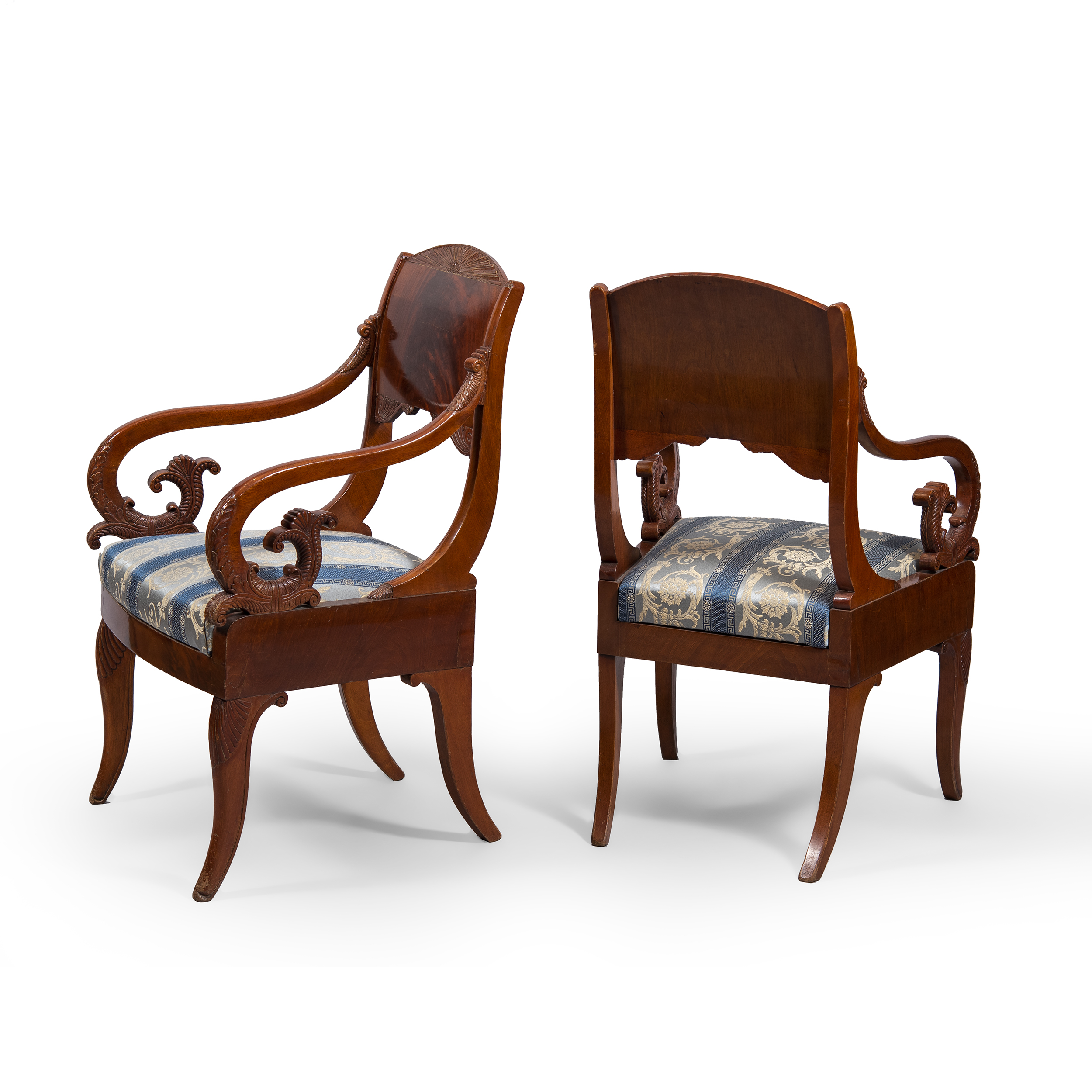Два парных кресла представляют собой яркий образец «николаевского ампира». Широкая горизонтальная планка спинки с волнообразным изгибом вверху и внизу, подлокотники наподобие круглых слегка изогнутых «рожков», с вкладными сиденьями. Красное дерево, резьба, полировка, ткань. Россия, Санкт-Петербург, 1830–1840-е гг. Размер (в/ш/г): 94х 58х57 см