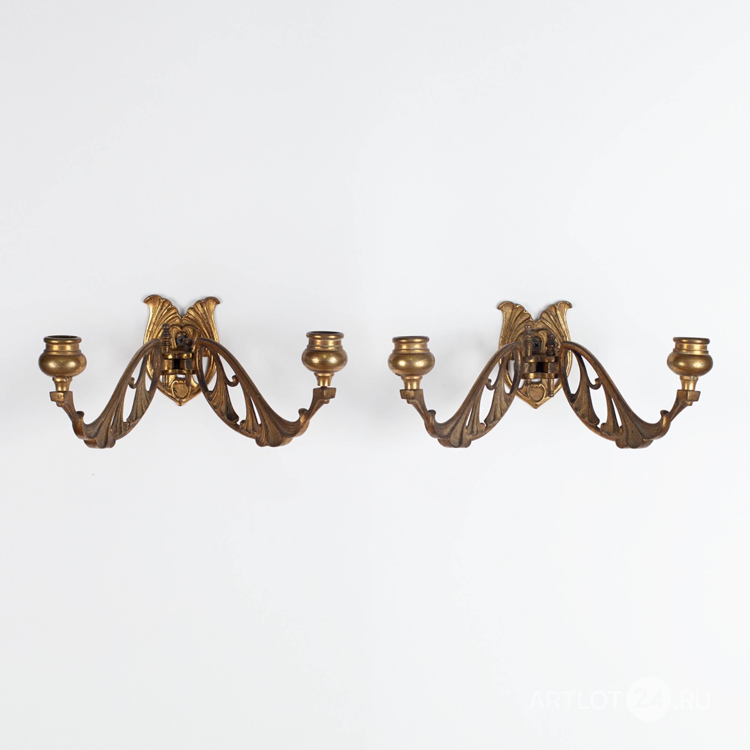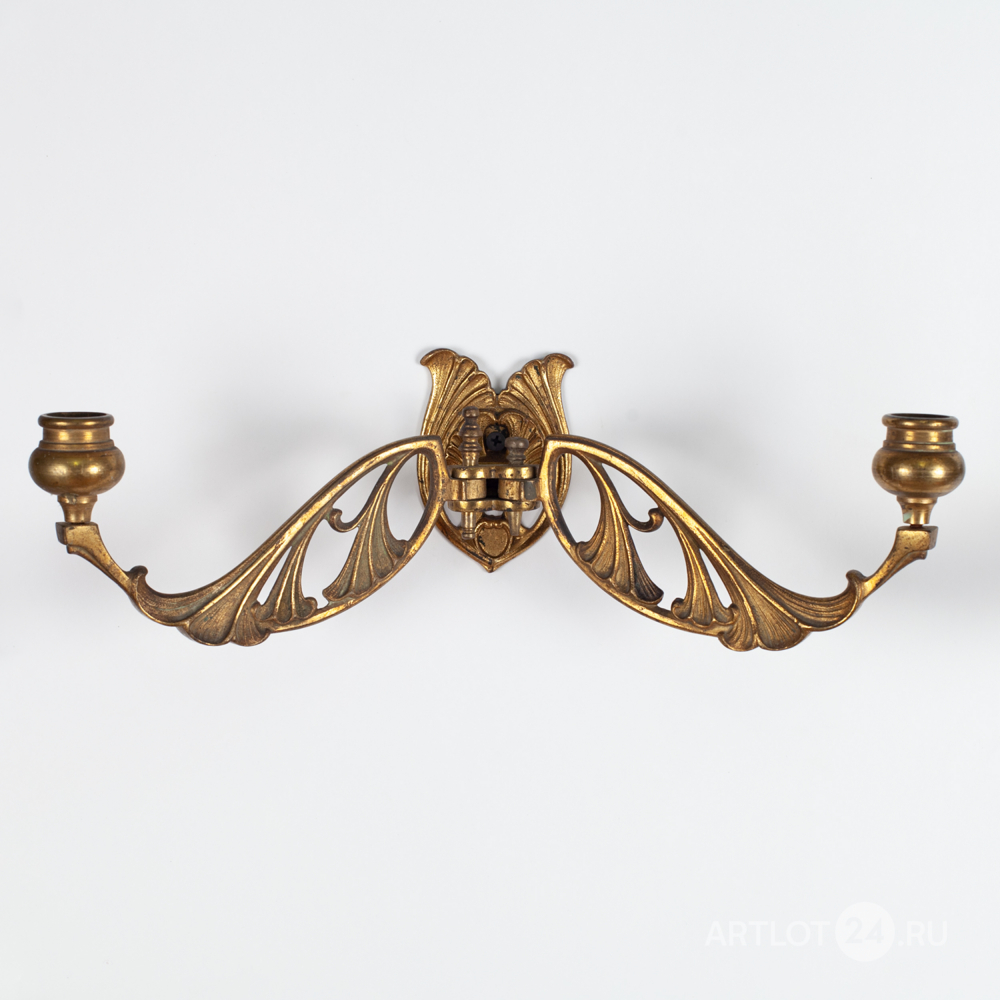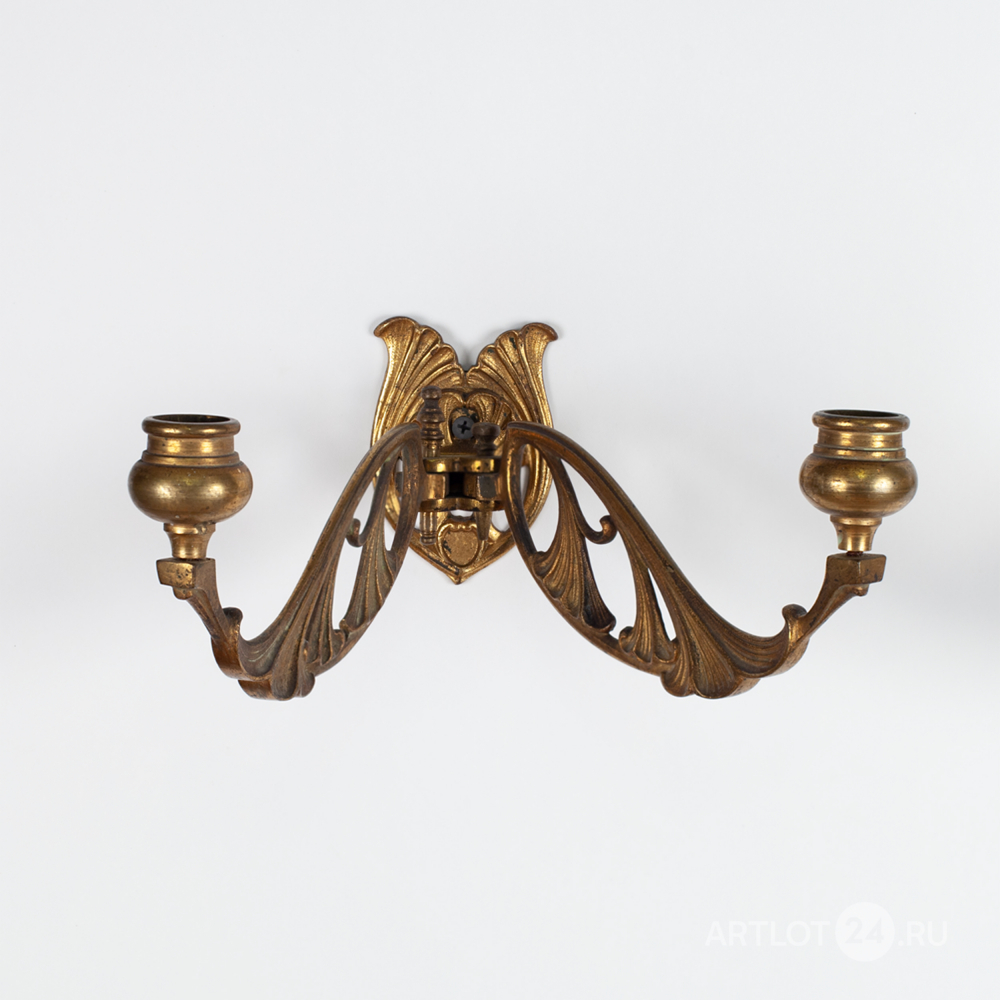 На две свечи с рожками, выполненными в виде колокольчиков. Бронза, литье, чеканка, в основании подпись «GAVEAU depose», компания Жозефа Гаво «La Maison Gaveau», Франция, 1900-1910-е годы, высота – 9,5 см, длина – 21,5 см, max. размах - 35 см
