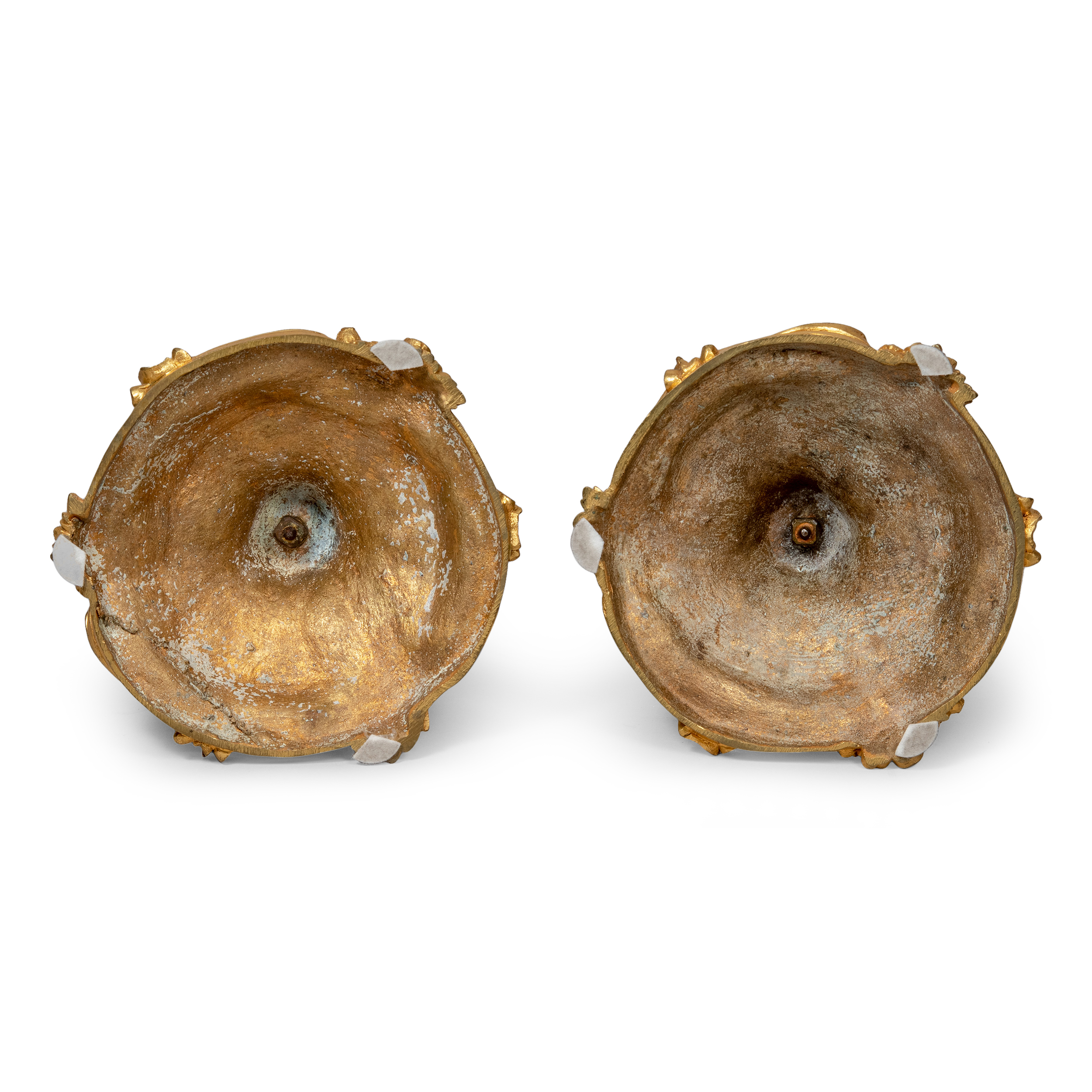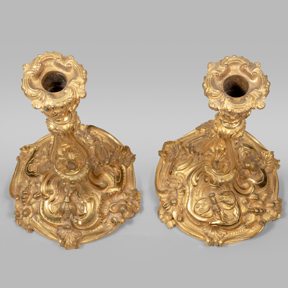Комплект подсвечников с рельефными изображениями жуков и бабочек выполнен в манере французского архитектора-декоратора, скульптора и ювелира стиля рококо Ж. О. Мейссонье (Juste-Aurèle Meissonnier, 1695 -1750). Бронза, литье, золочение, размеры: 27 х 14 х 17 см.