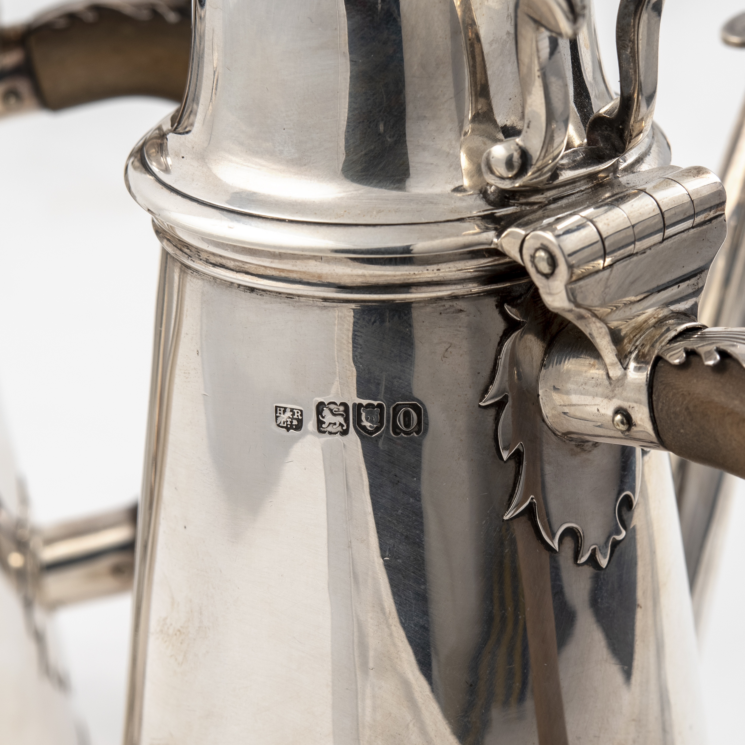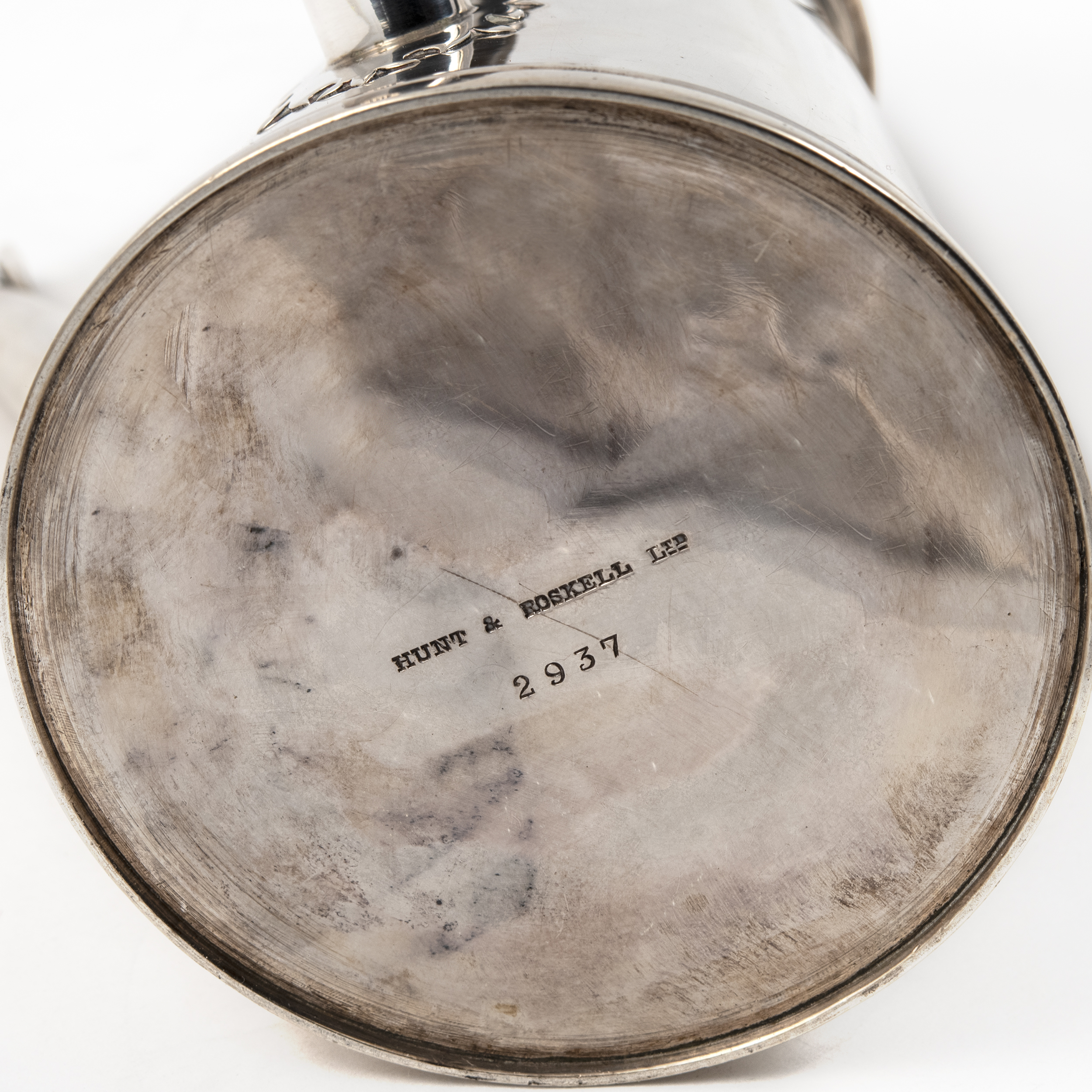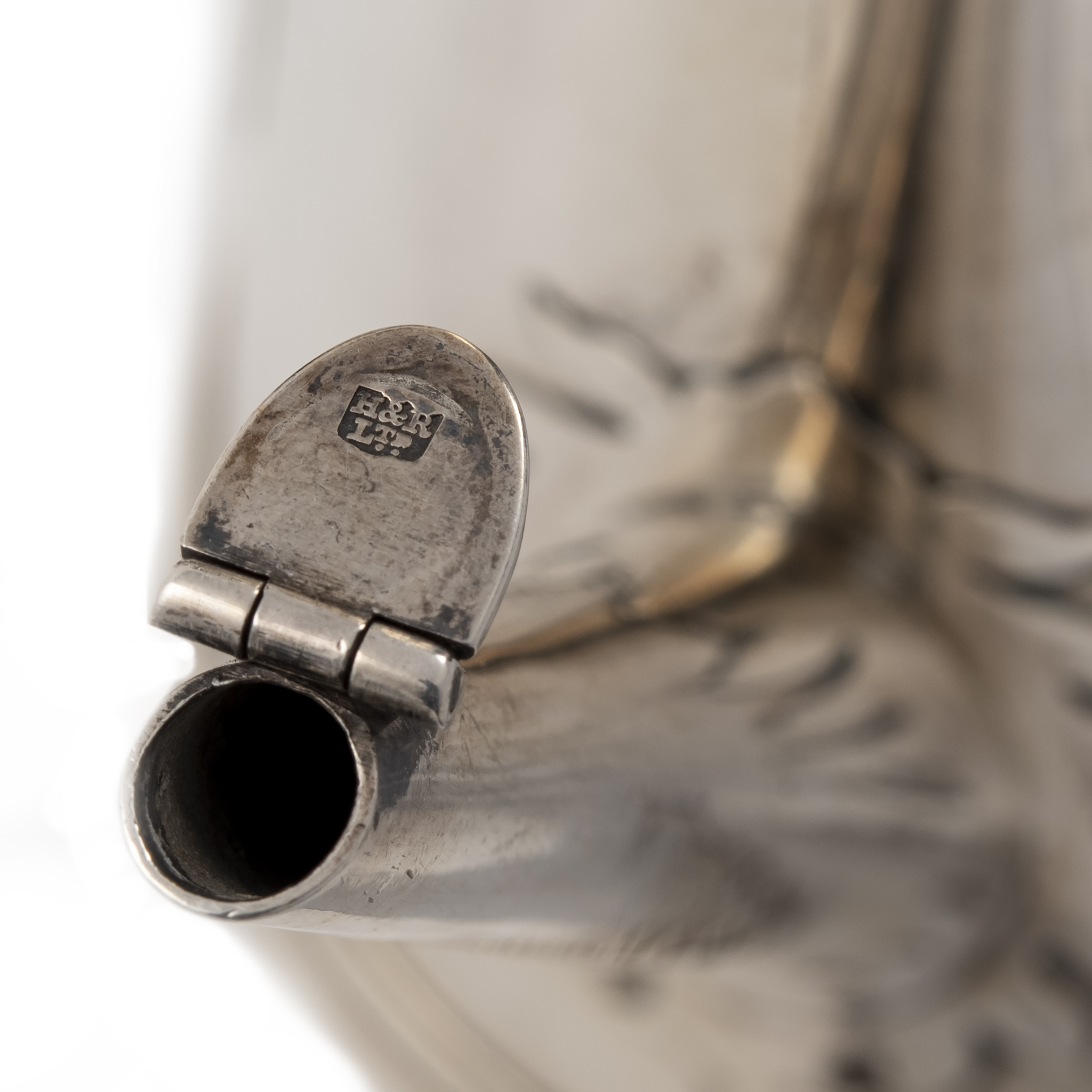 Клейма в виде идущего льва, клеймо лондонской пробирной палаты в виде головы леопарда в фигурном щитке, годовое клеймо «О», клейма «H&R Ltd» в фигурном щитке, а также «Hunt & Roskell Ltd» фирмы Ханта и Роскеля (основана в 1843 году);
