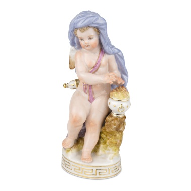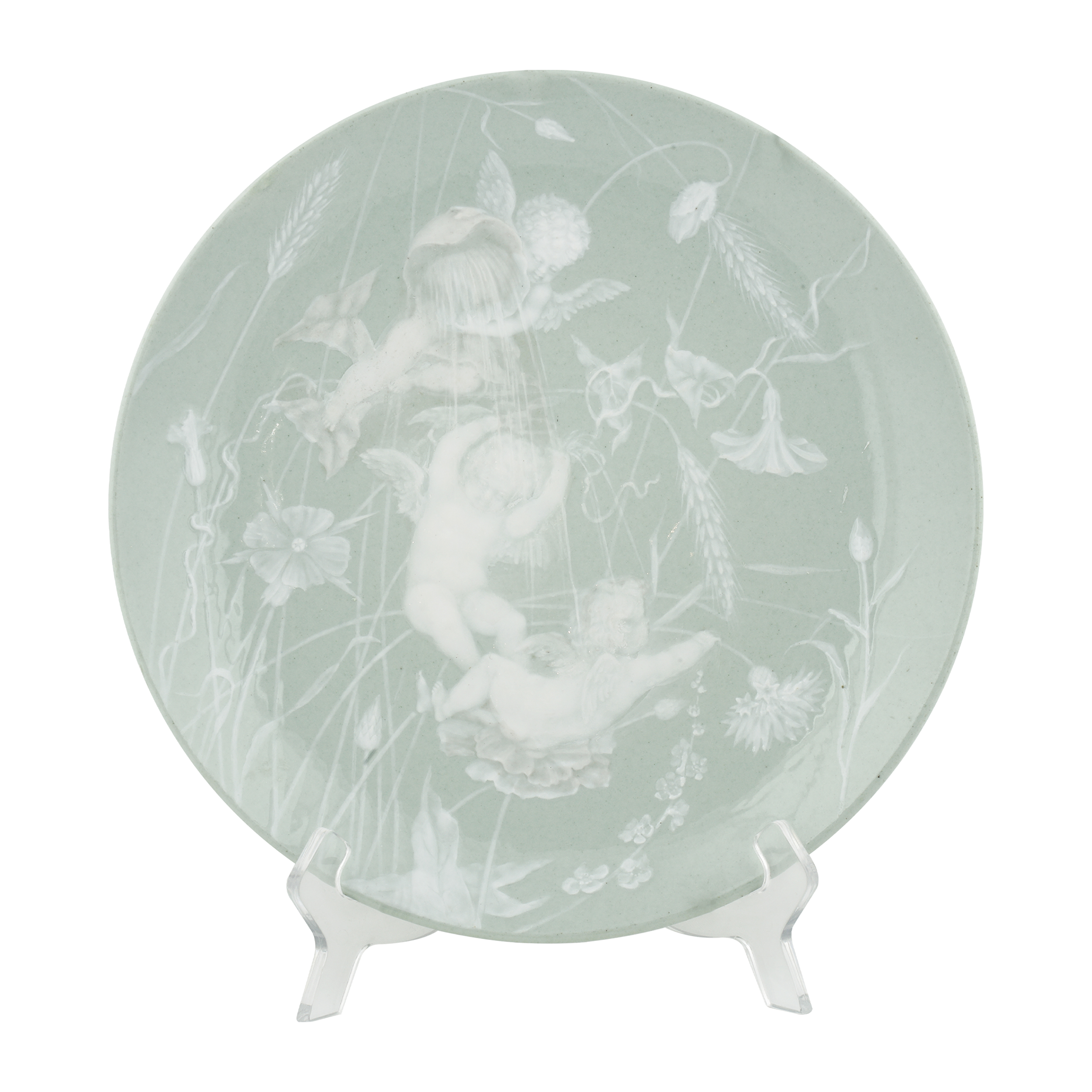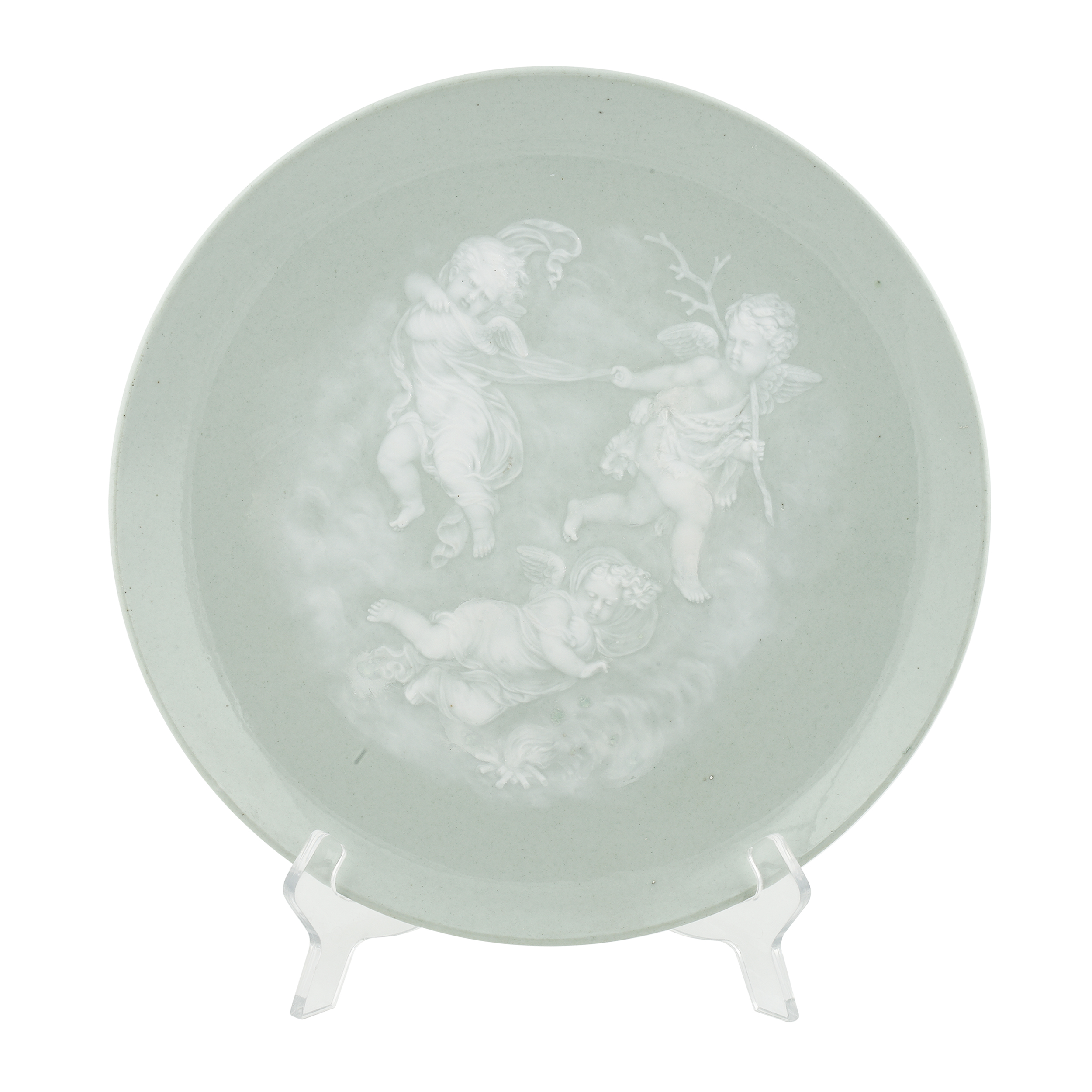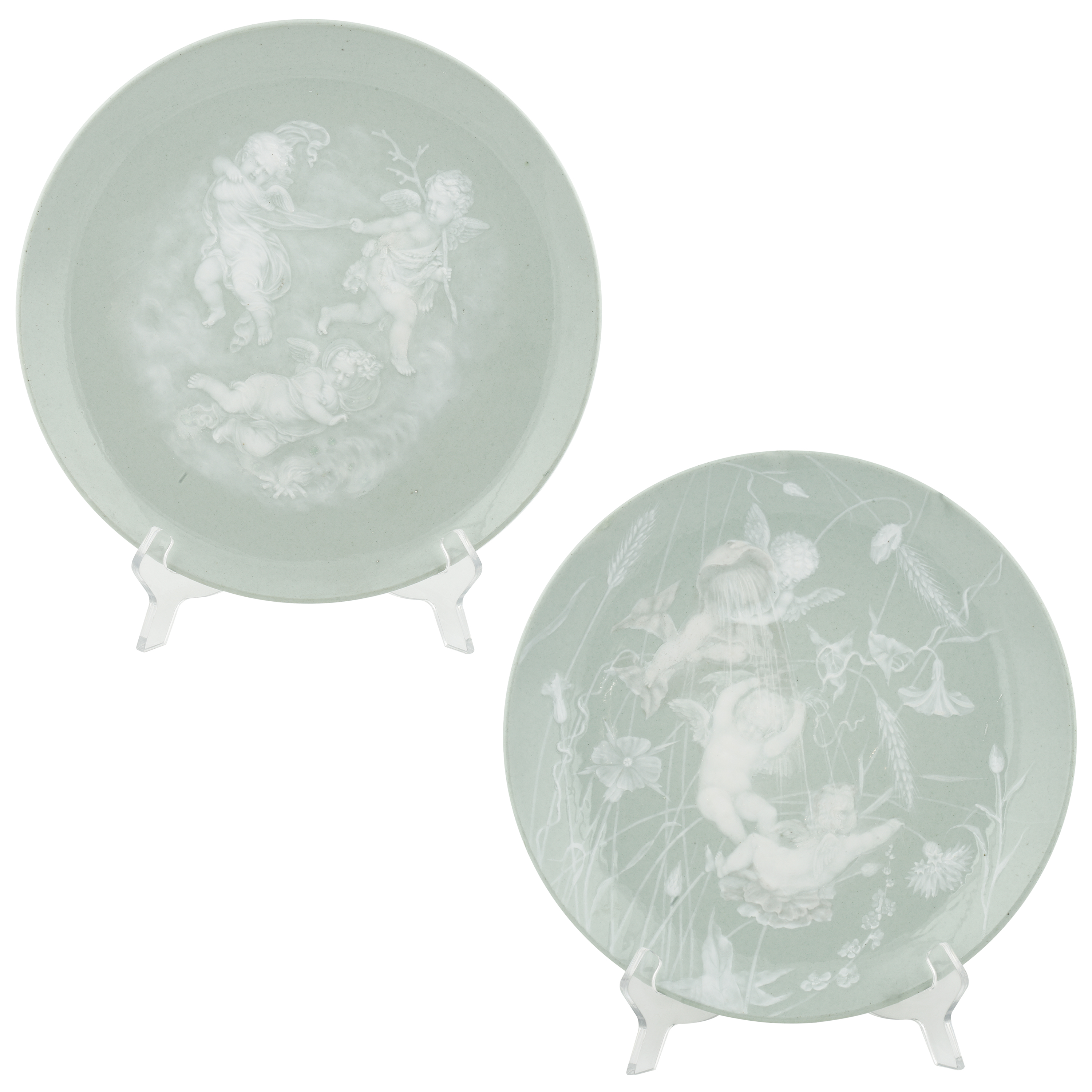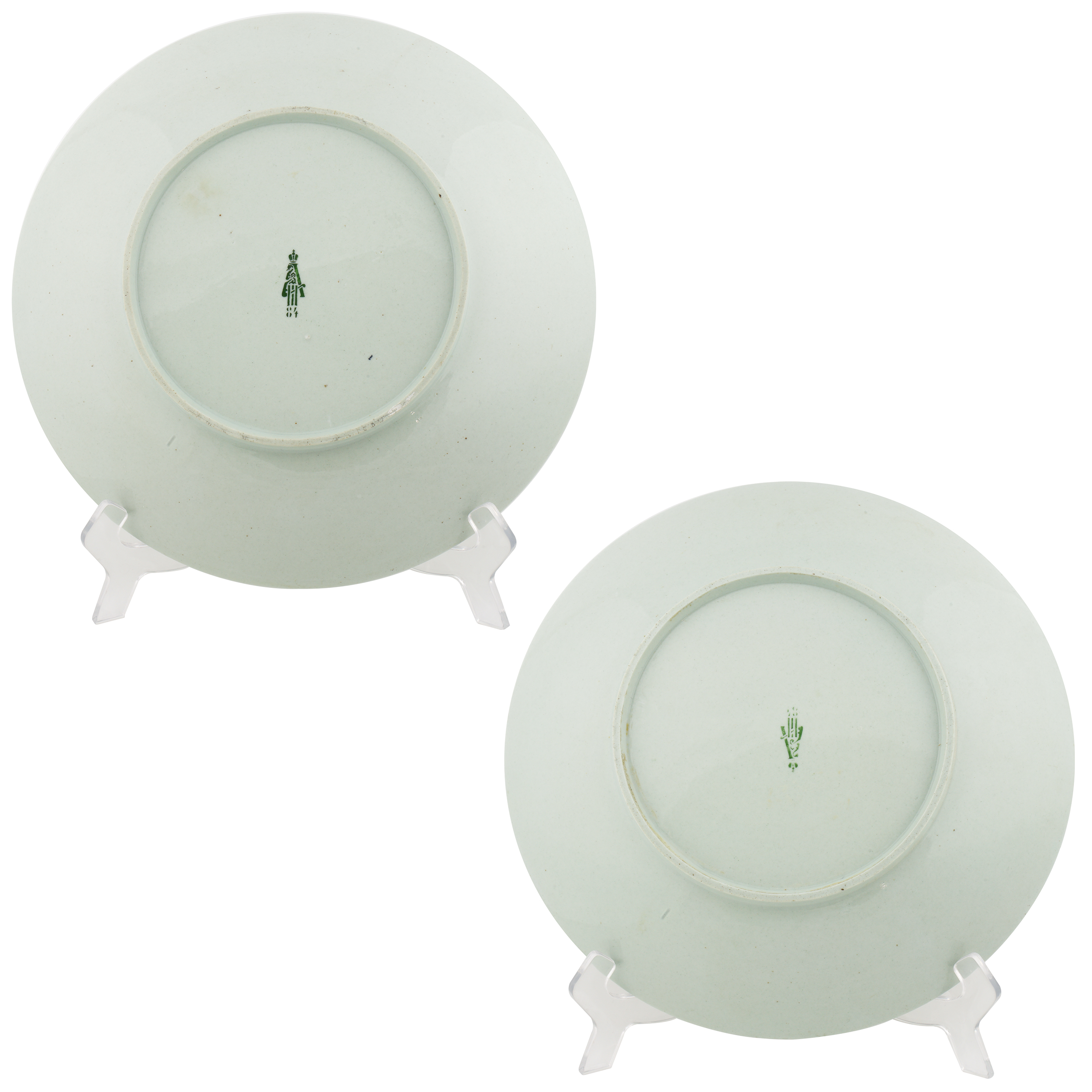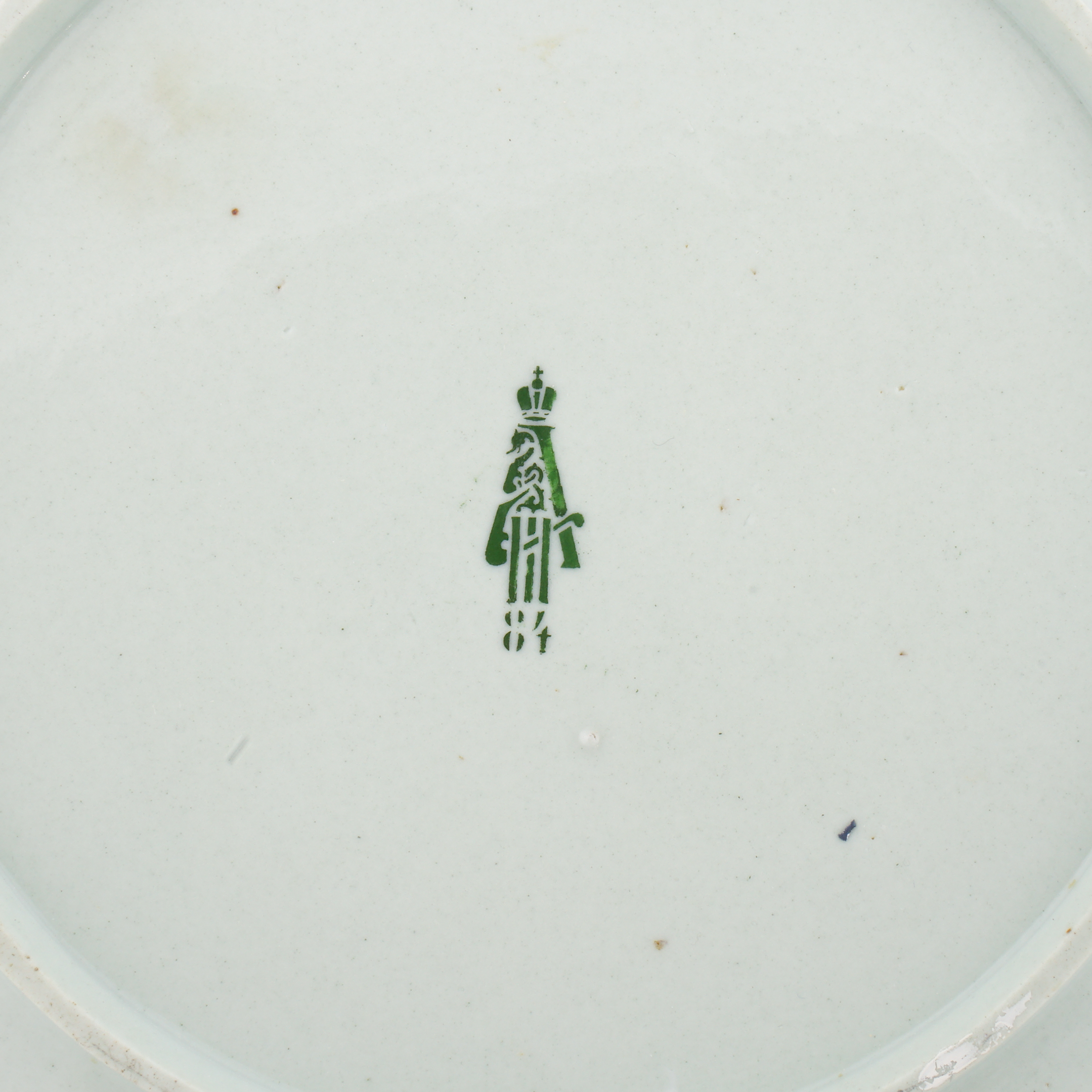 Тарелки украшают сцены с резвящимися амурами: нежный многослойный молочный рисунок гармонично вписан в поле фарфоровой поверхности тарелок. Фарфор, монохромные крытье, роспись в технике «пат-сюр-пат»; надглазурные марки хромом в виде «А под императорской короной» с датой «84»; Россия, диаметр – 26,5 и 27 см.
