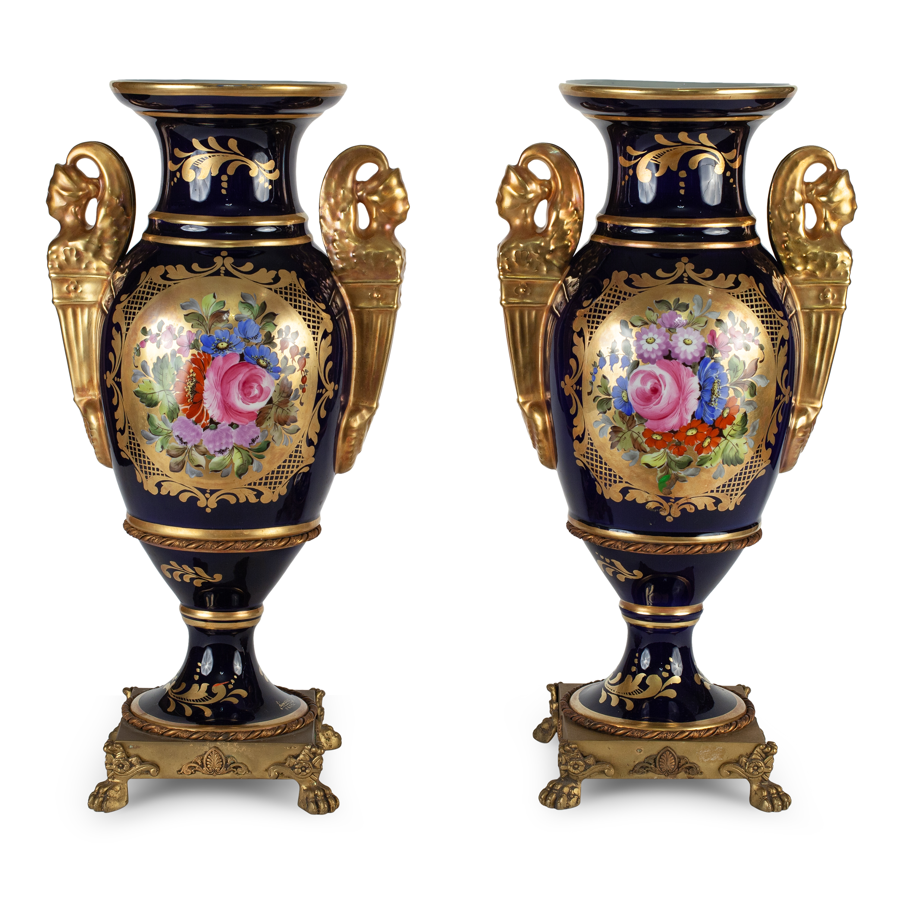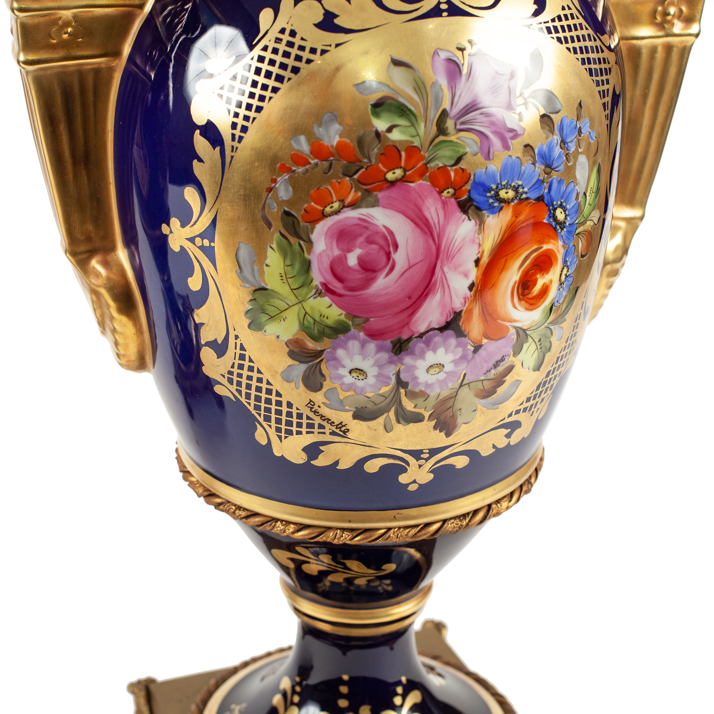 Фарфор, крытье кобальтом, полихромная надглазурная роспись, золочение, бронзовое основание с ножками в виде львиных лап, литье, чеканка, марка: зеленая «Limoges France», Европа, начало XX века, (в/ш/г): 48 х 25 х 15 см