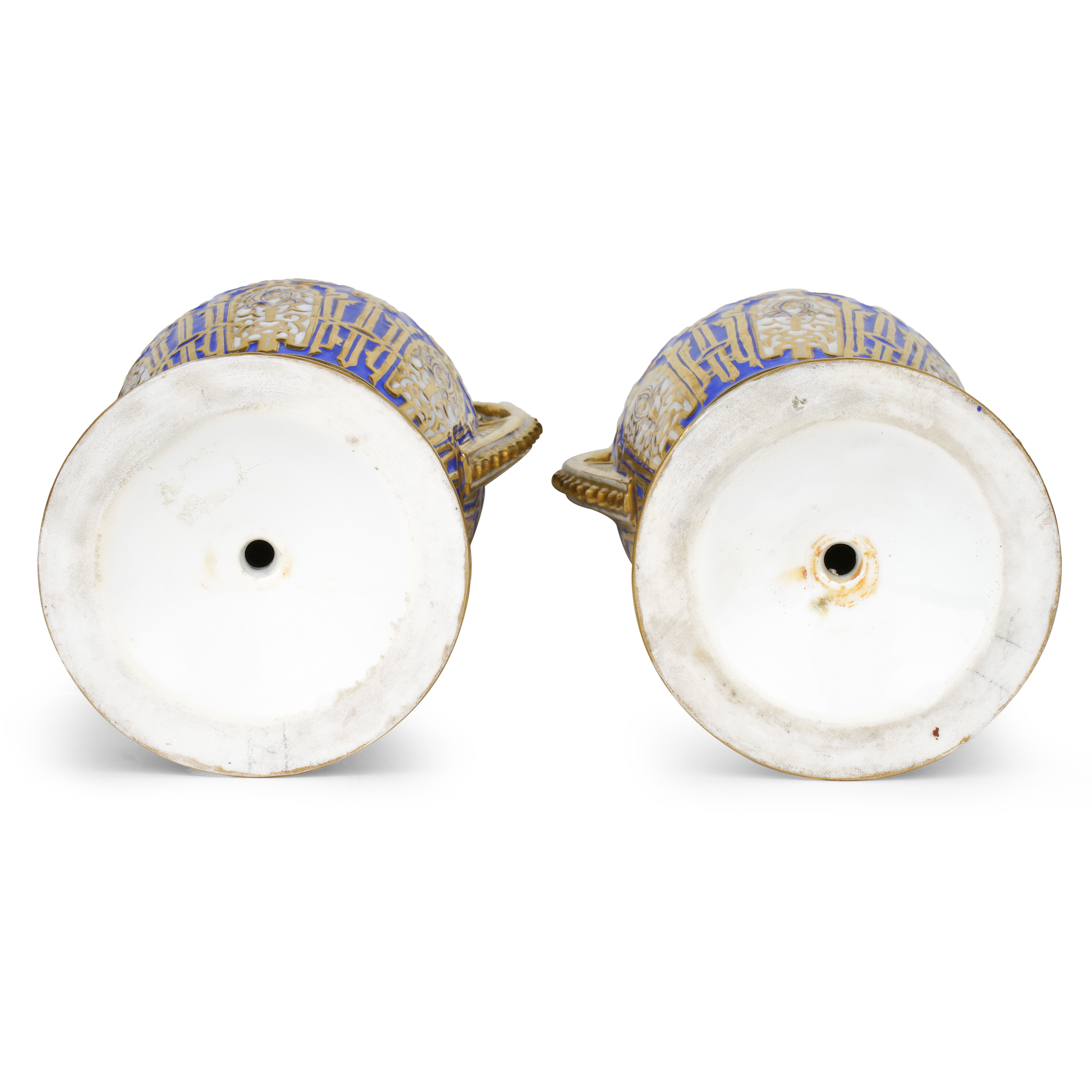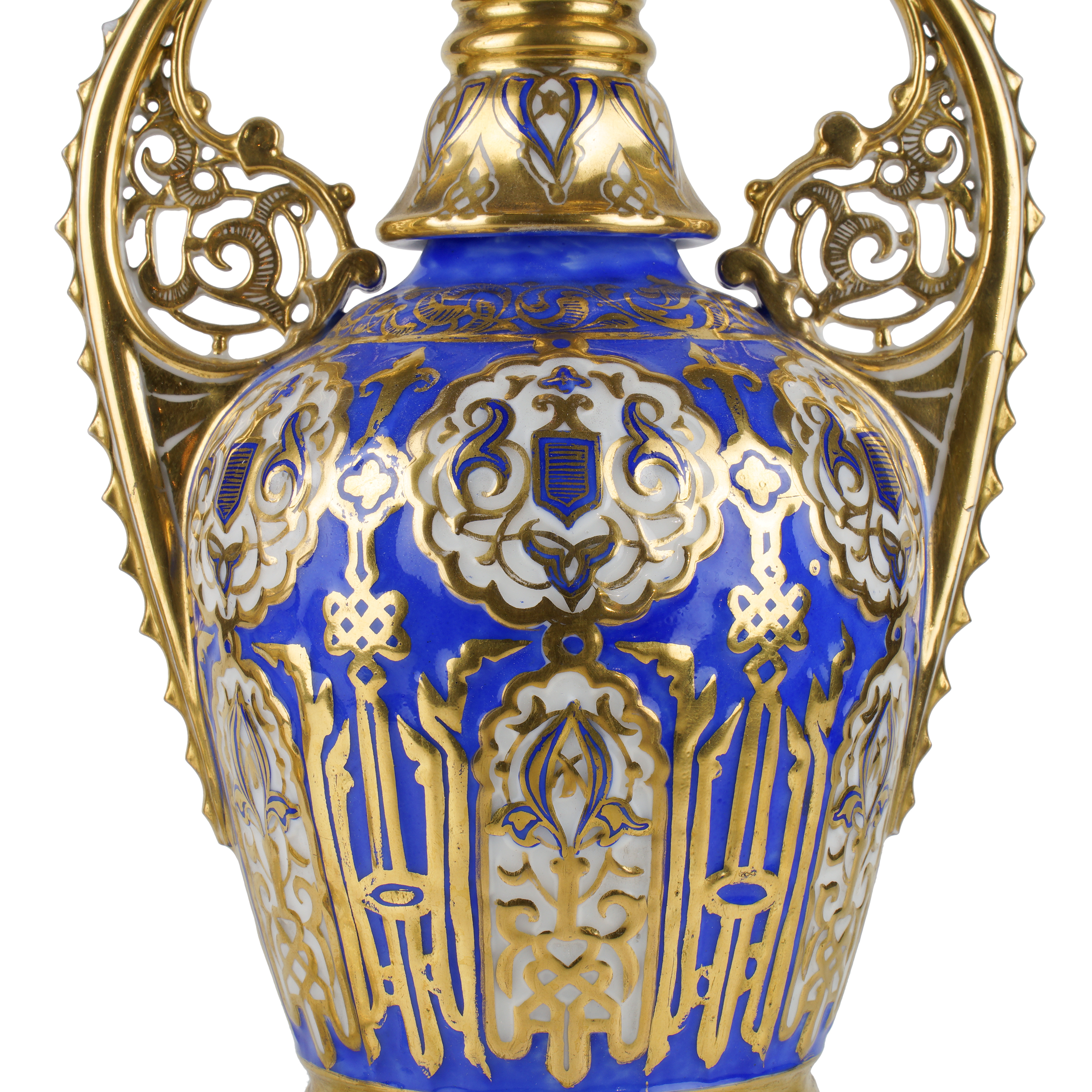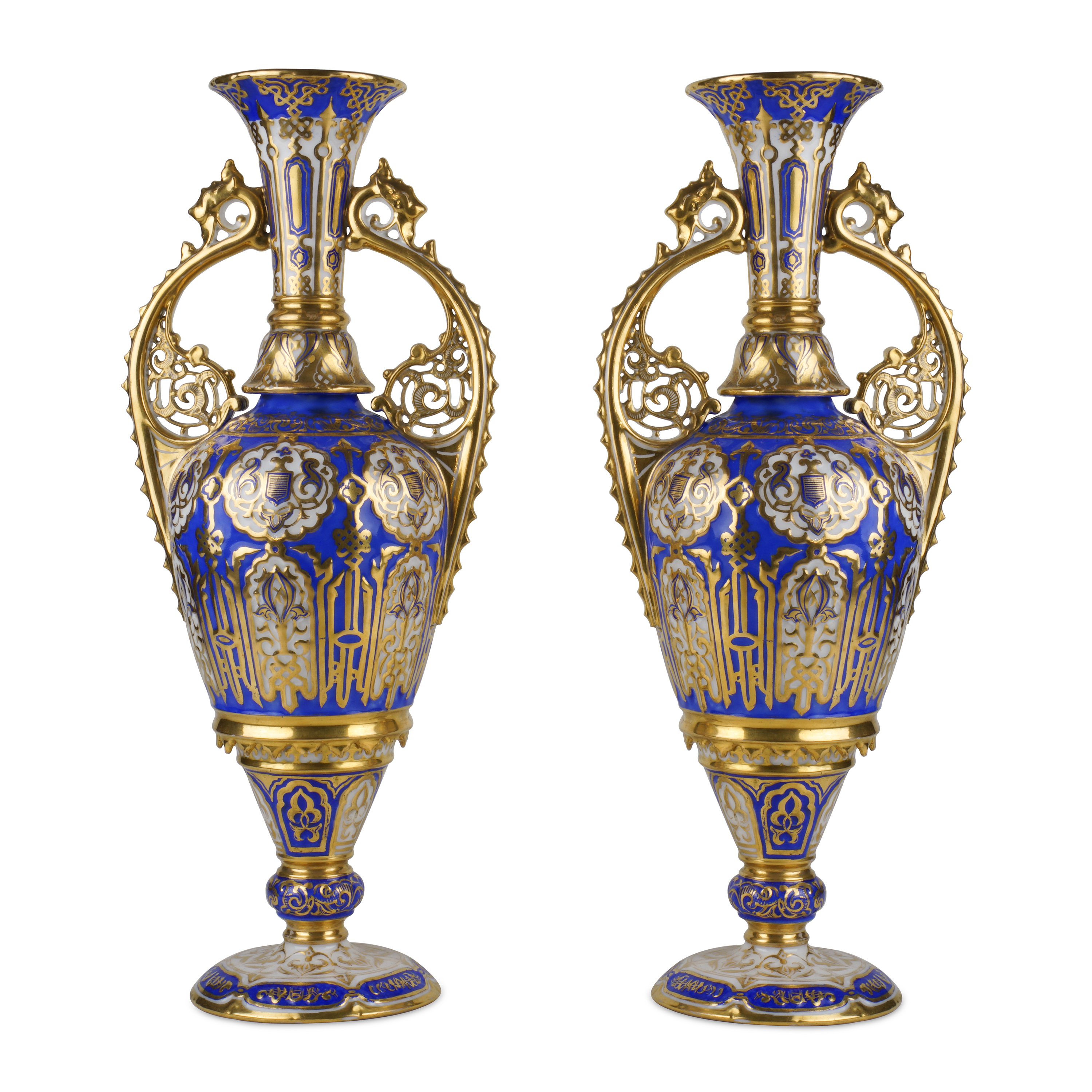 Вазы украшены надписью «Нет божества, кроме Аллаха, и Мохаммед - его пророк». Фарфор, надглазурная полихромная роспись, золочение, полировка; знак скульптора-формовщика, тисненный в массе «7», без марки; высота – 40 см.