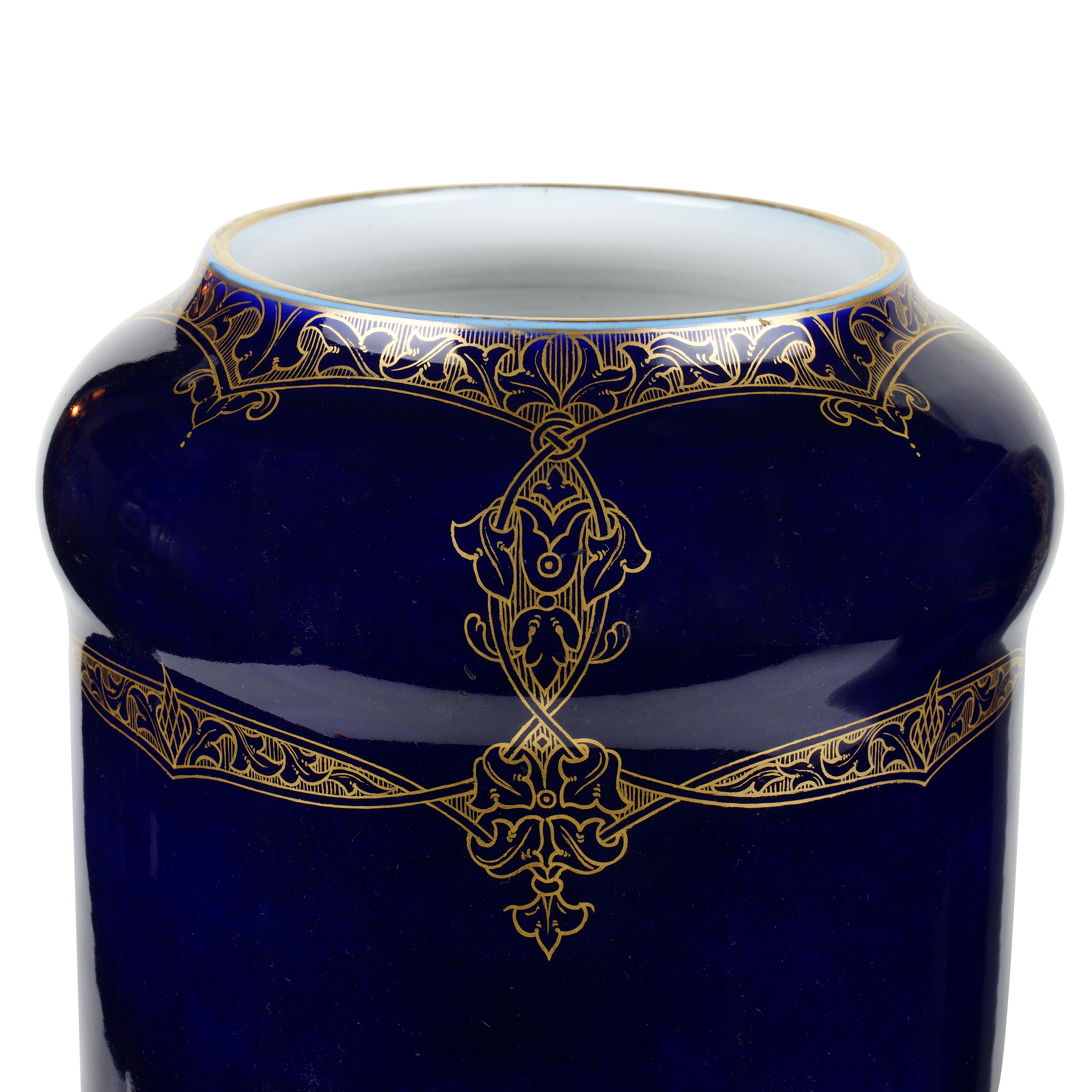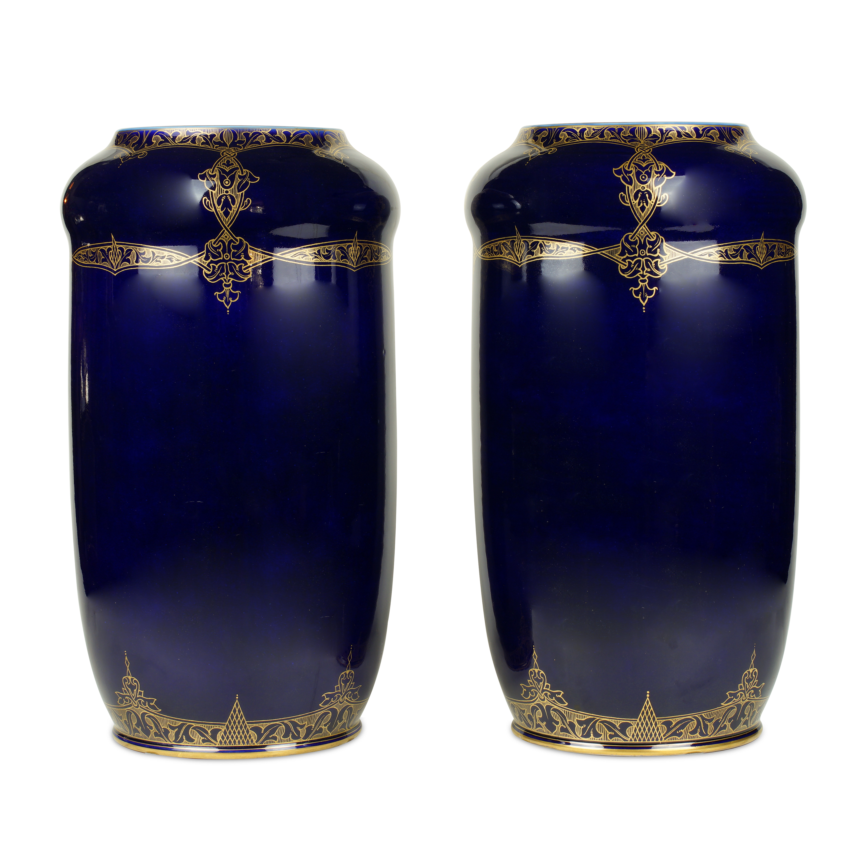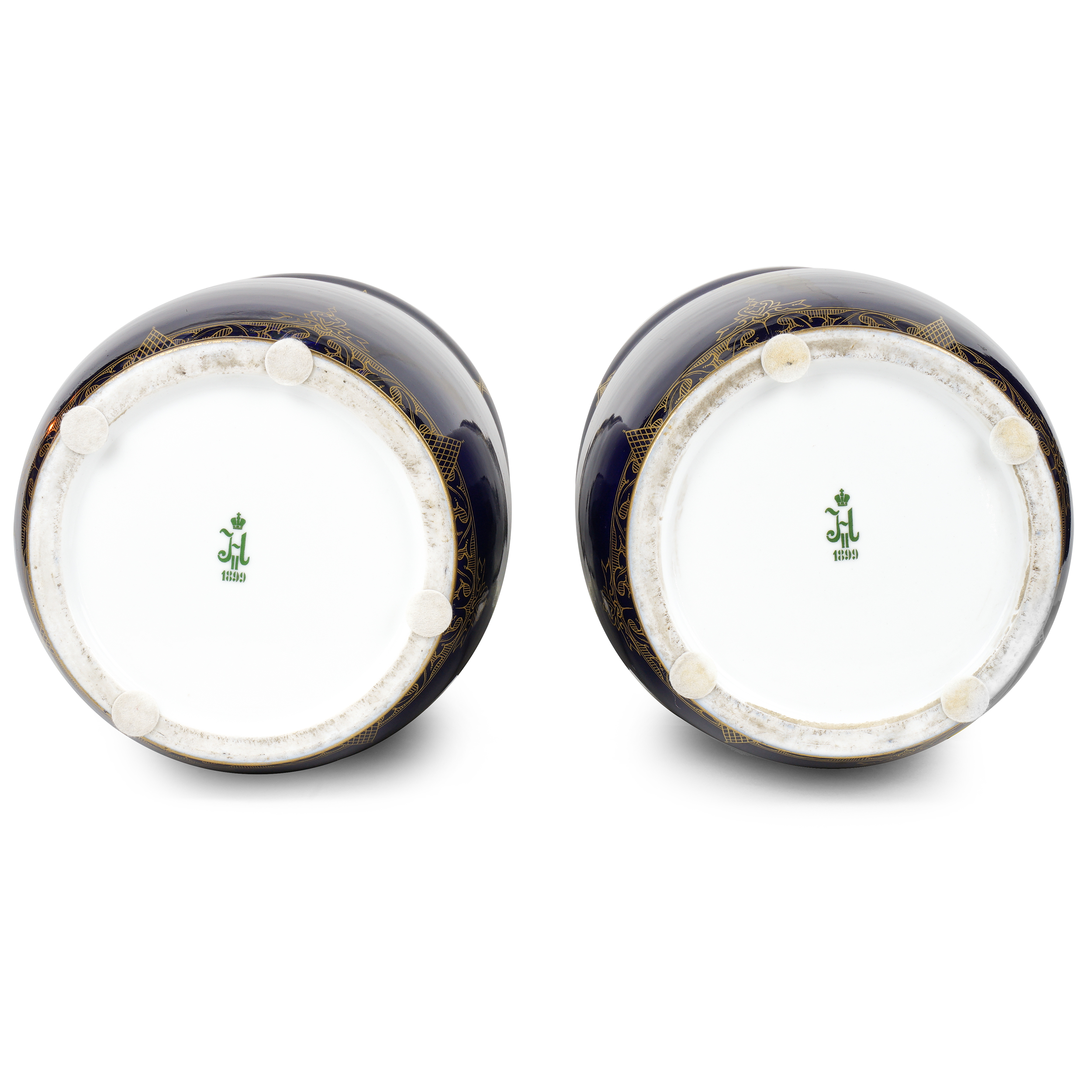 Автор формы ваз – скульптор А.К. Тимус (1865-1943), роспись ваз выполнил художник С.Р. Романов. Фарфор, монохромное крытье кобальтом, орнаментальное золочение, цировка, подглазурная зелёная марка штампом «Н II 1899 под короной»; Россия, высота ваз - по 45 см.