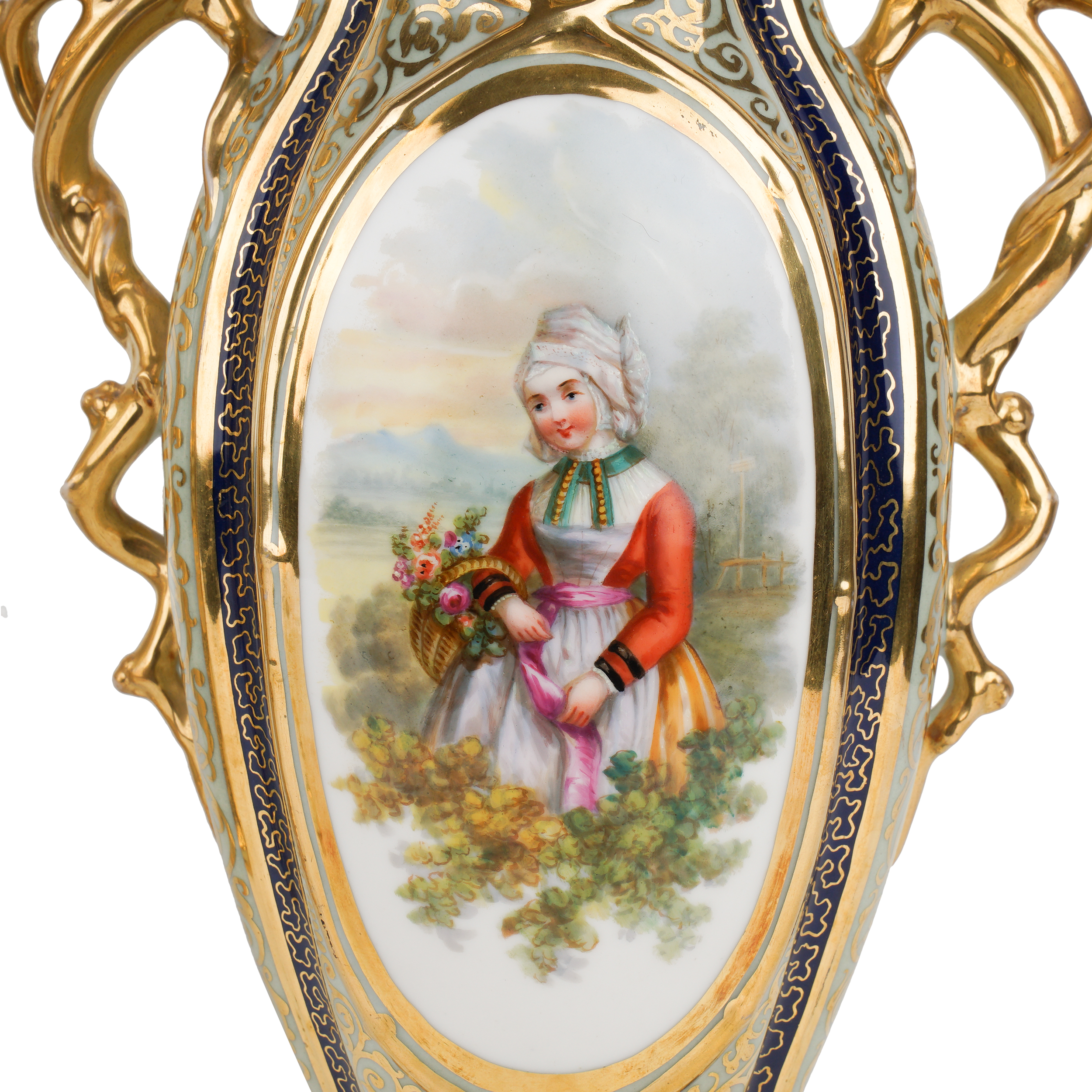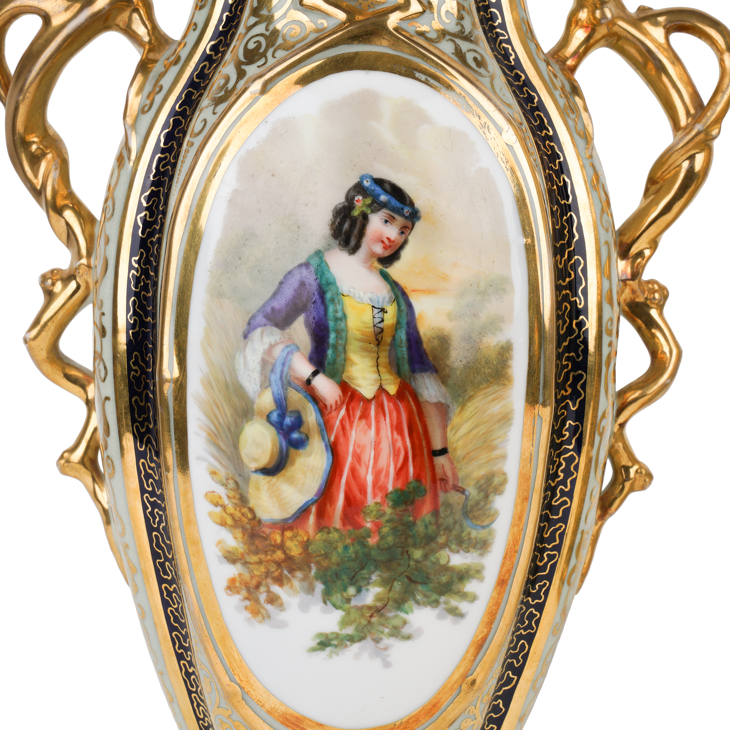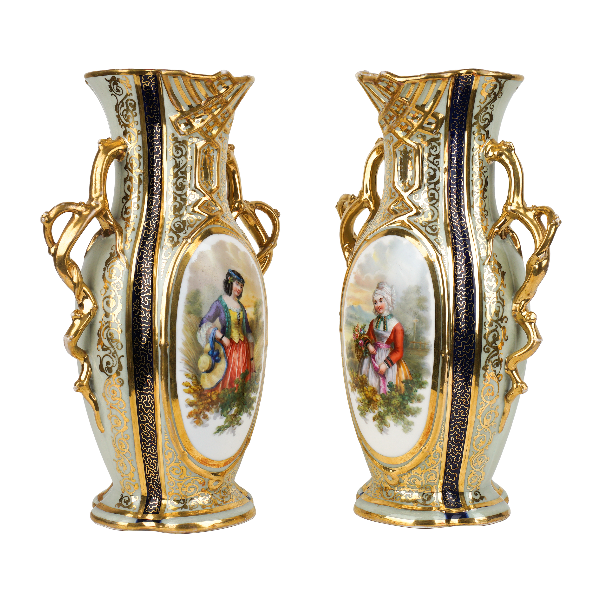 Вазы с изображением молодых дам на фоне романтического пейзажа в резервах и ручками в виде лозы. Фарфор, лепка, полихромная роспись, кобальт, золочение, клеймо отсутствует, Европа (предположительно Франция), начало ХХ века, высота - 33 см