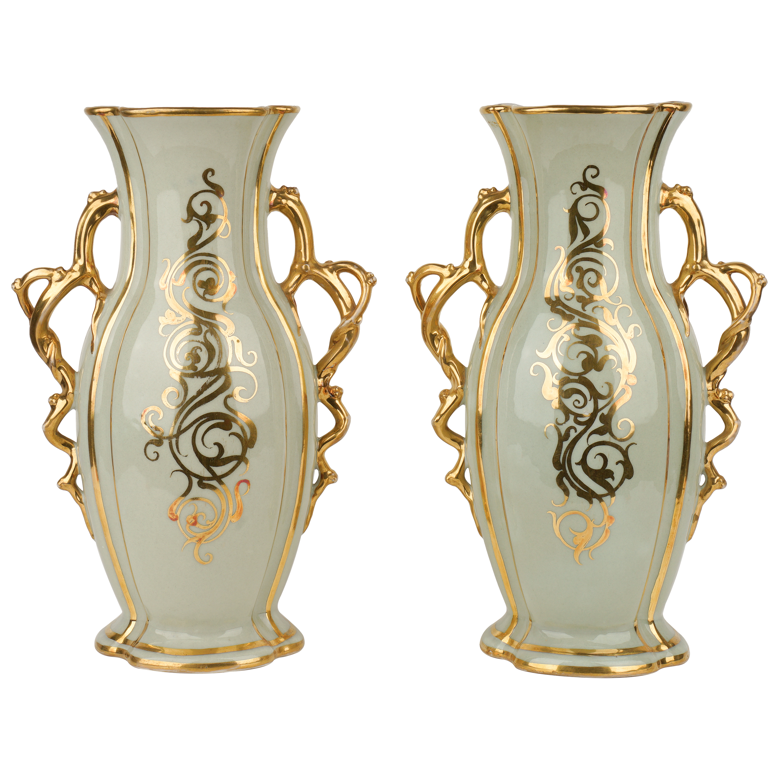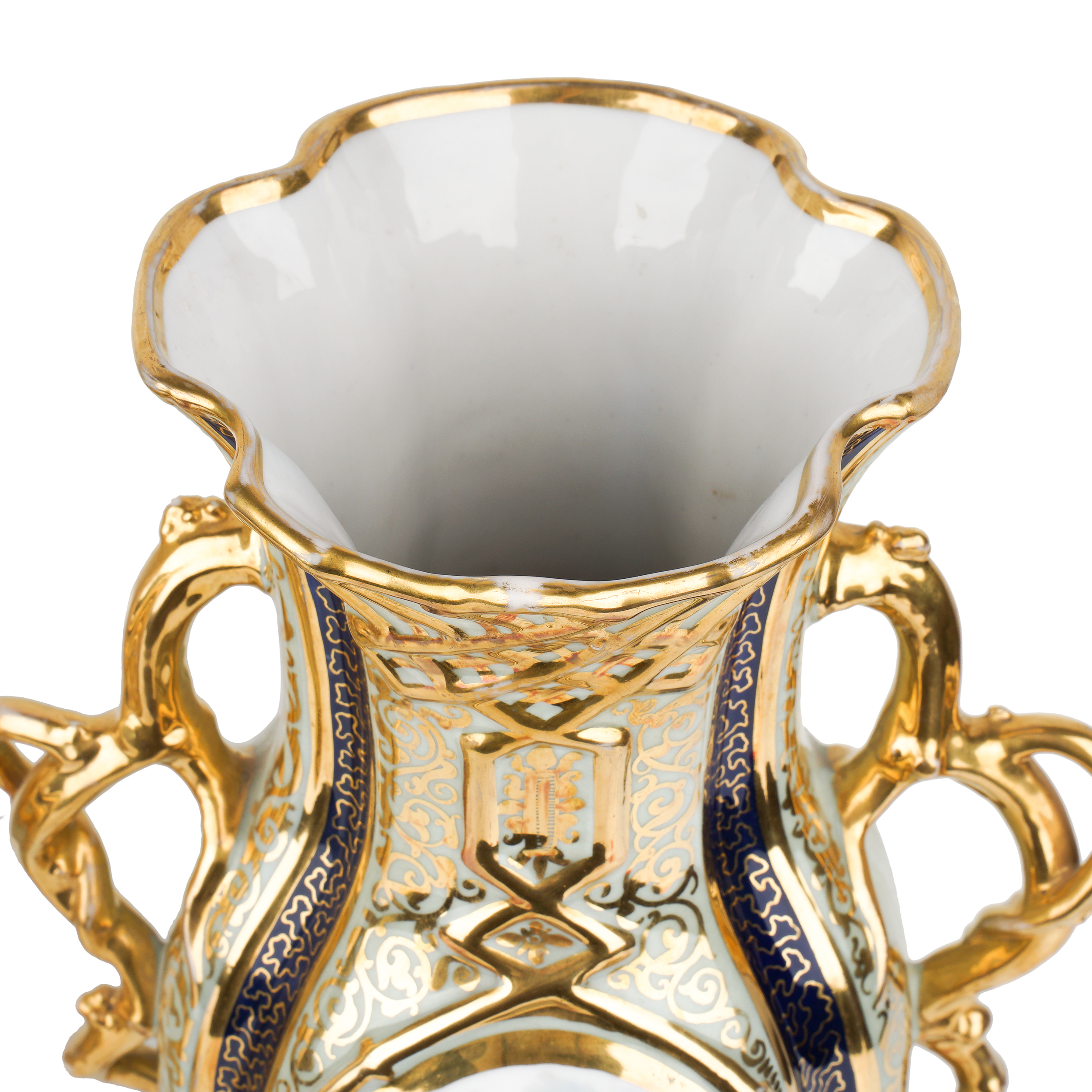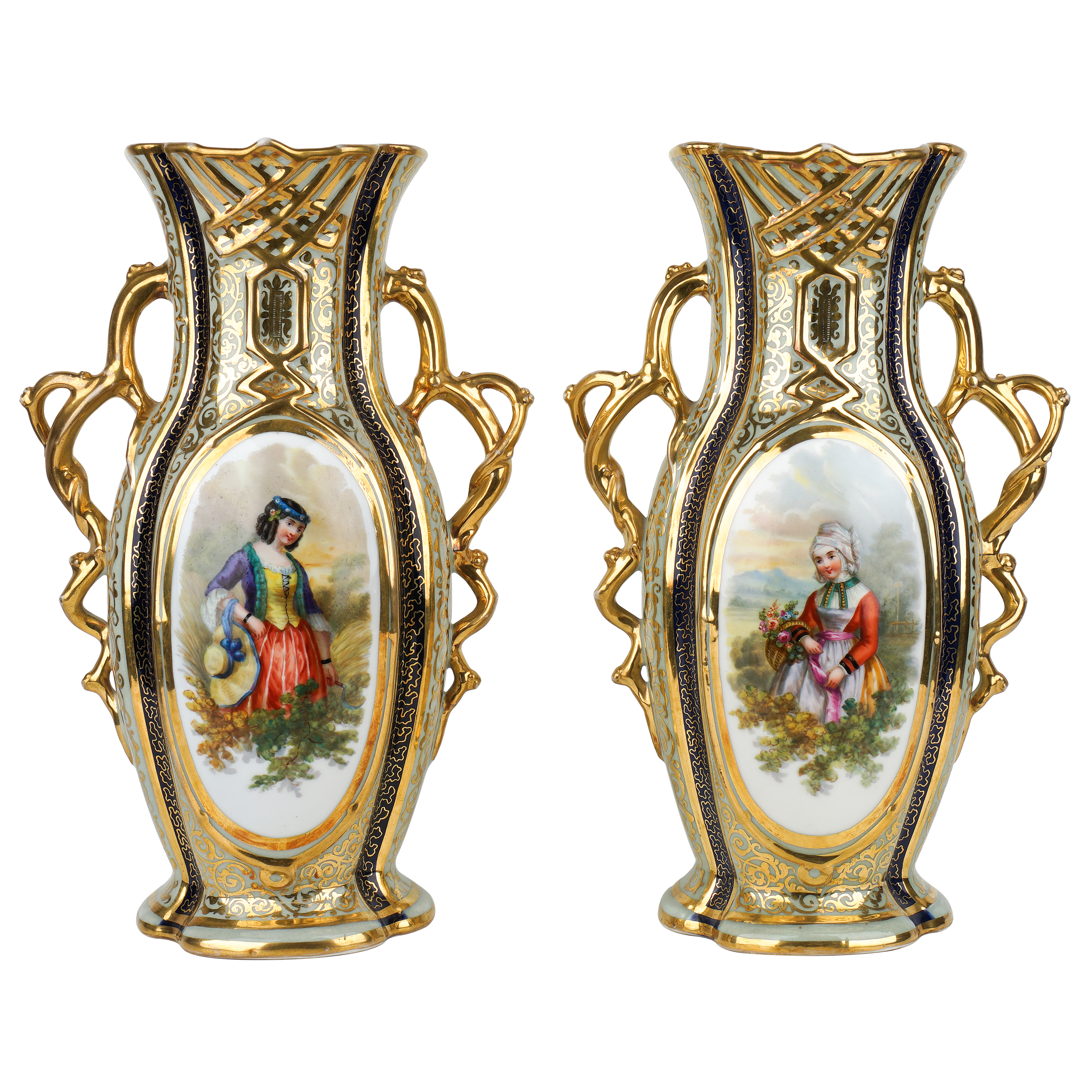 Вазы с изображением молодых дам на фоне романтического пейзажа в резервах и ручками в виде лозы. Фарфор, лепка, полихромная роспись, кобальт, золочение, клеймо отсутствует, Европа (предположительно Франция), начало ХХ века, высота - 33 см