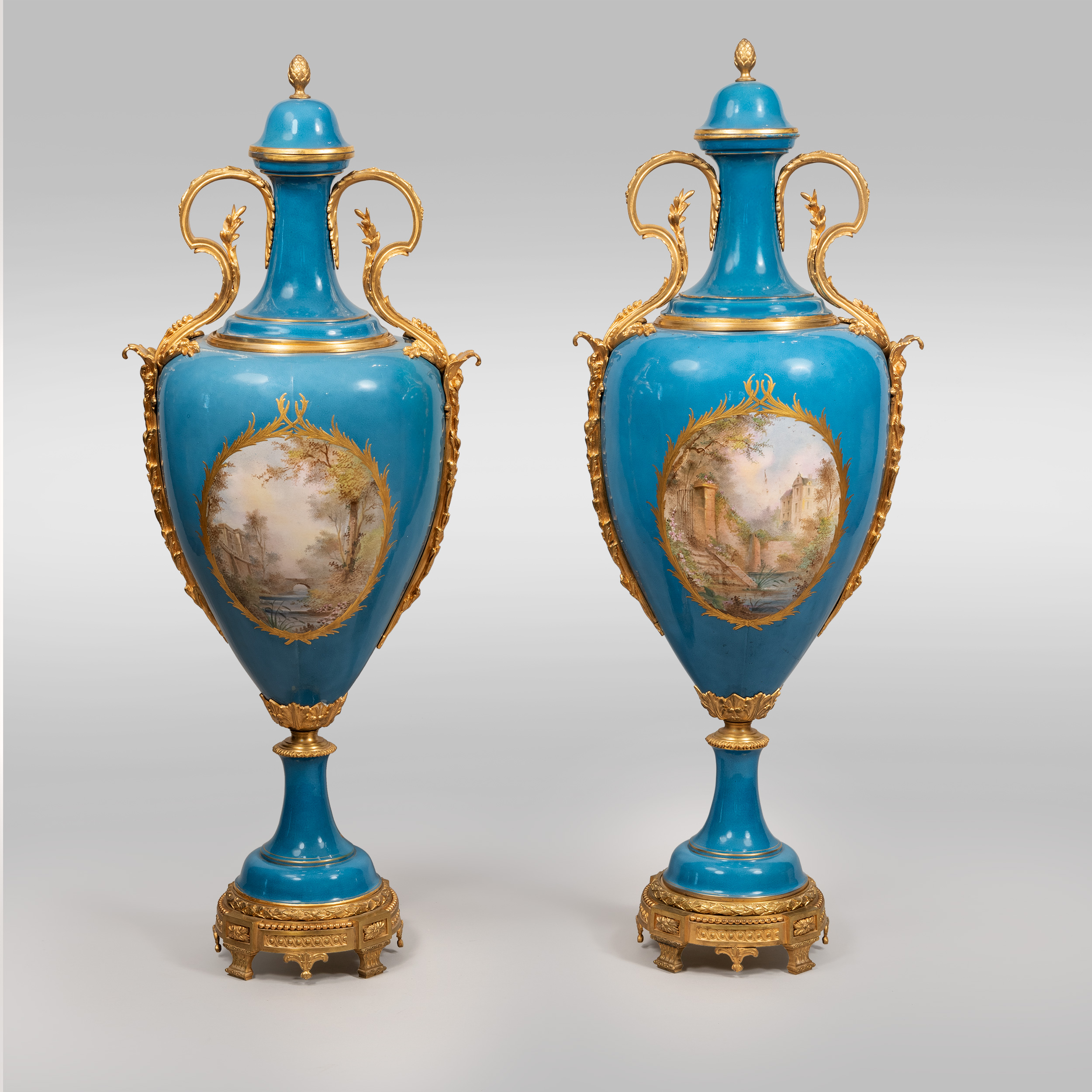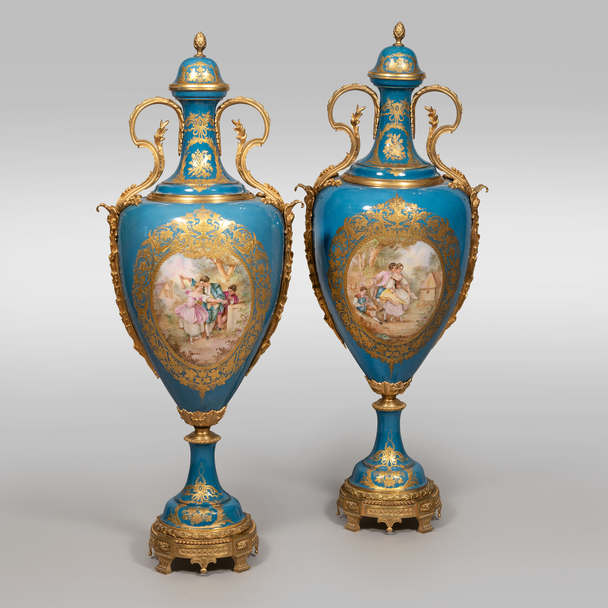 В стиле Севр. Фарфор, крытье голубым, резервы с надглазурной полихромной росписью в стиле Франсуа Буше, заключенные в рамы золотого лиственного орнамента, цировка, бронза, литье, чеканка, клеймо надглазурное в виде перекрещенных букв L, подпись «C. Meurice», Франция, последняя четверть XIX века, высота – 115 см