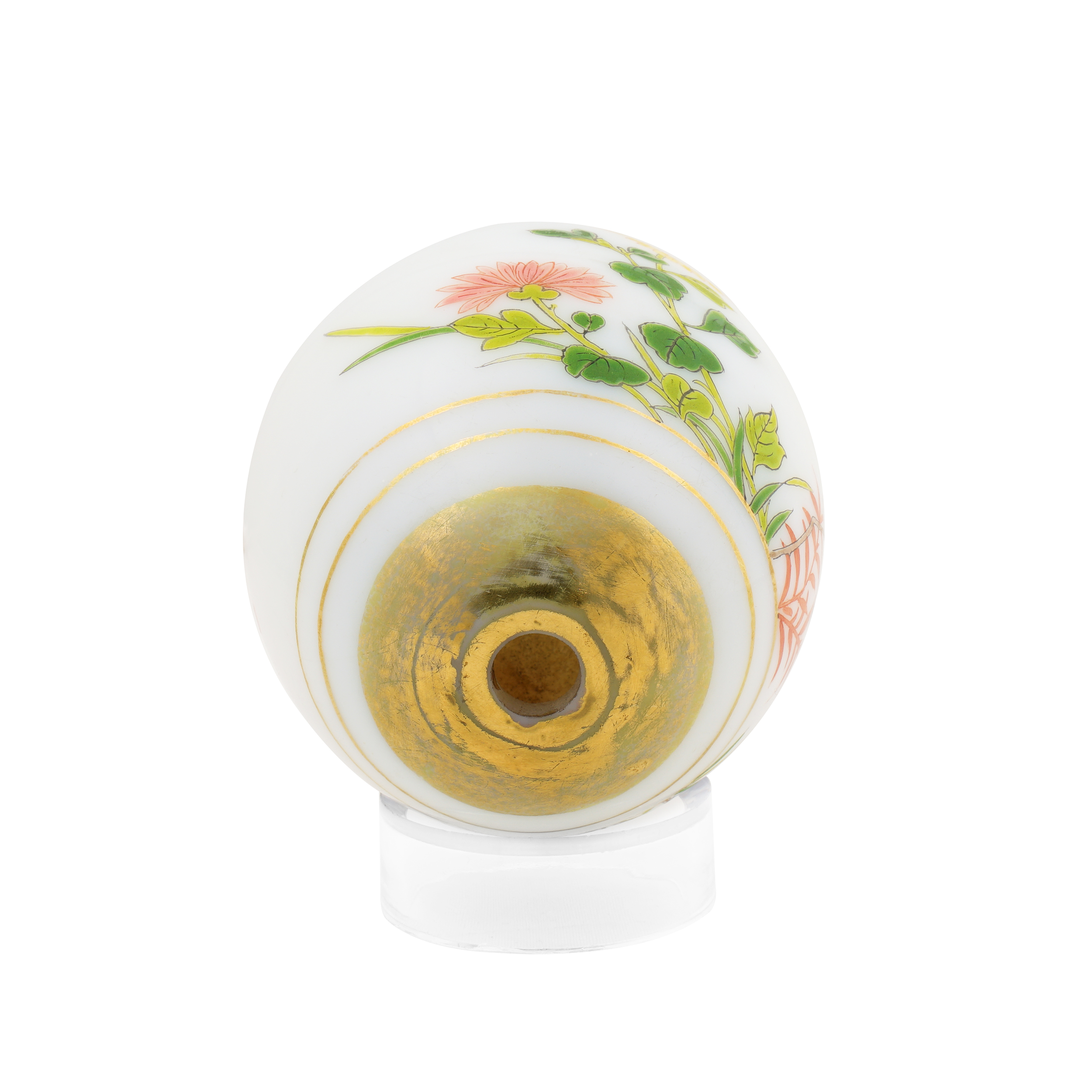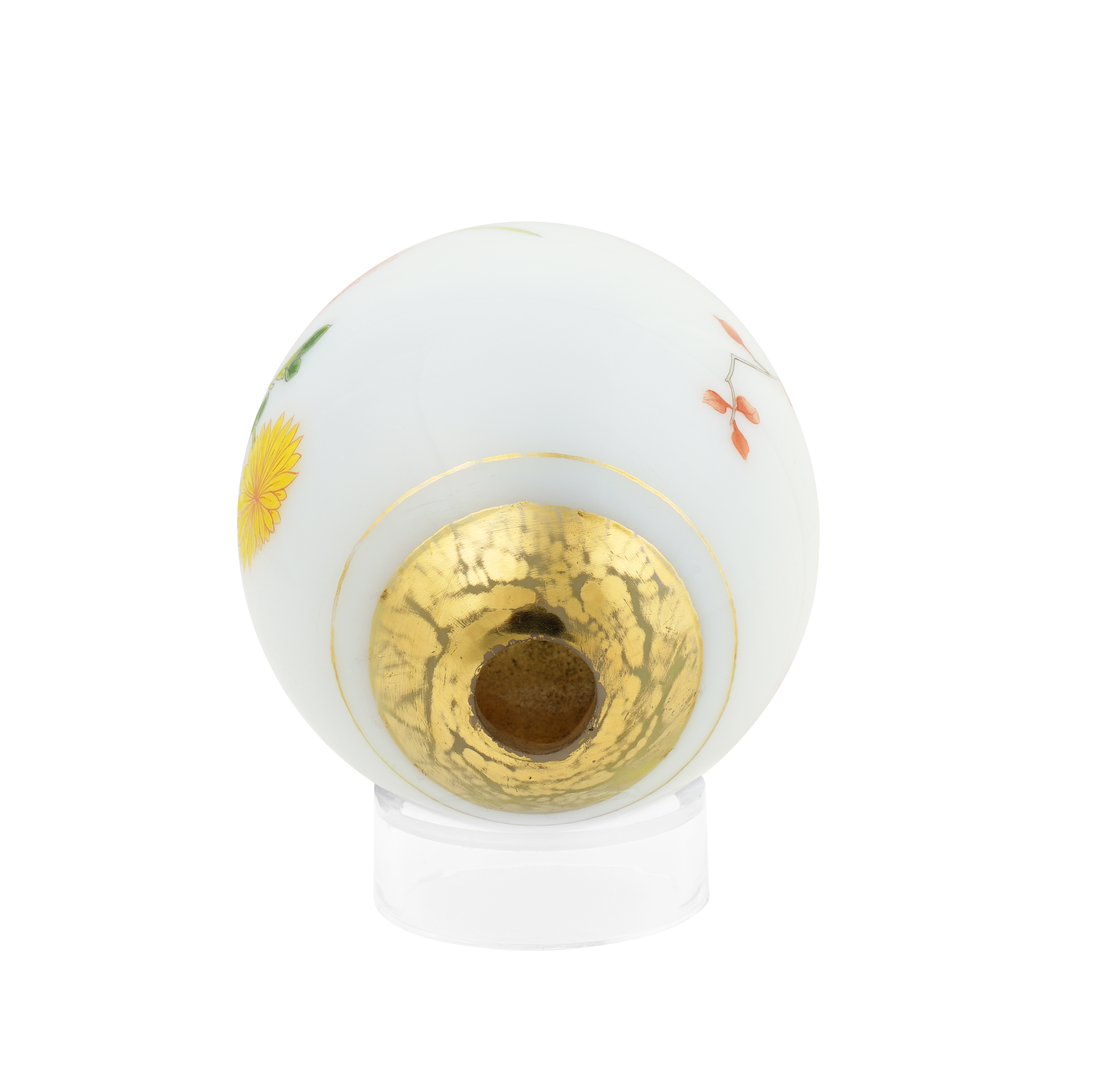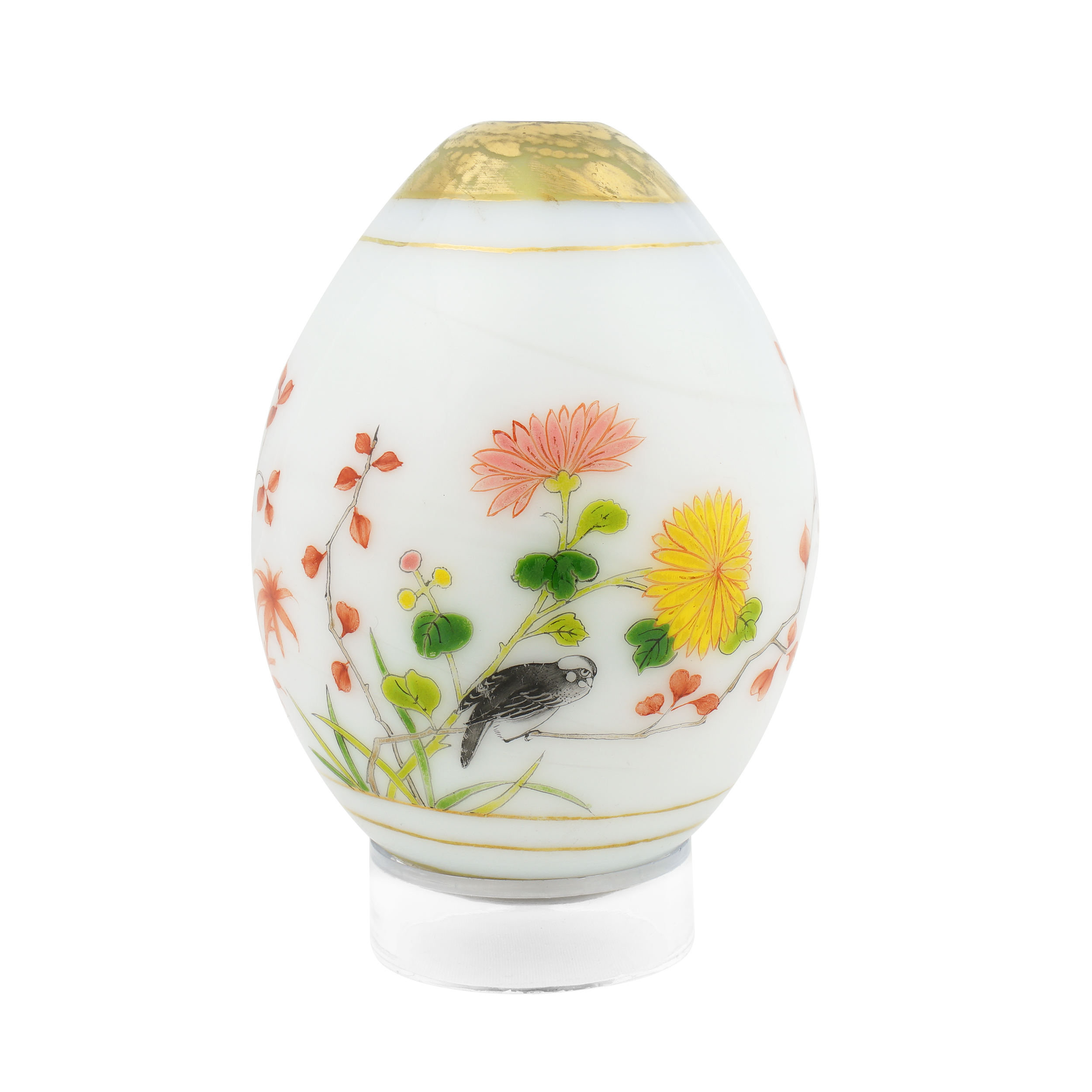 Молочное стекло, выдувание, шлифовка, полировка, полихромная роспись эмалевыми красками, золочение;