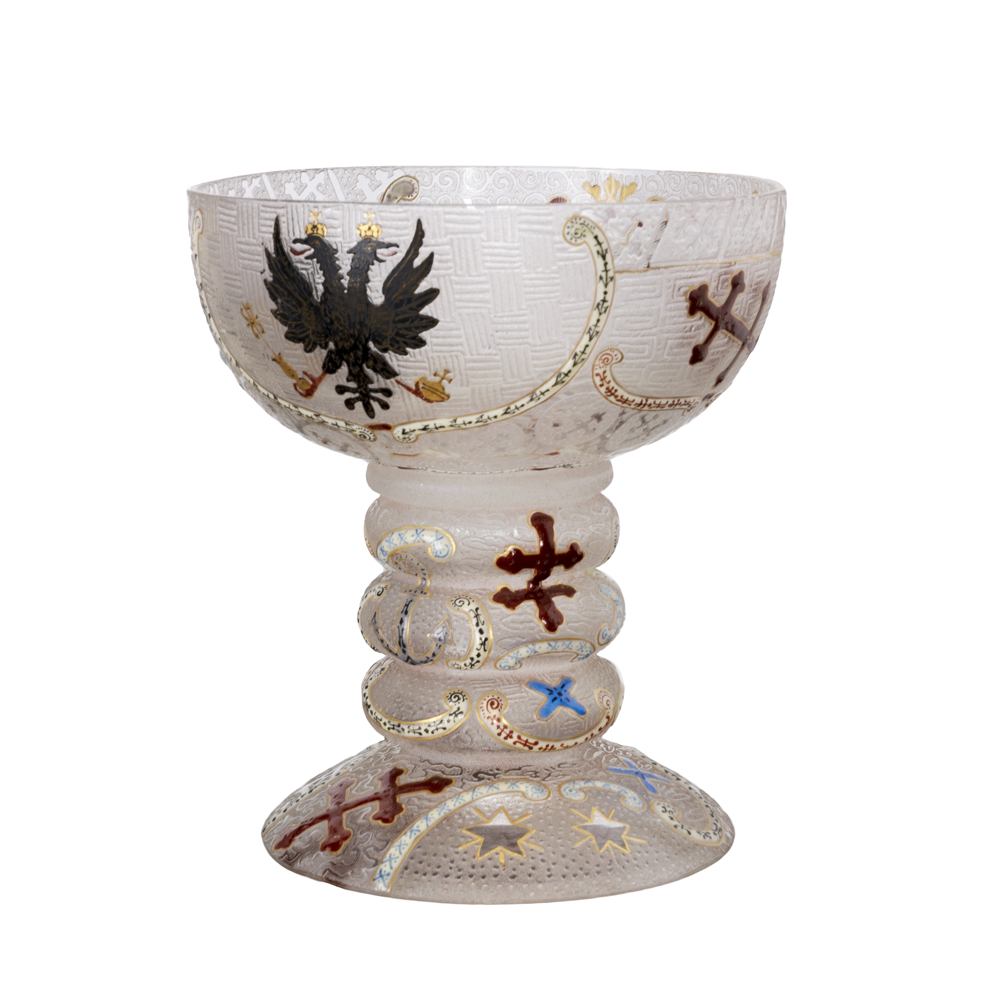 Выдувание в форму, травление, химическое матирование, полировка, гравировка, роспись эмалями, золочение. Высота - 10,6 см, диаметр по борту - 9,3 см, диаметр тулова - 7,7см. Марка: на дне ближе к центру надпись, выполненная красной эмалью: «Daum Nancy», разделённая лотарингским крестом.