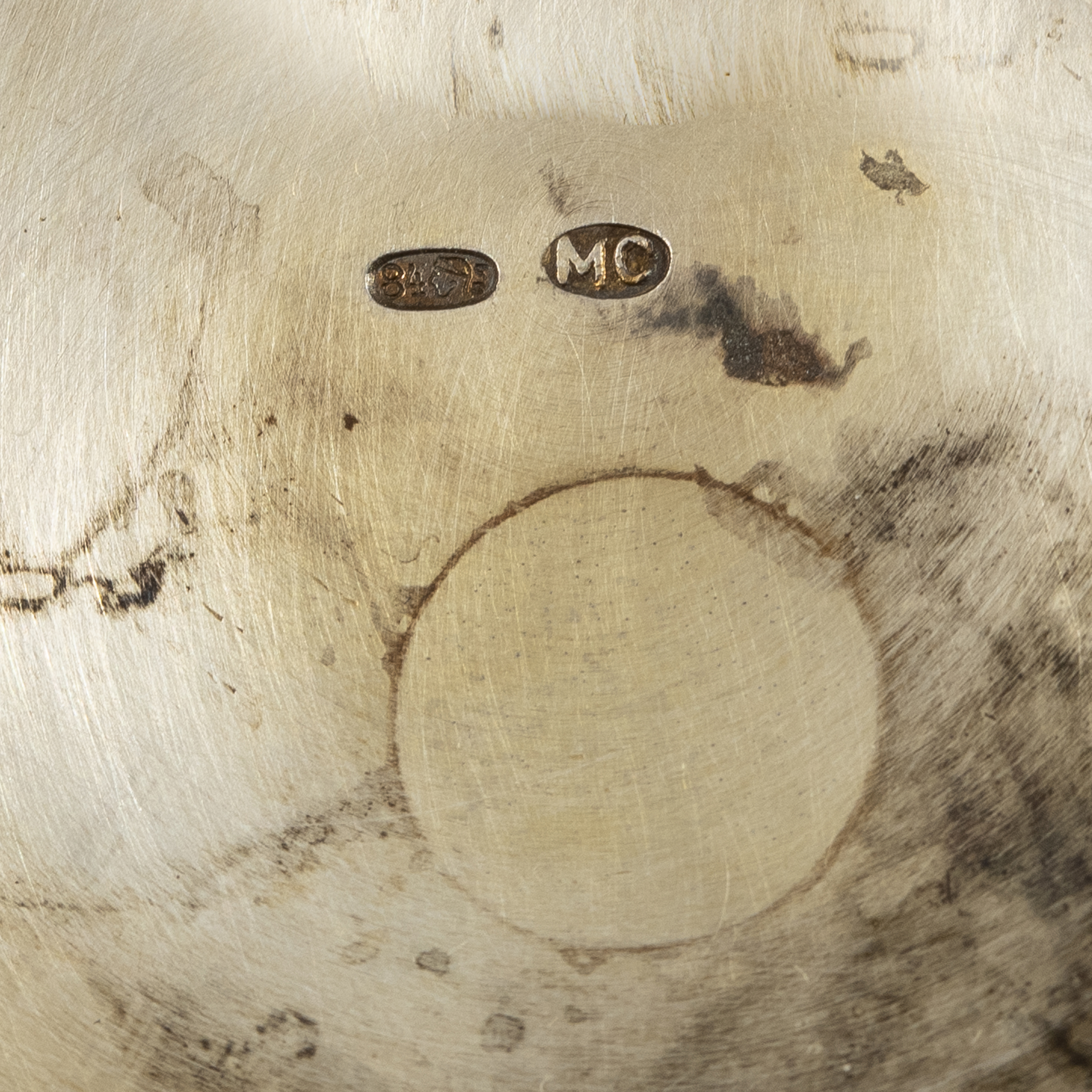 Клейма: 84 проба с «женской головой в кокошнике, обращенной влево» с инициалами пробирного инспектора московского округа «ИЛ» Ивана Лебедкина; клеймо «МС» - мастерская Марии Васильевны Семеновой.