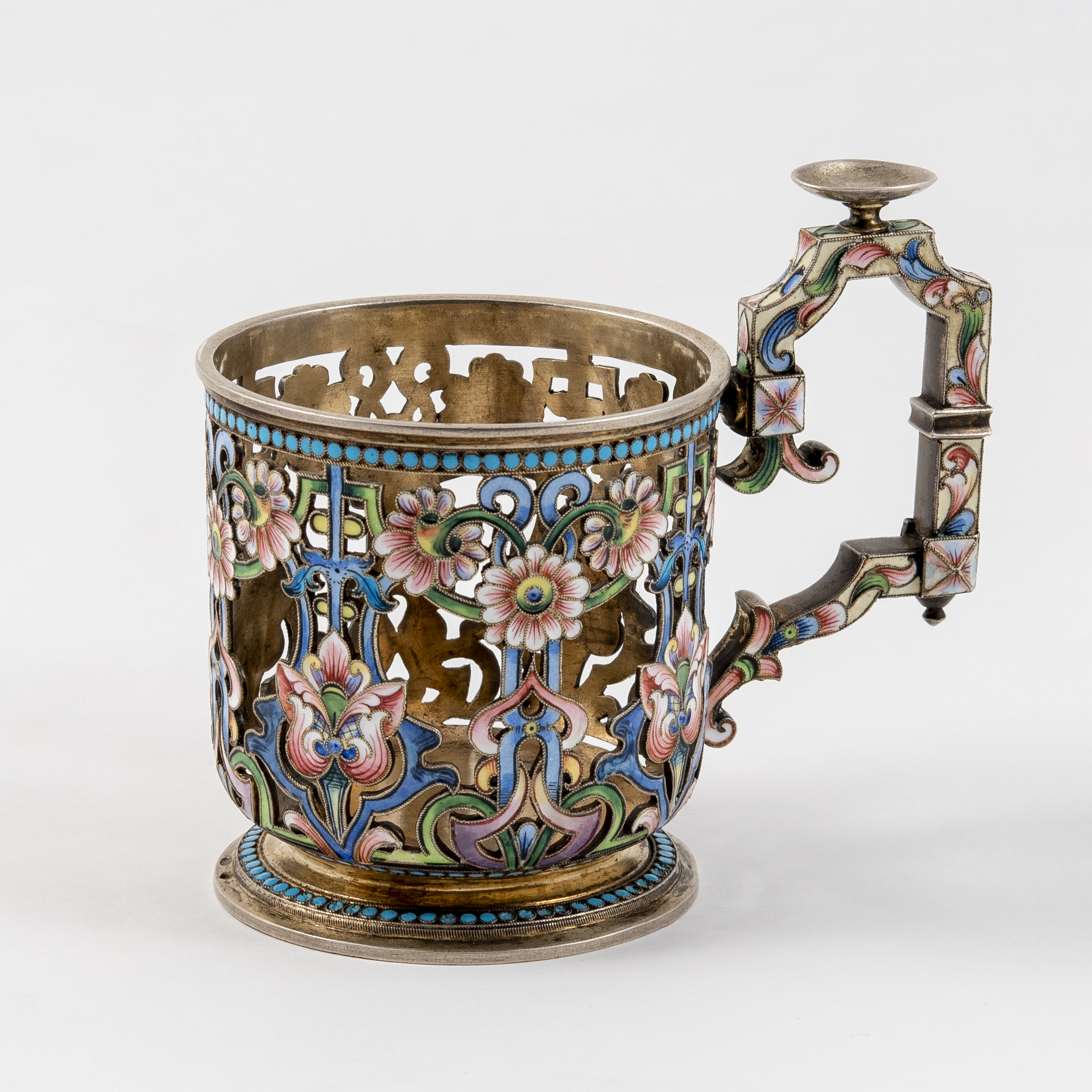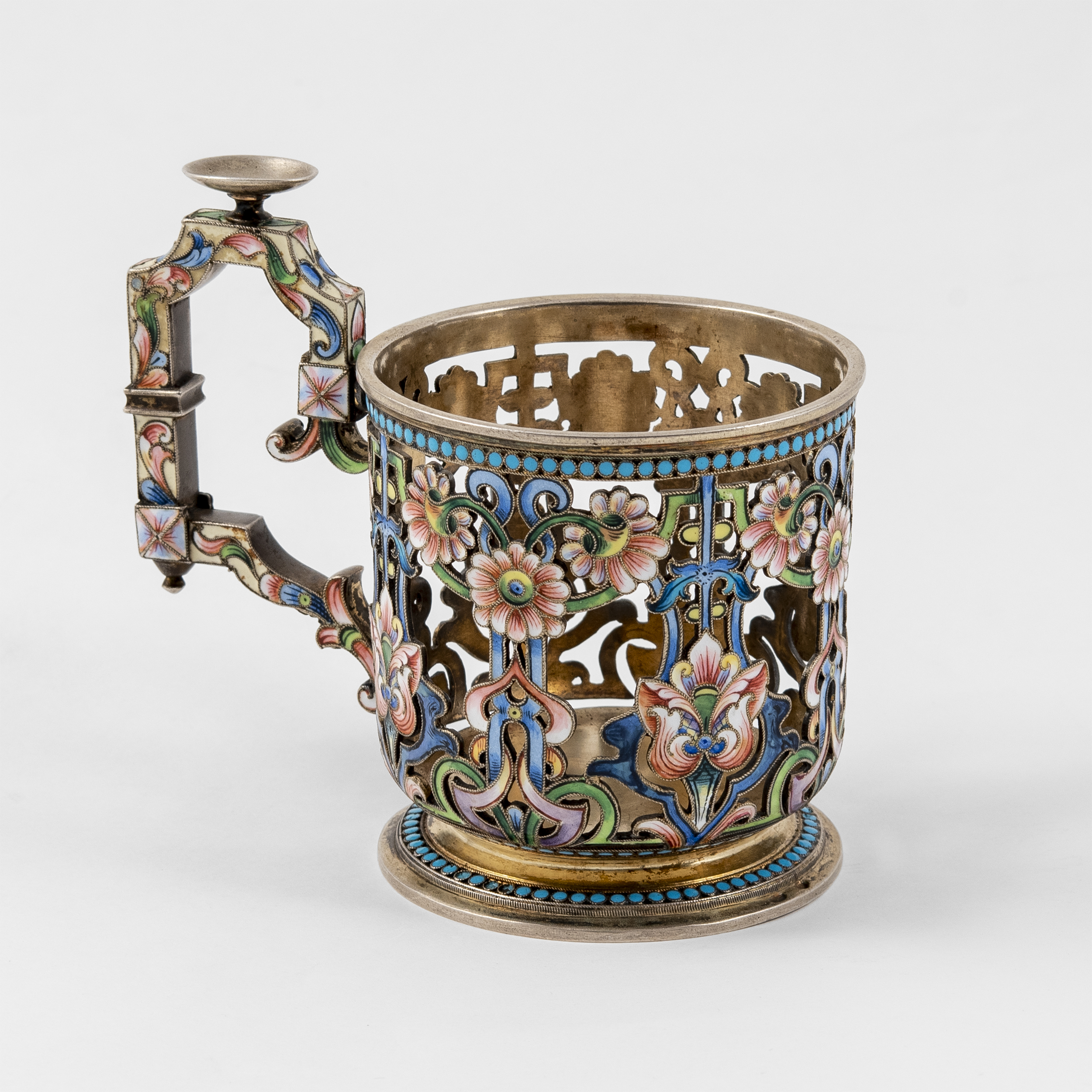 Серебро, литье, выпиловка, полихромные эмали в сканом обрамлении, резьба, золочение;