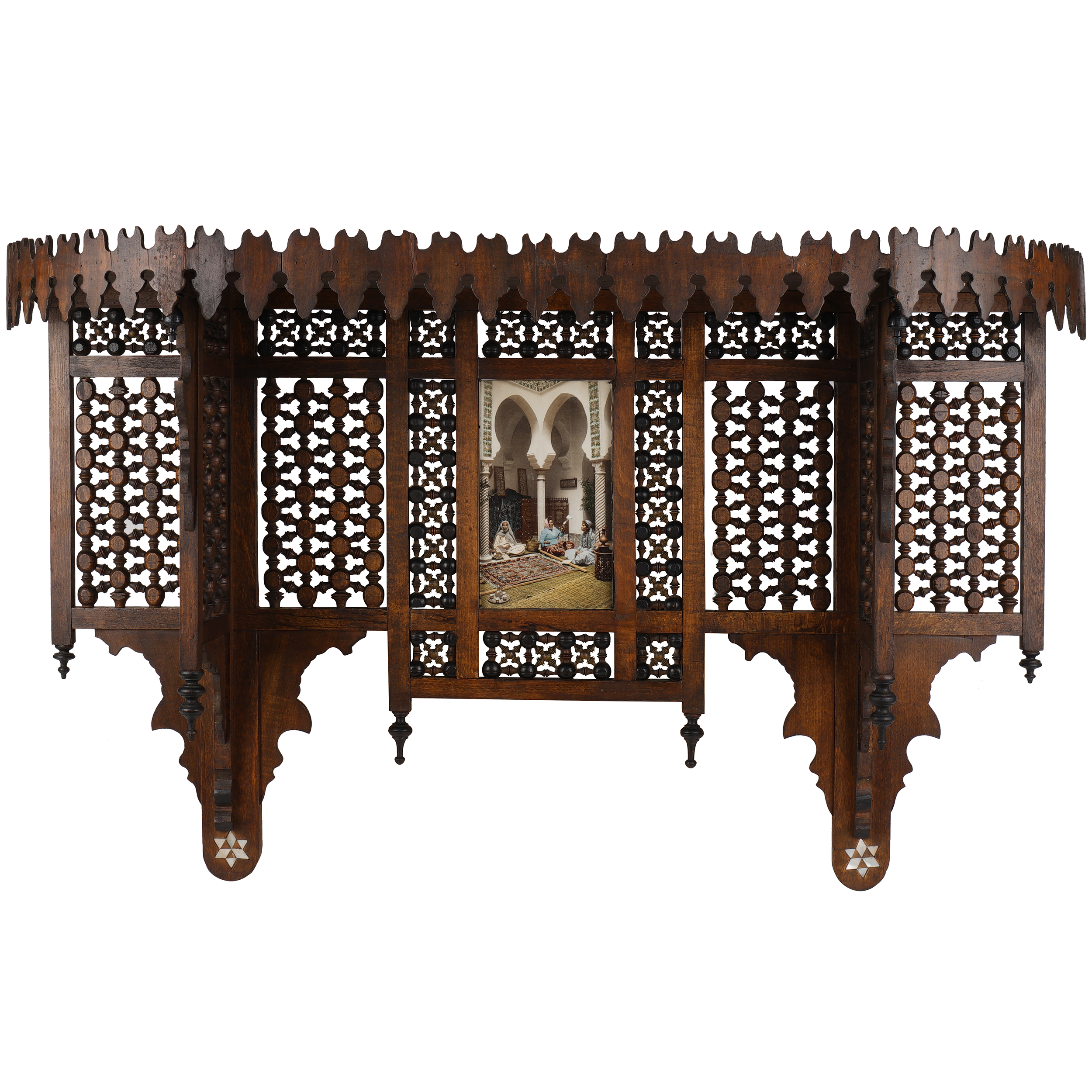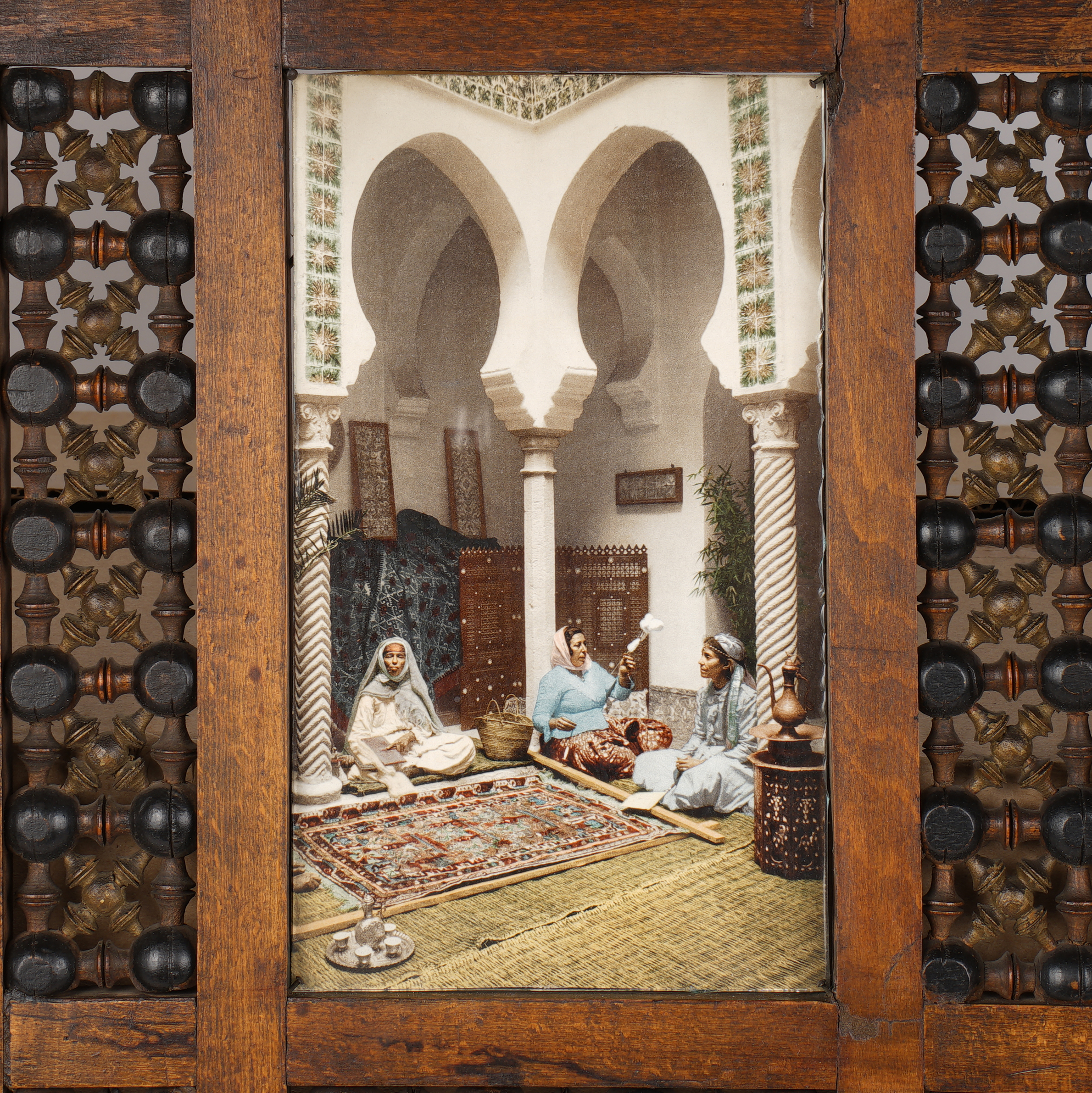 Дерево, резьба, машрабия, инкрустация перламутром, фотопечать "Мавританские женщины, изготавливающие арабские ковры" (с оригинальной цветной фотографии 1899 г.).