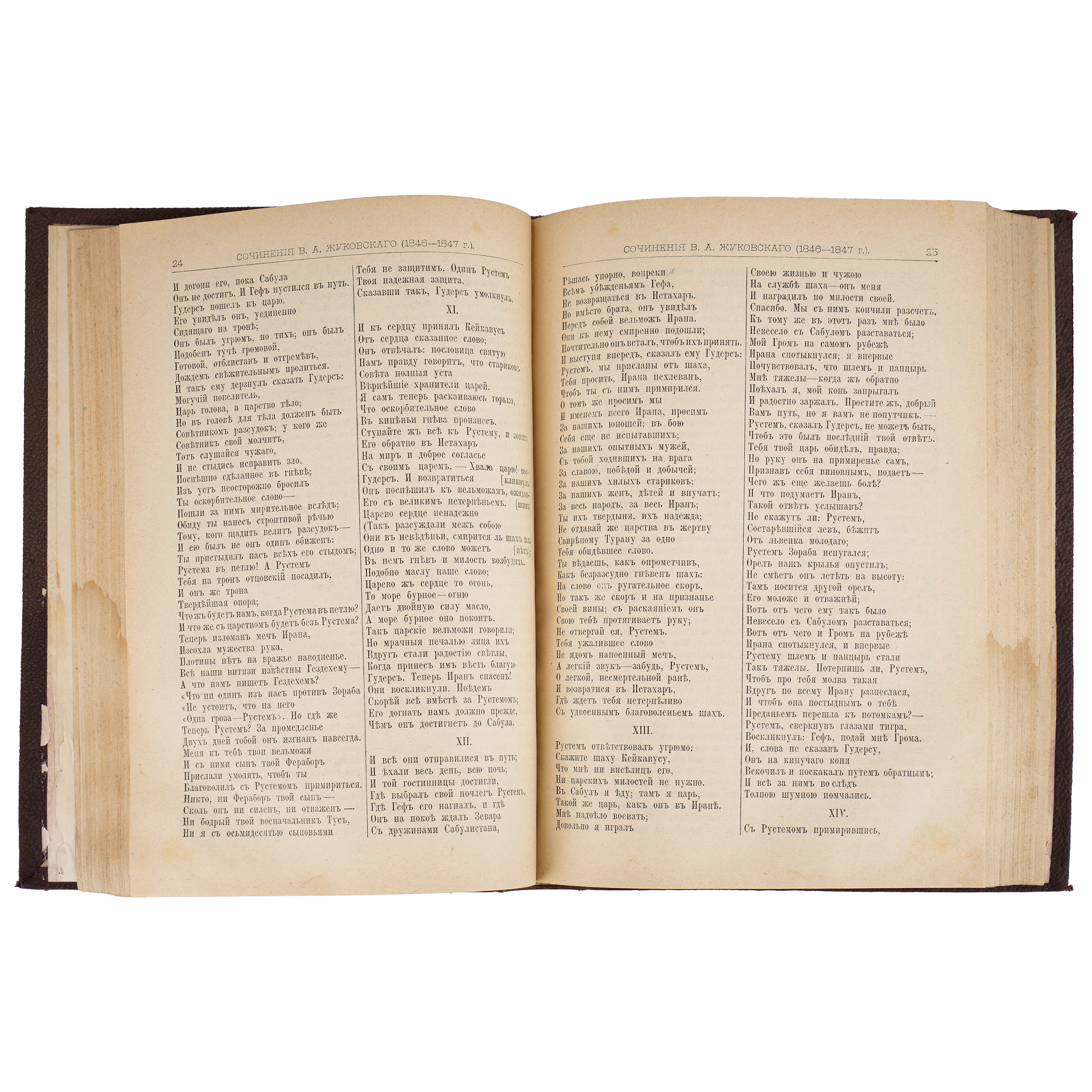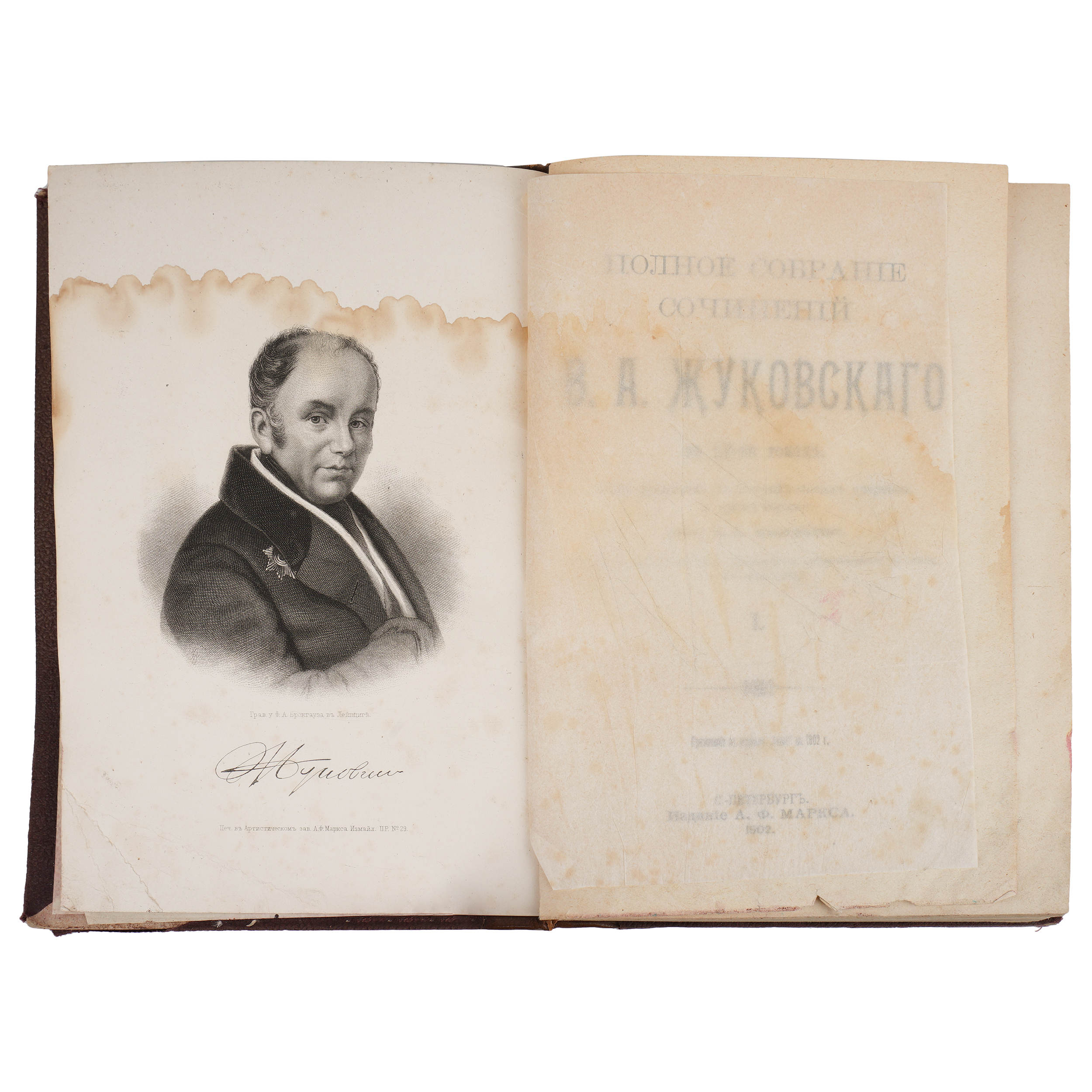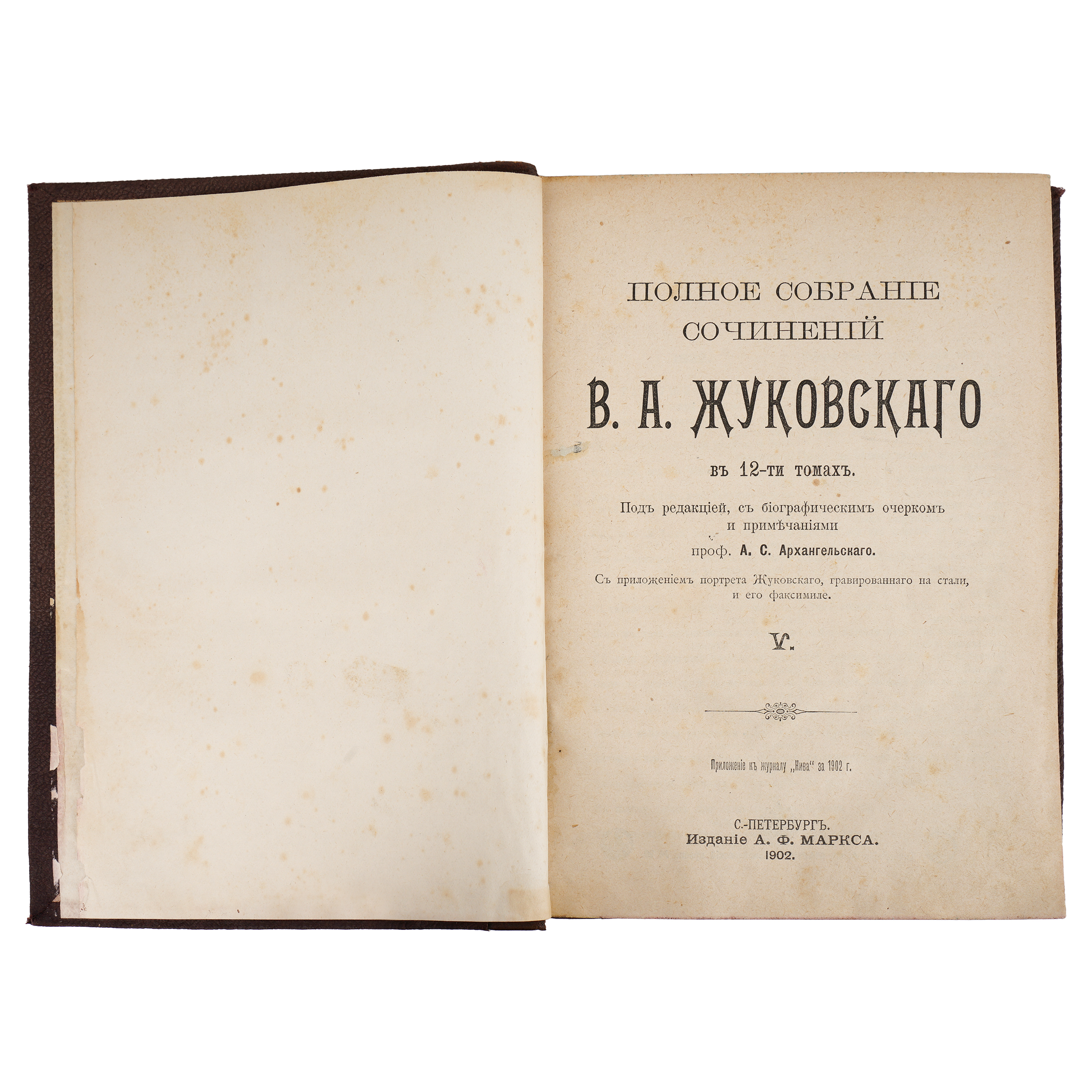 Комплект в трех переплётах. С приложением портрета Жуковского, гравированного на стали (грав. у Ф.А. Брокгауза в Лейпциге), и его факсимиле. Санкт-Петербург, издание А.Ф. Маркса, 1902 год. Под редакцией, с биографическим очерком и примечаниями профессора истории русской литературы, член-корреспондента Императорской академии наук А.С.Архангельского.