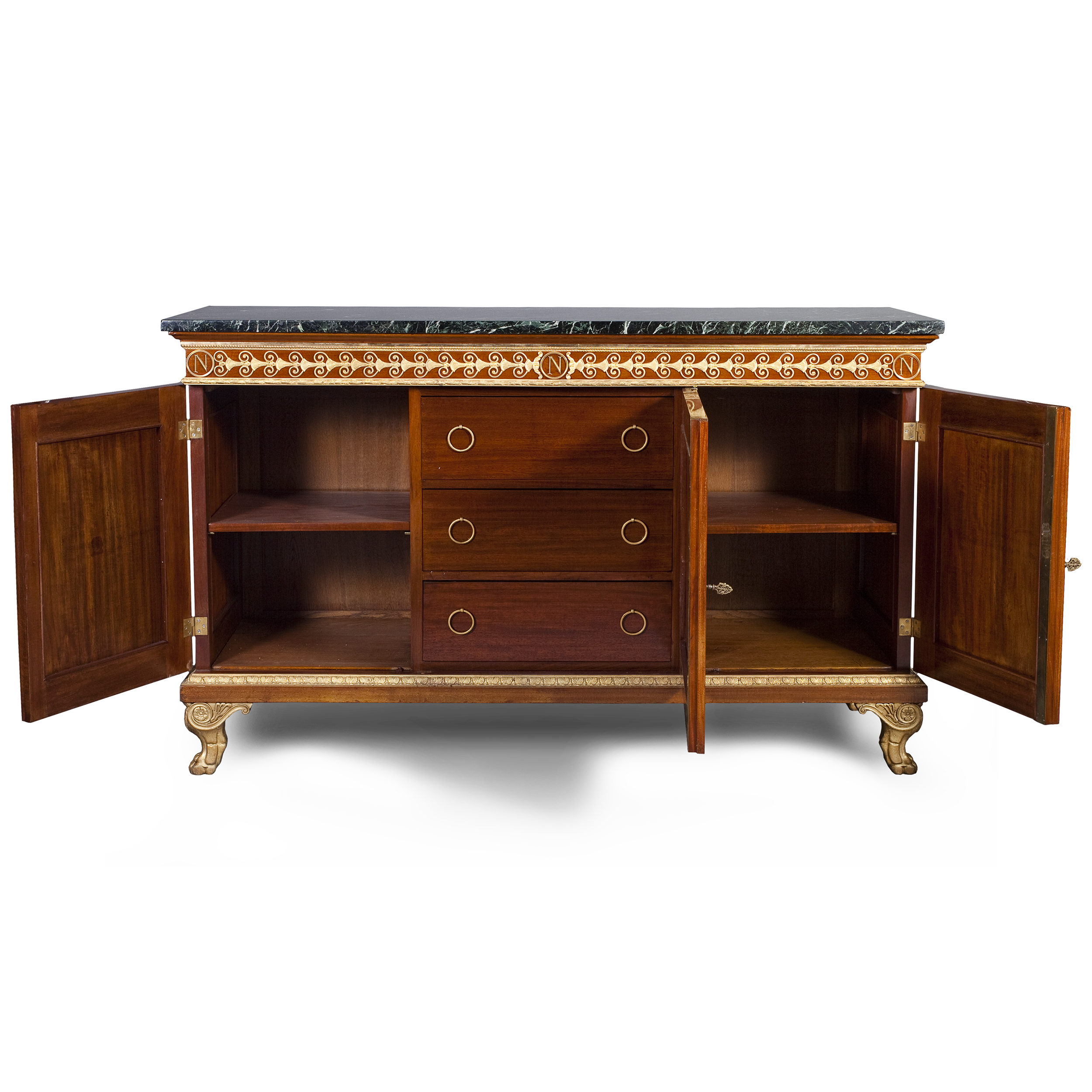 Дуб (основа), фанеровка красным деревом, бронза, золочение, мраморная столешница, Франция, вторая половина XIX века, размер (в/ш/г): 100 х 164 х 60 см