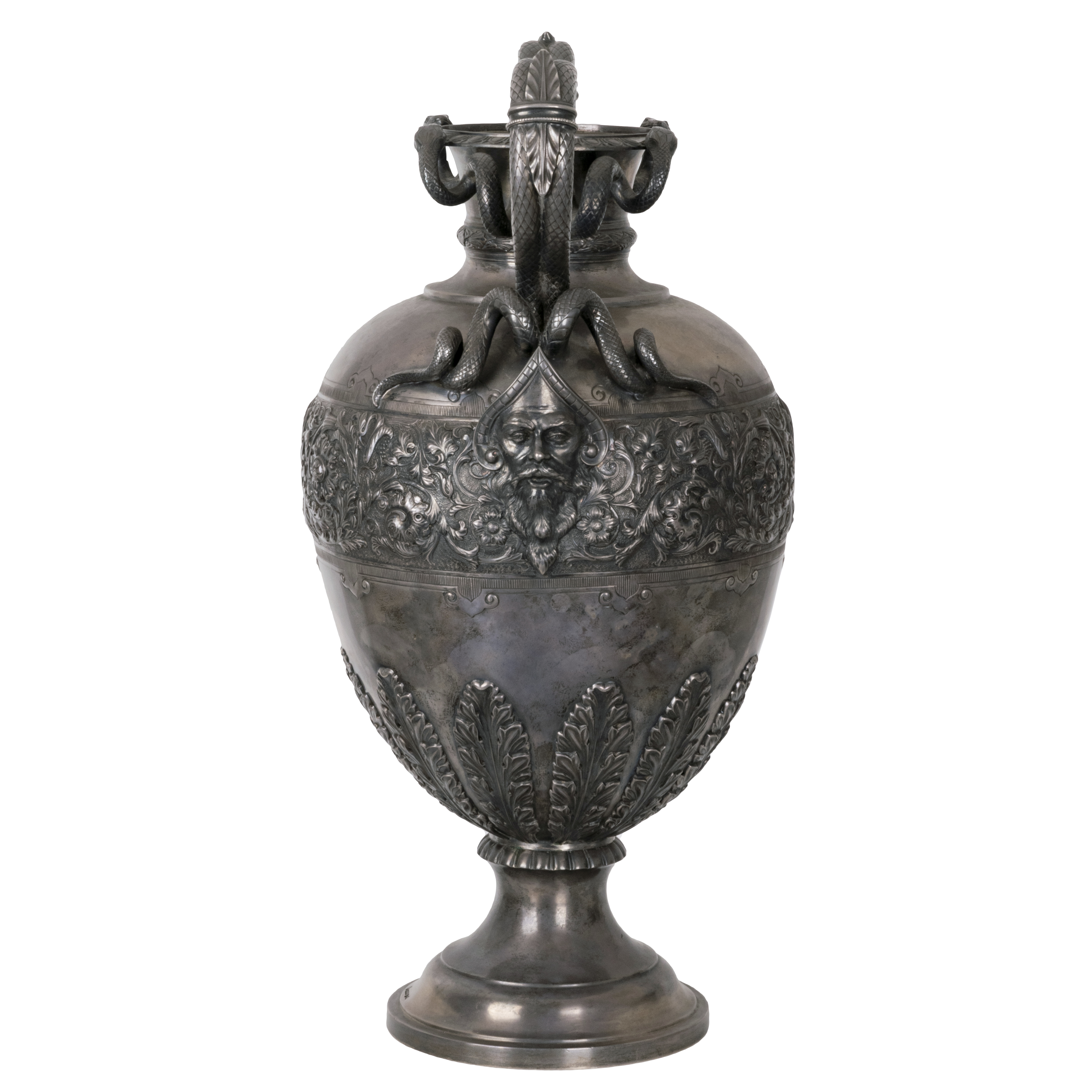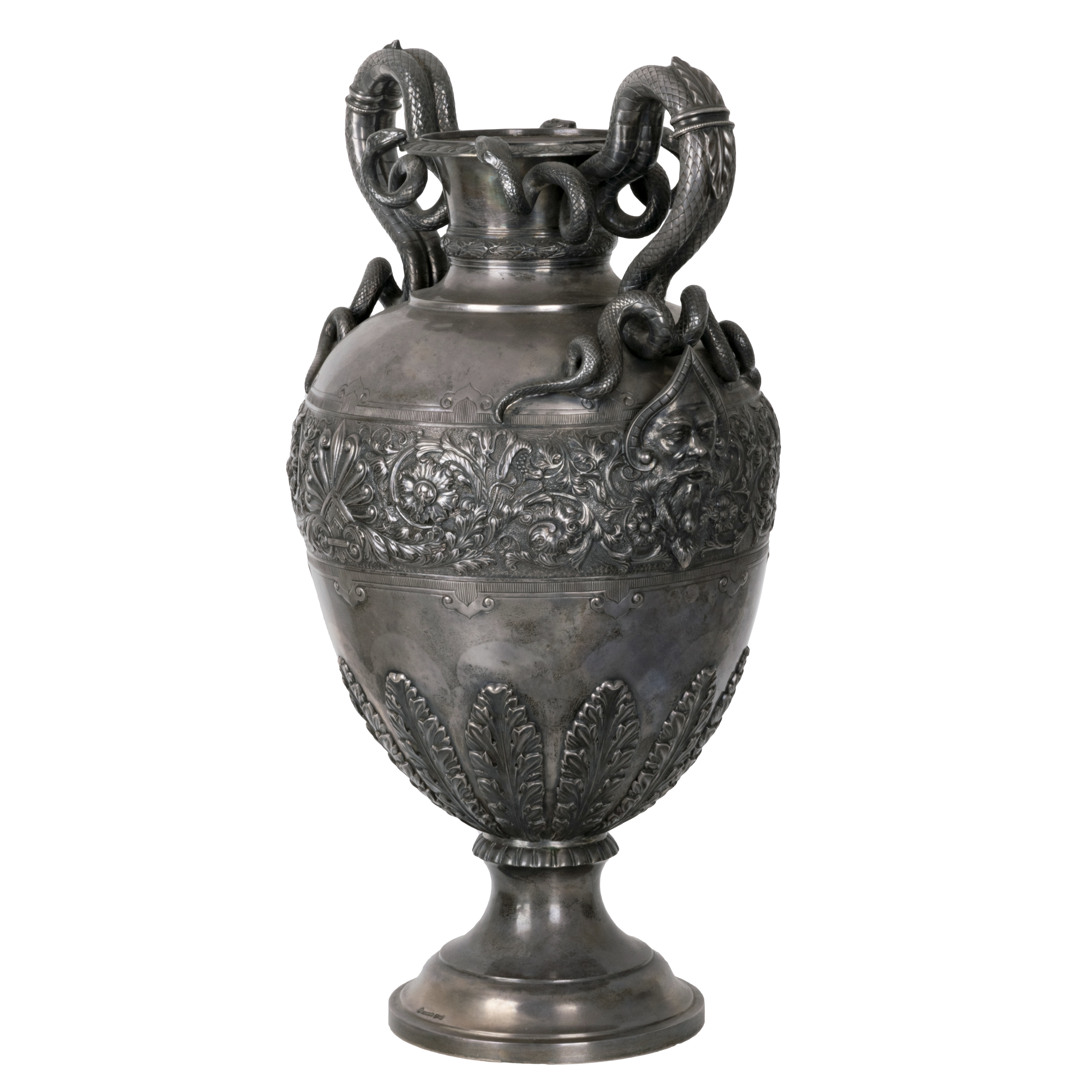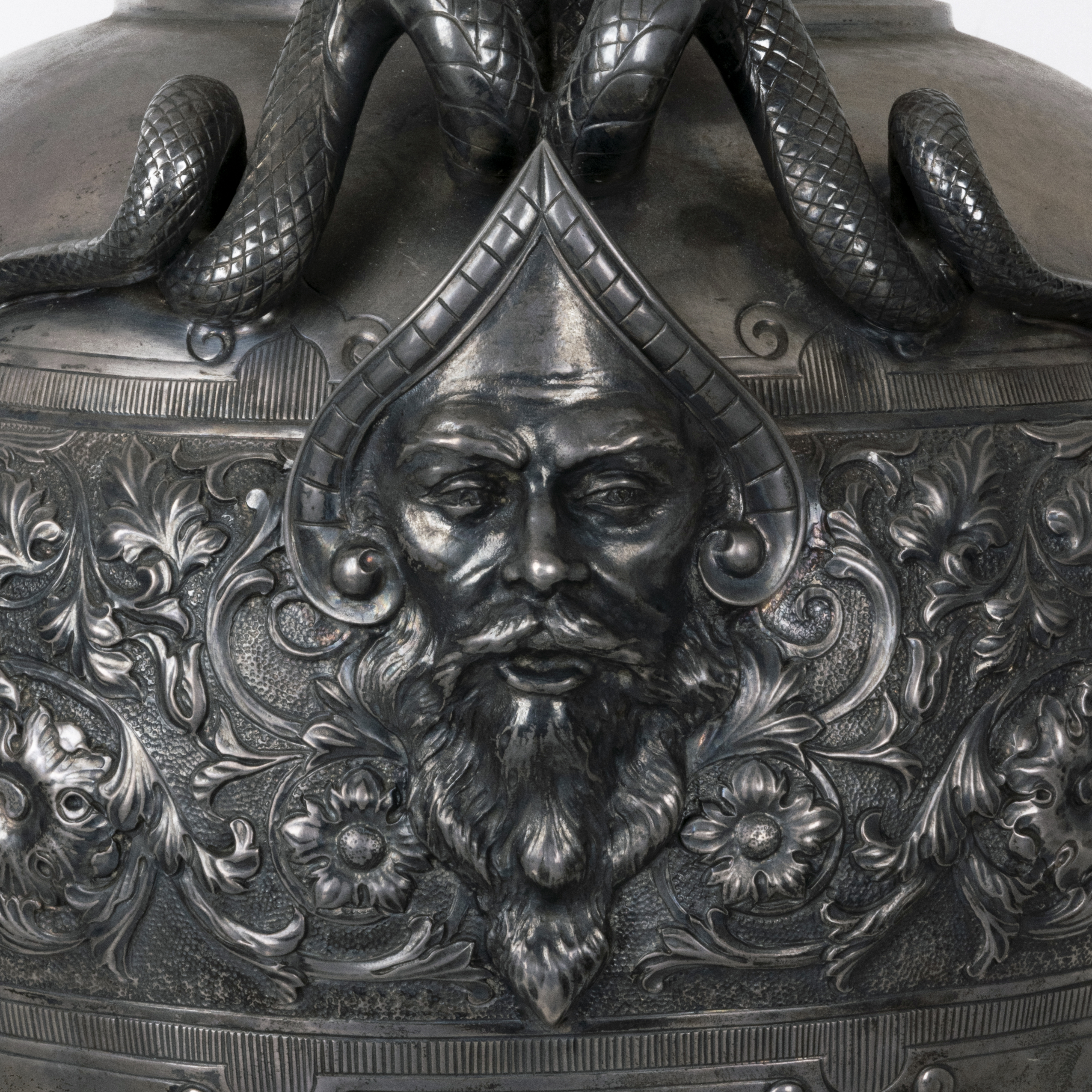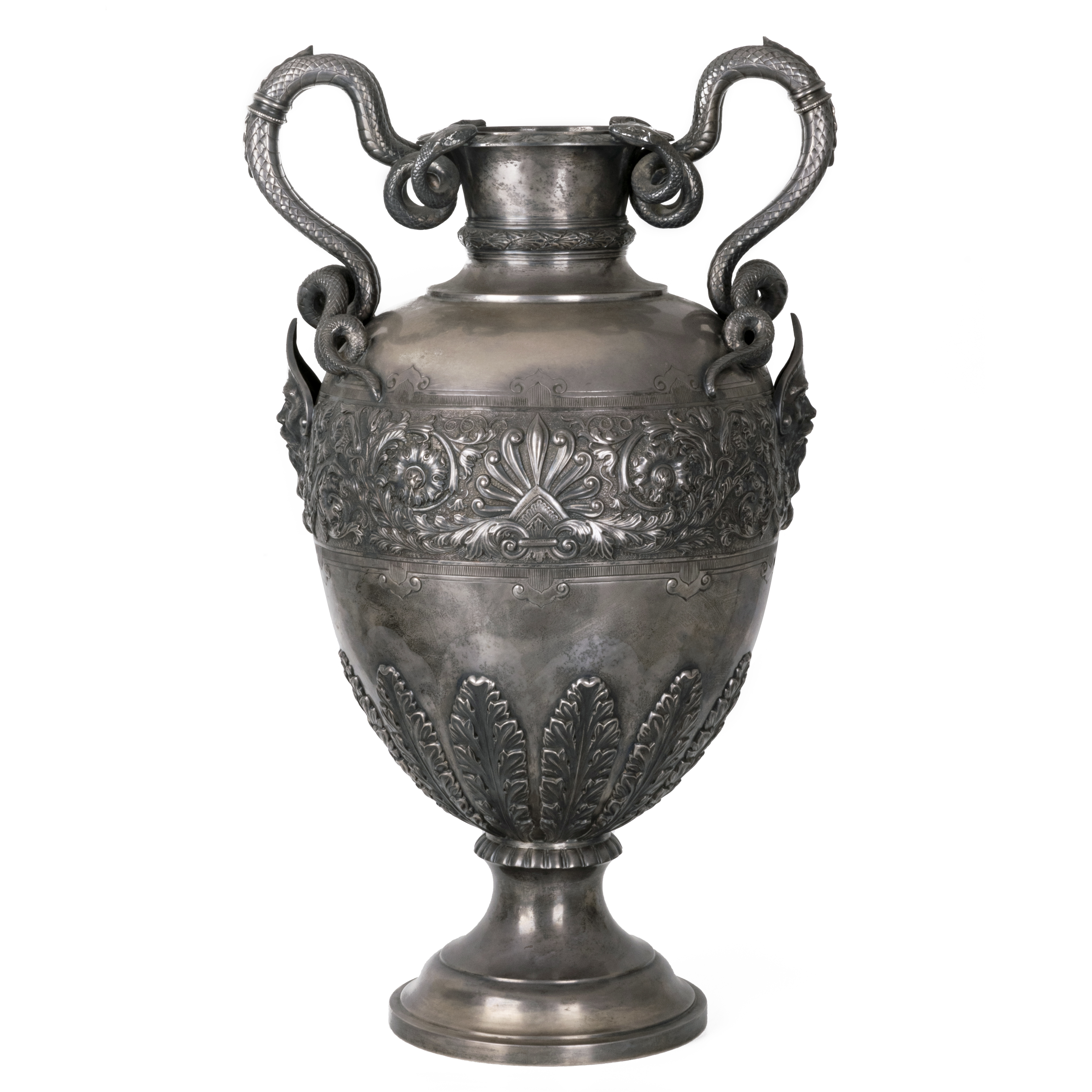 Серебро, литье, чеканка, выколотка, канфарение, полировка. Клейма - САЗИКОВ/Ь, двуглавый орел (герб Росскийской Империи, зкак придворного поставщика), А.К./ 1848 (пробирный мастер Ковальский Андрей Антонович, 1821-1856). 84, св. Высота - 62 см. Вес - 9.030 кг