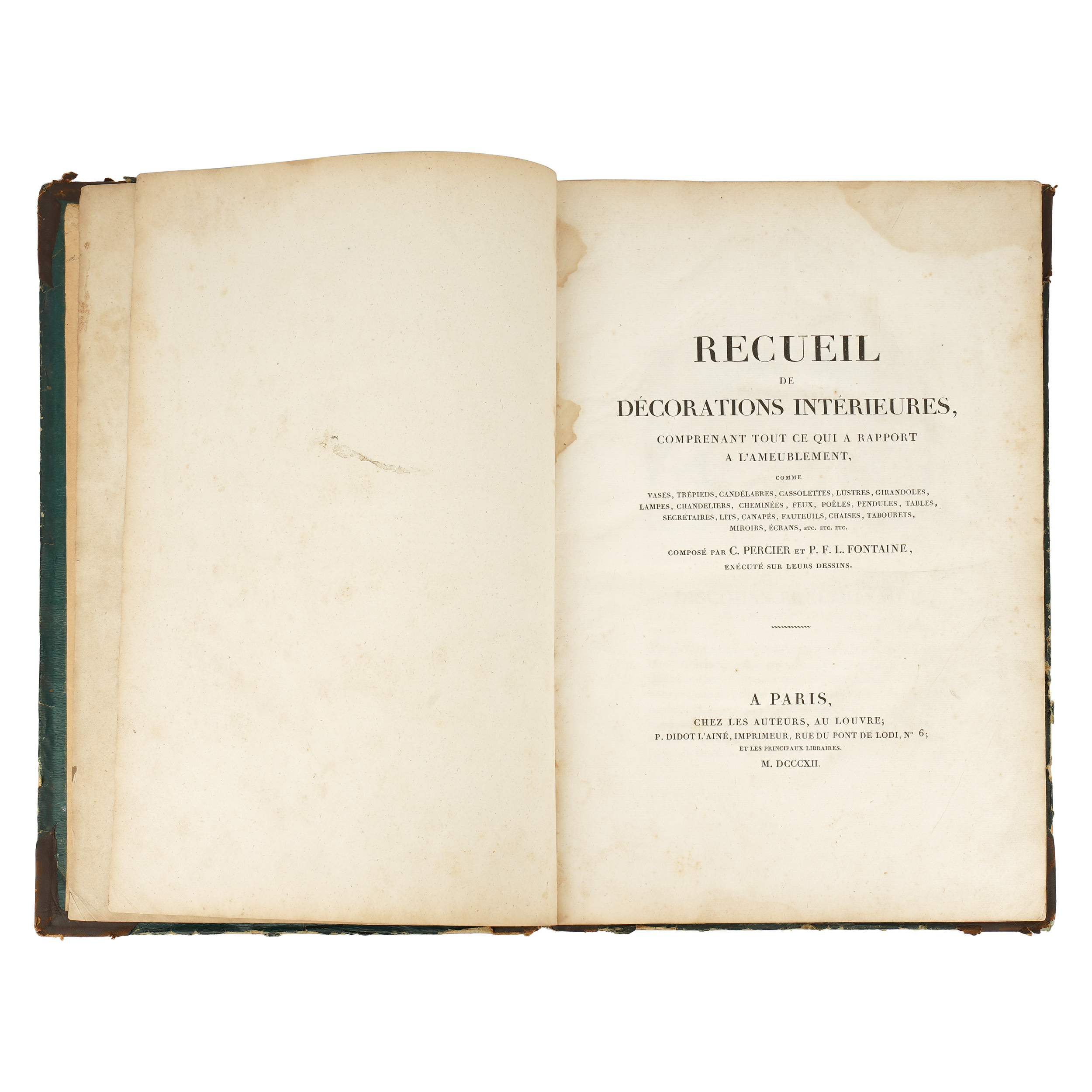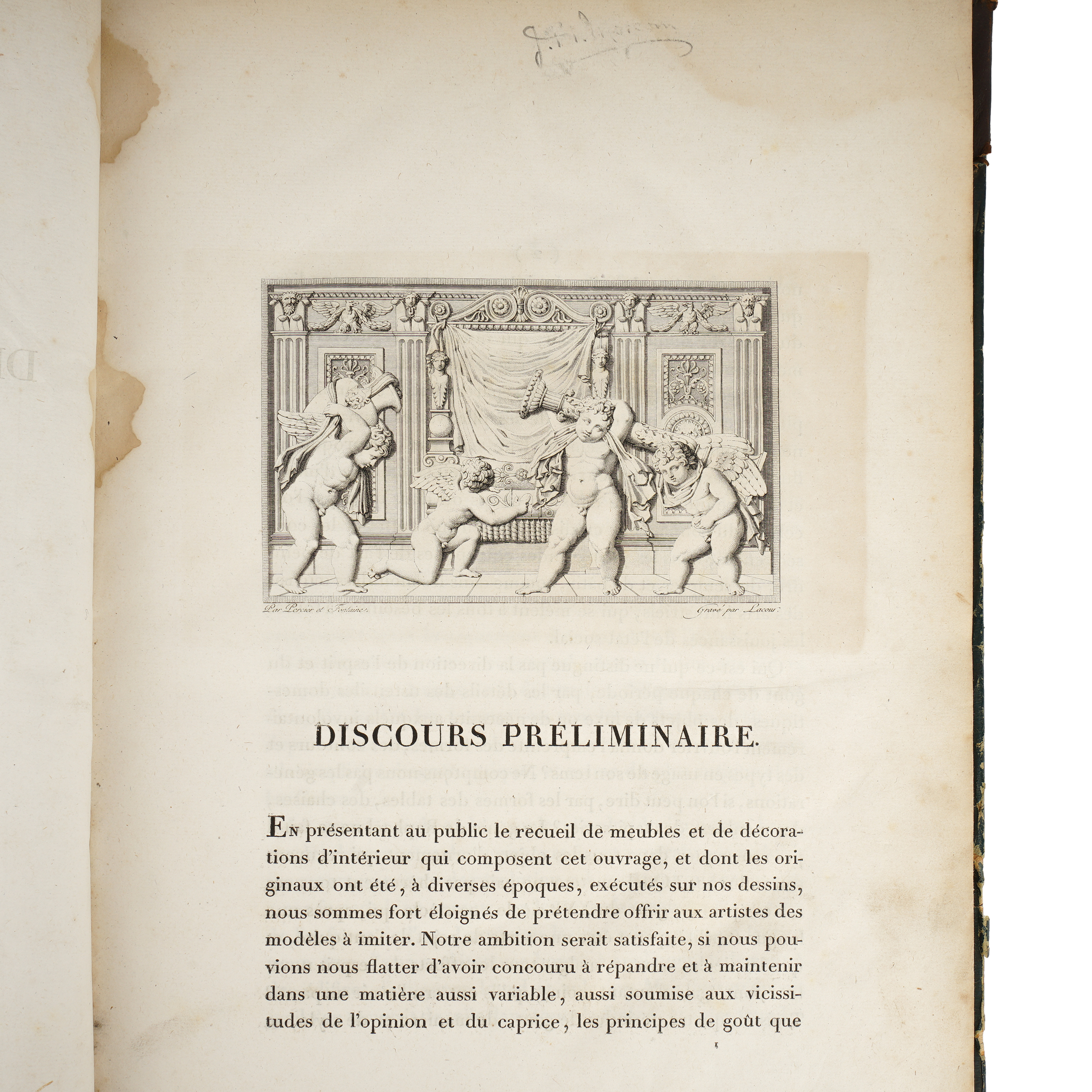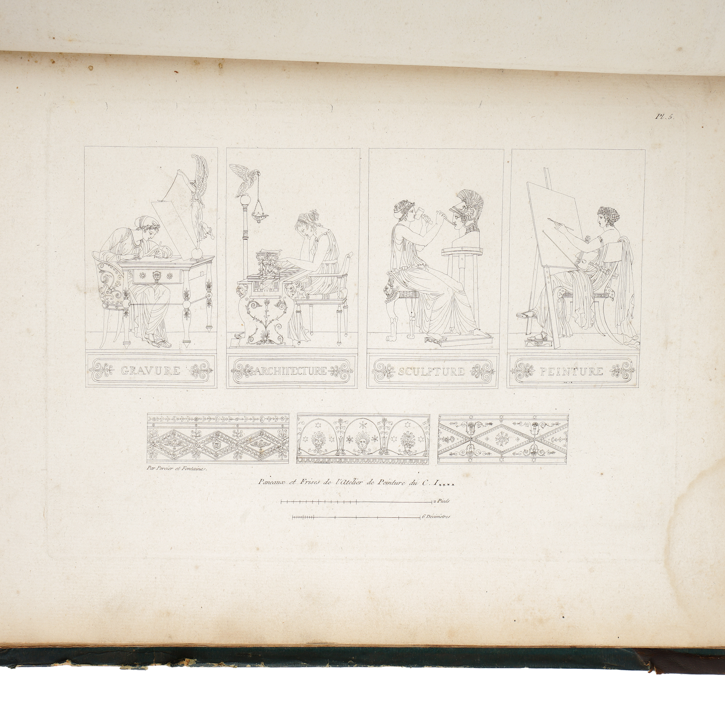 Издание, посвященное орнаментальным гравюрам с проектами для декорировки интерьеров ведущих французских архитекторов и художников-орнаменталистов Дюгура, Бертольда, Шарля Персье и Пьера-Франсуа Фонтена. В полукожаном переплете с золотым тиснением по корешку. Формат: 41 х 27,5 см.