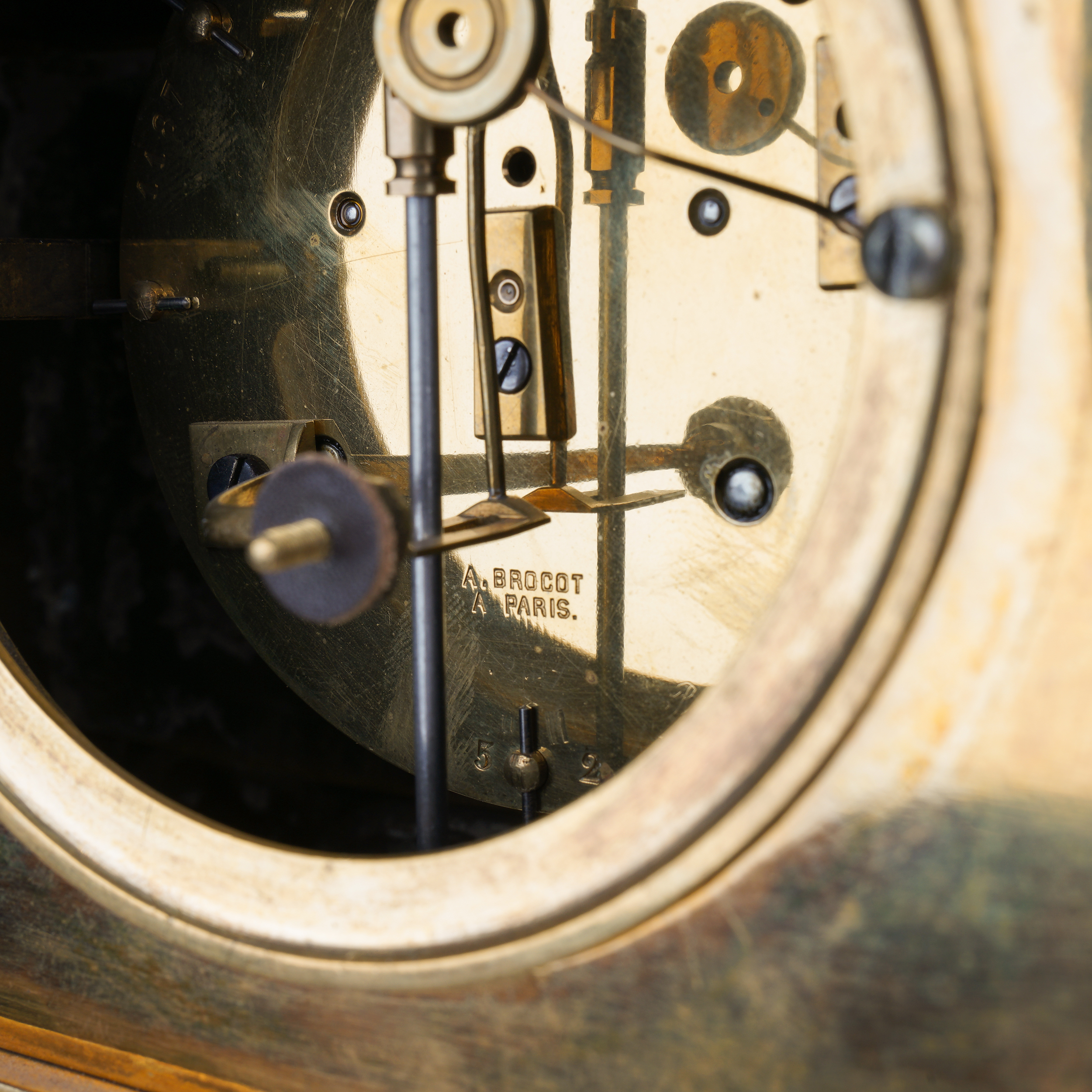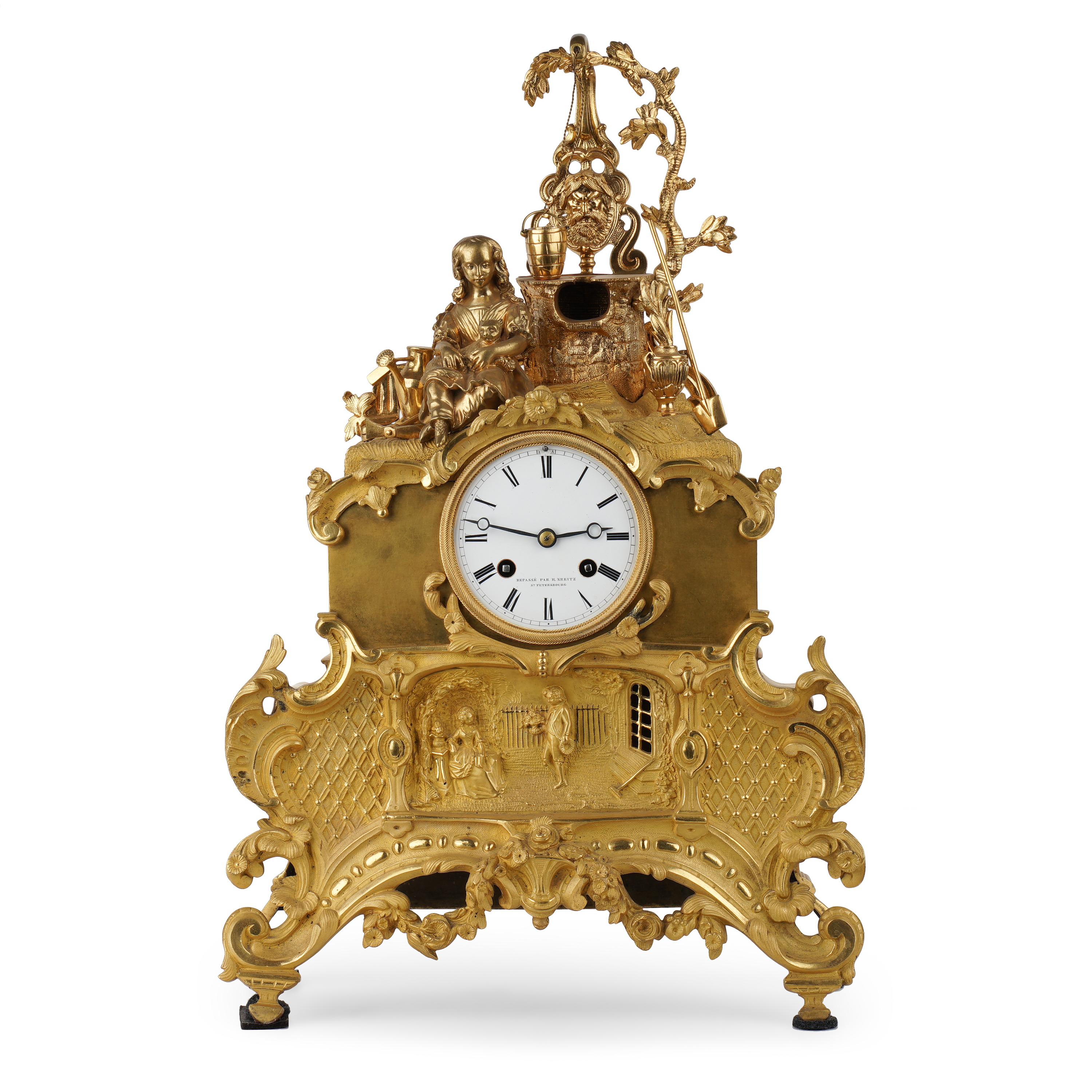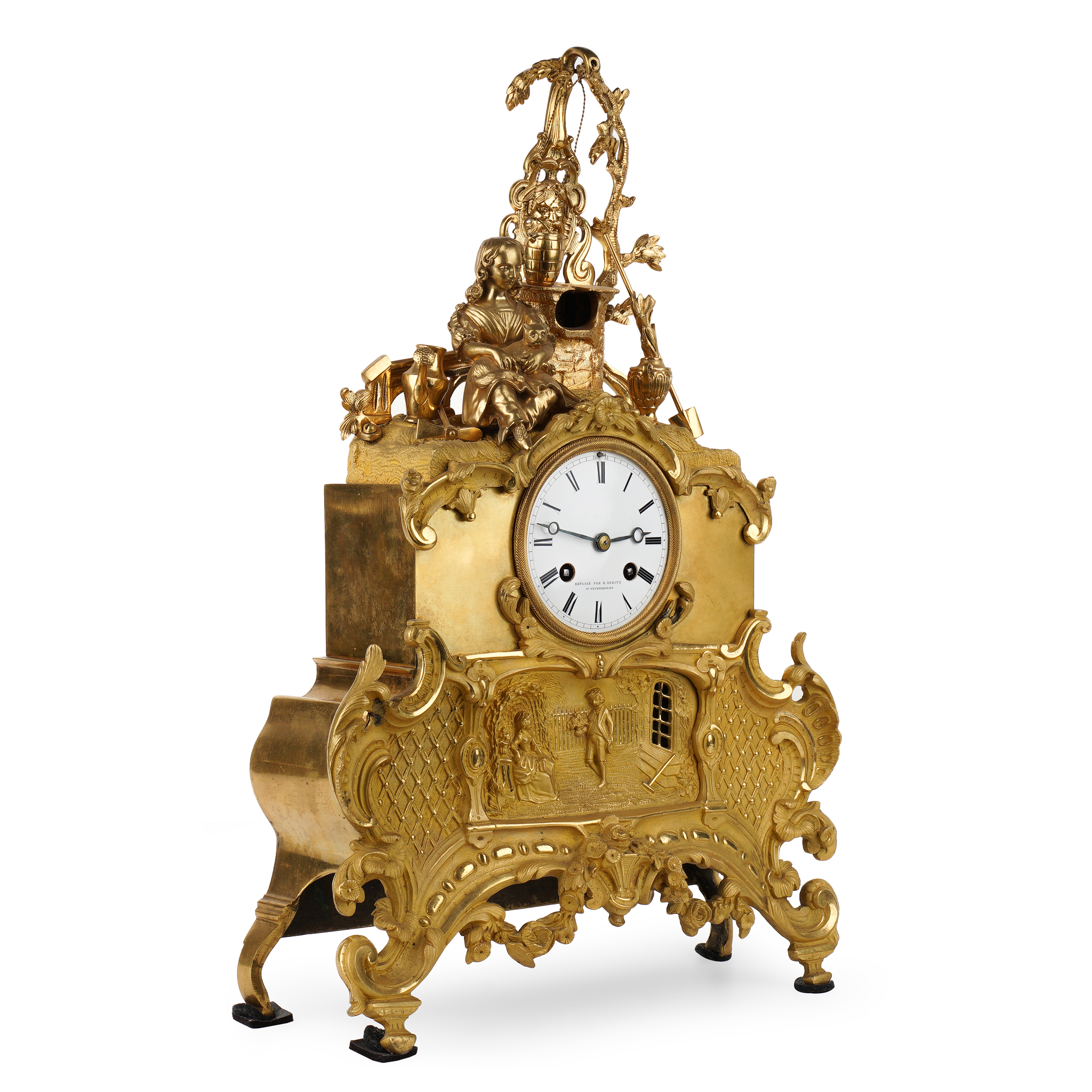 Бронза, литье, чеканка, огневое золочение, эмалевый циферблат с римскими цифрами часов и делением на минуты, стальные вороненые стрелки. На плате часового механизма штамп: «Brocot a Paris» (комплектующие детали механизма поставлялись из Франции фабрикой Броко), надпись на циферблате: «Repasse par H.Kreitz. St. Petersbourg» часовой мастерской Губерта Крейца, ученика Бреге, работавшего в Париже и Лондоне, а с начала 1840-х годов в Санкт-Петербурге. На обратной стороне корпуса штамп-клеймо «S. Well. St. Petersbourg» бронзолитейной мастерской Самуила Веля. Размер (в/ш/г): 45,5 х 32,8 х 16,2 см.