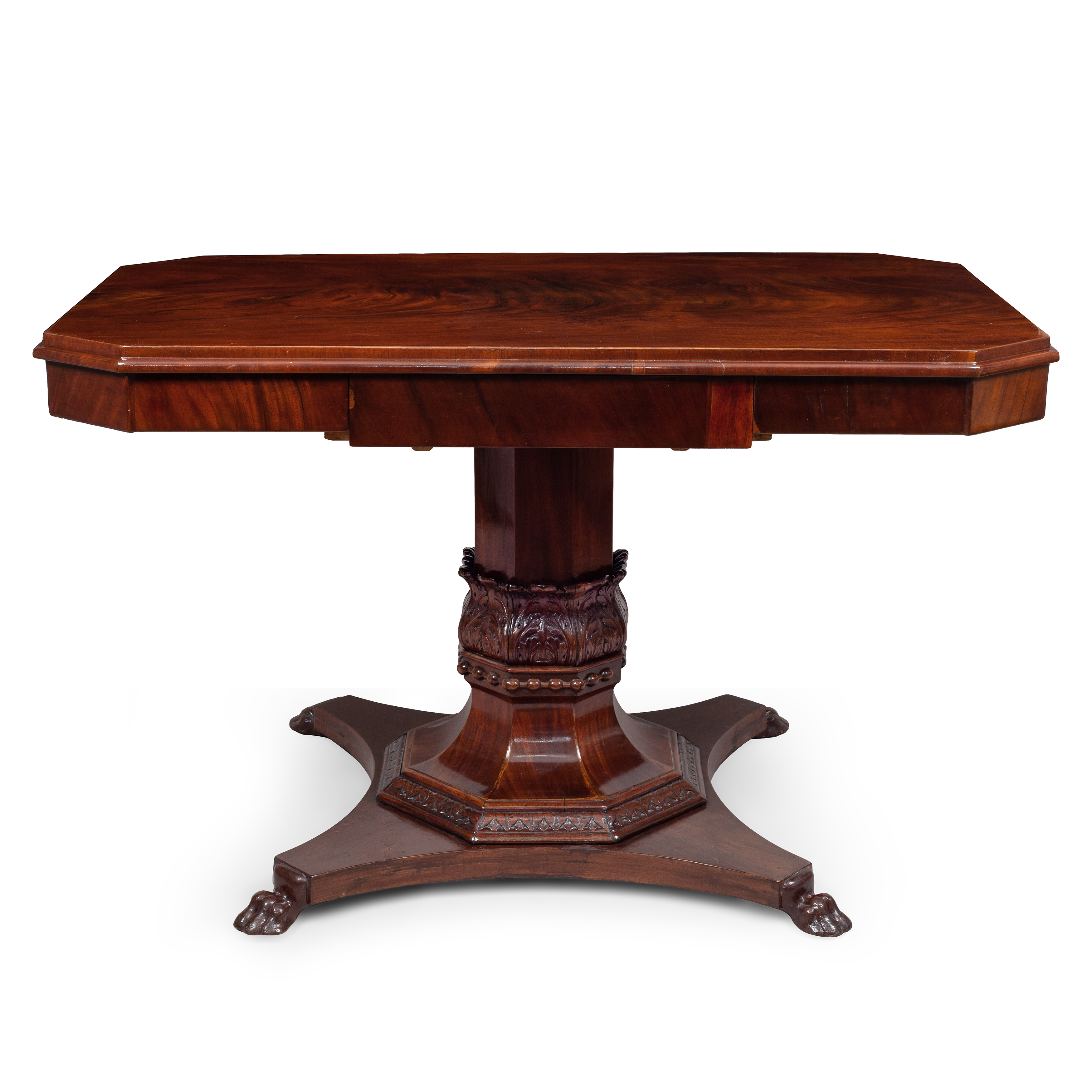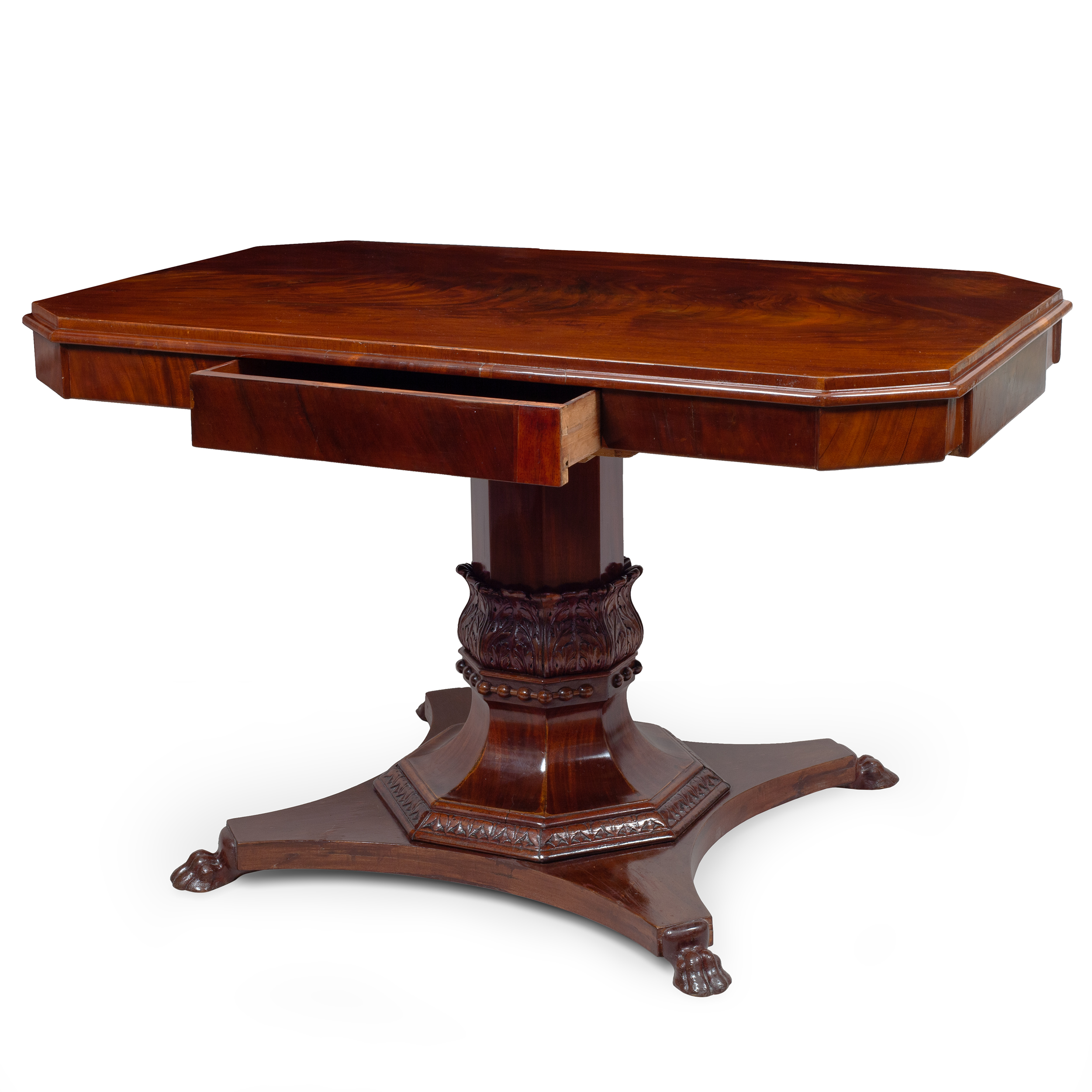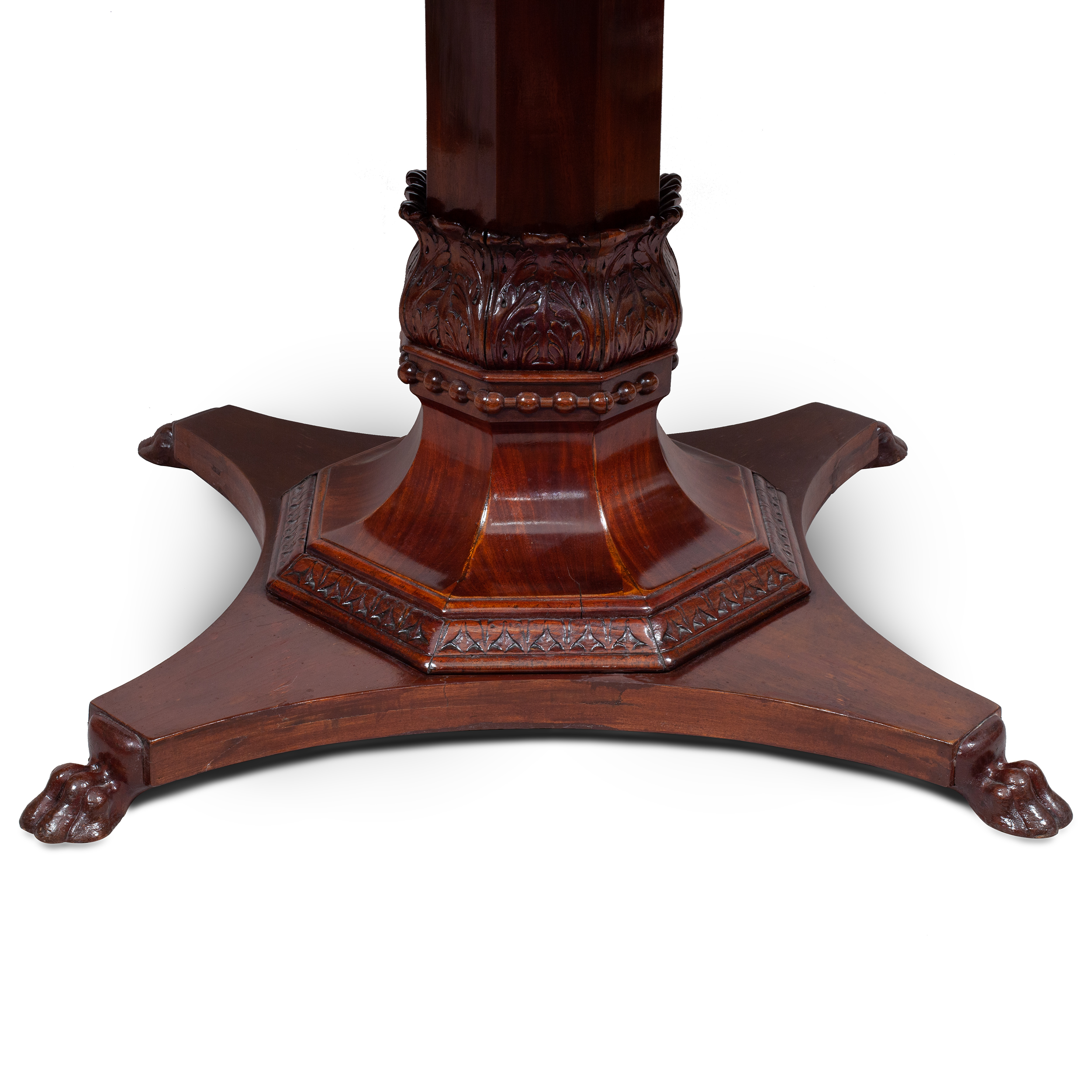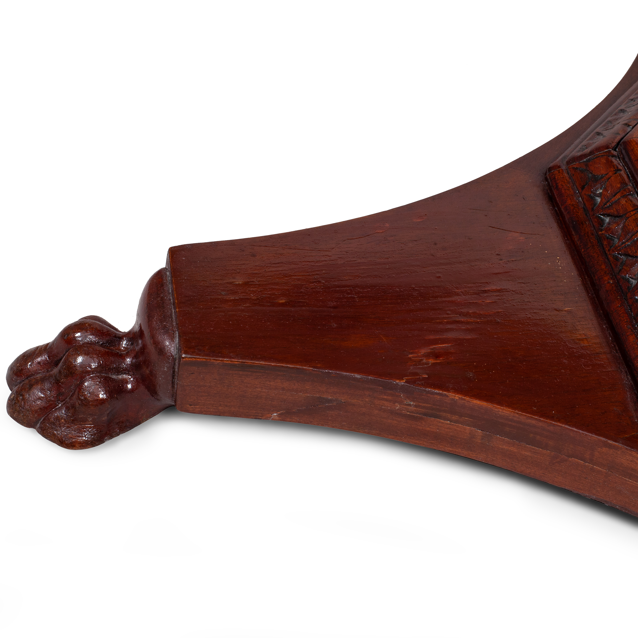 Ножка стола богато декорирована резным растительным орнаментом. Красное дерево (фанеровка), хвойные породы (основа), резьба, Россия, Санкт-Петербург, 1820-е-1830 годы, размер (в/ш/г): 74 х 120 х 72,5 см