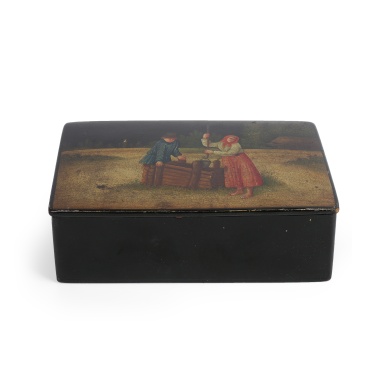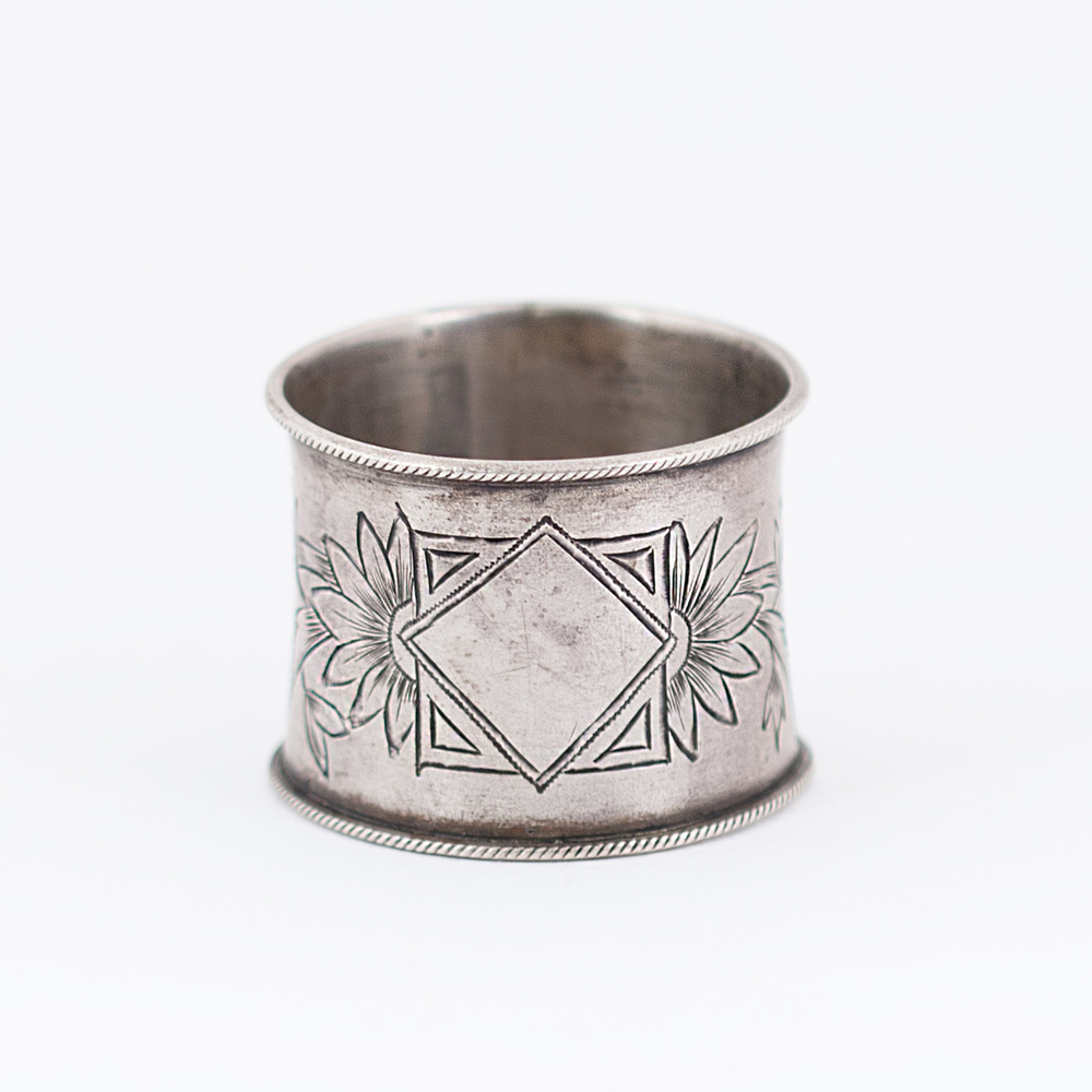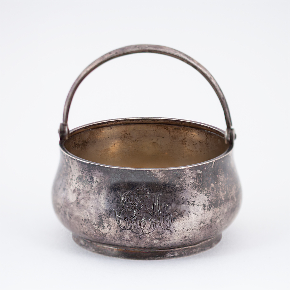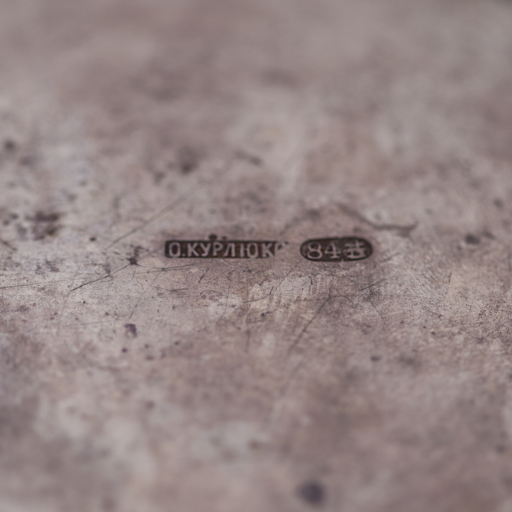 Серебро, литье, чеканка, гравировка, монтировка. На сахарнице клейма 84° пробы и «Георгий Победоносец» в овальных щитках, клеймо «О. Курлюковъ» фабрики Ореста Федоровича Курлюкова, Россия, Москва, 1880-е годы, диаметр – 10 см, вес – 123 г.