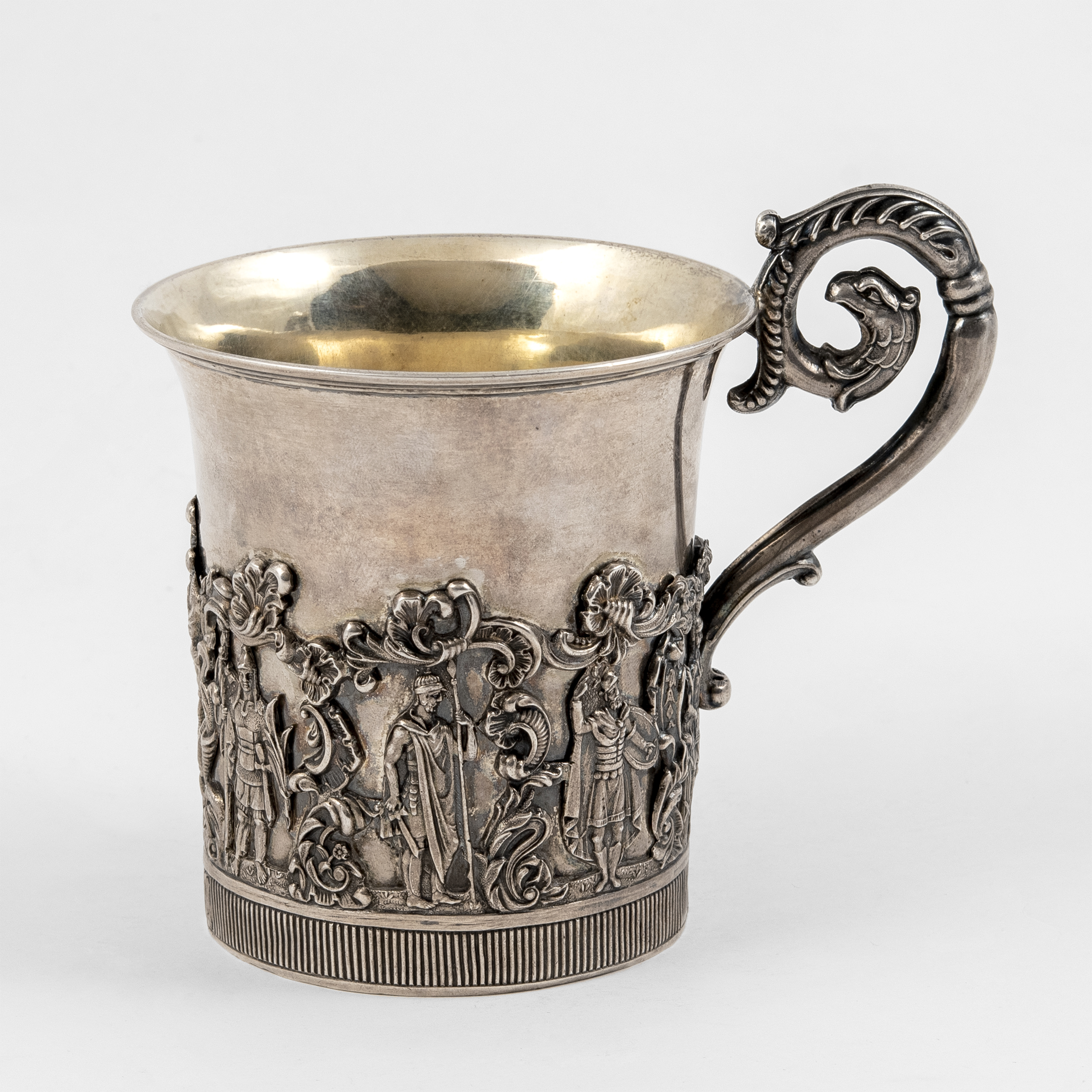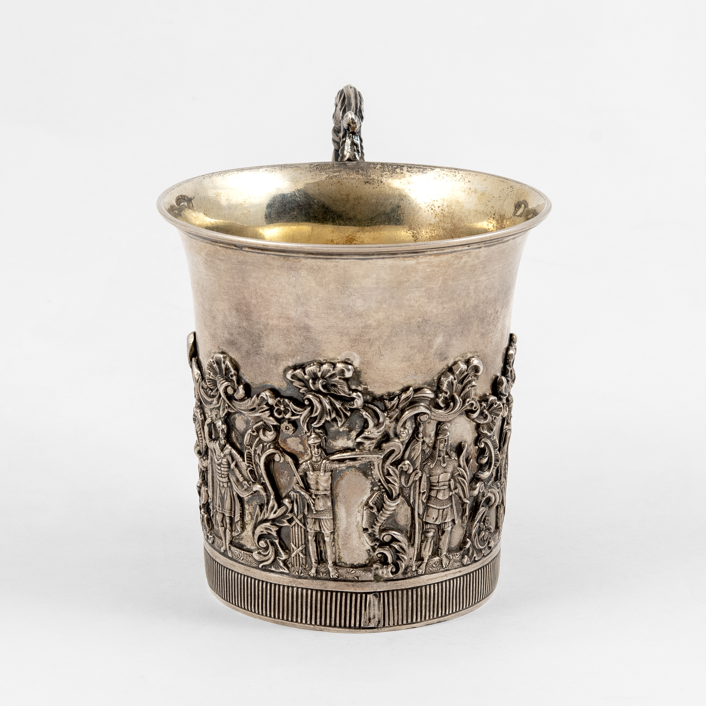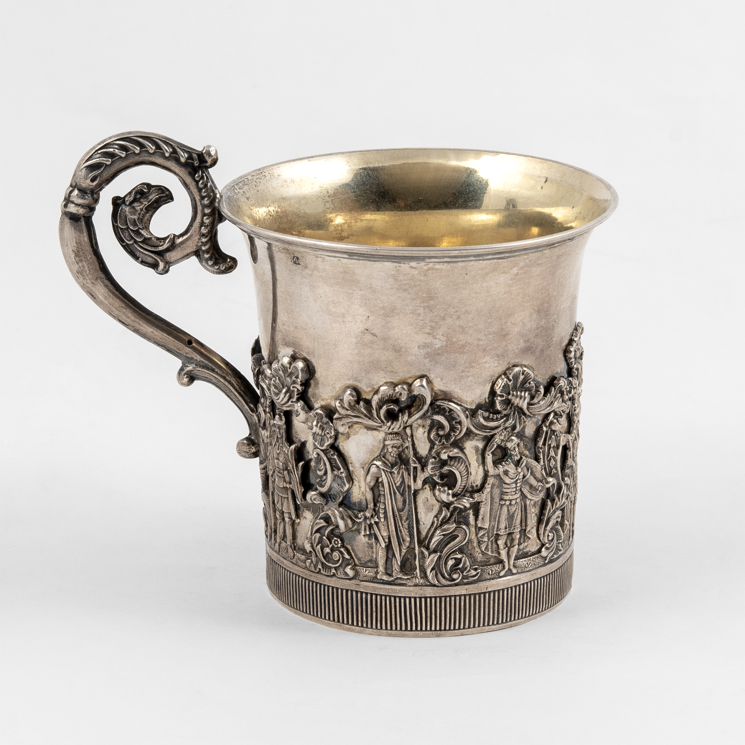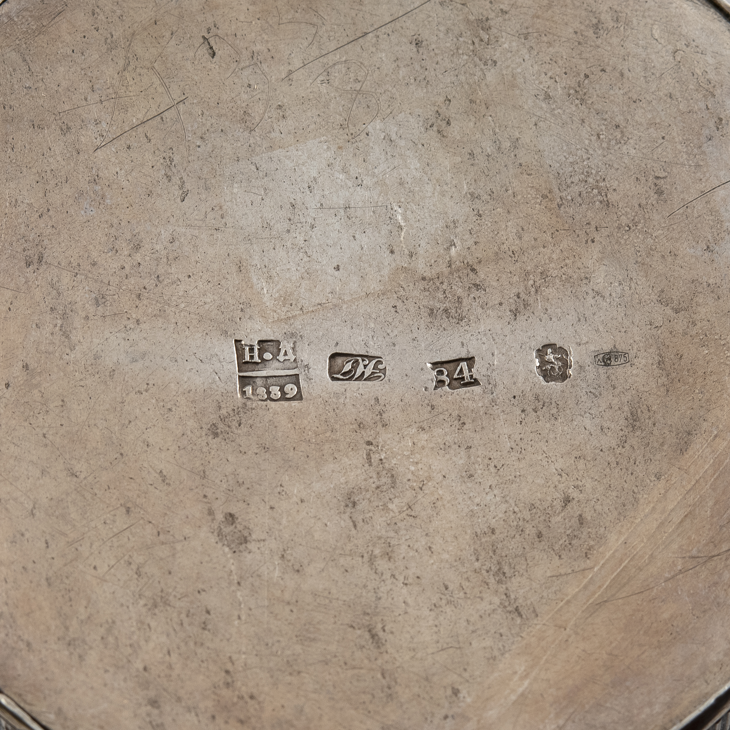 Клейма: 84 пробы с гербом Москвы «Георгий Победоносец», с инициалами пробирного мастера «Н.Д» над датой «1839» Дубровина Николая Лукича (1822-1855 гг.); именник «HГ» в прямоугольном щитке, неизвестный мастер (1835-1840 гг.);