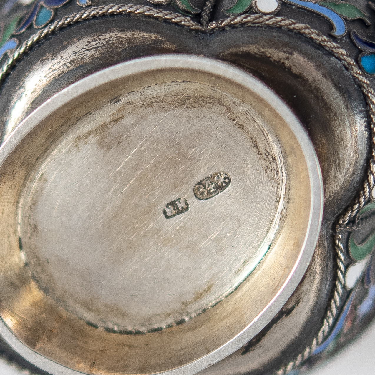 Клейма: «Н.Я» - клеймо с инициалами Яничкина Николая Дмитриевича, владельца мастерской серебряных изделий, художественных и обыкновенных (годы работы: 1888-1895). 84 проба с гербом Санкт Петербурга в виде двух якорей и скипетра в овальном щитке - клеймо Петербургского пробирного управления.