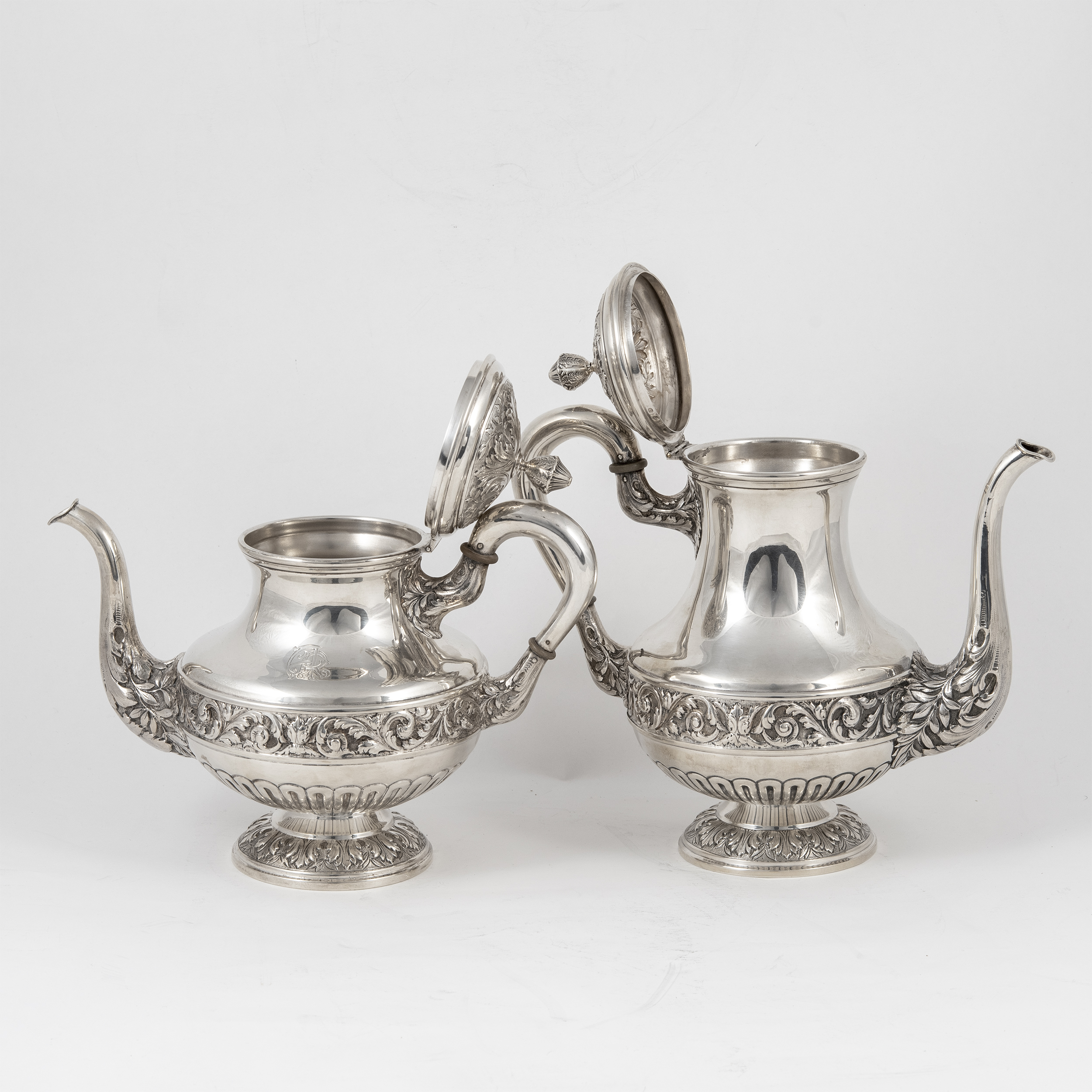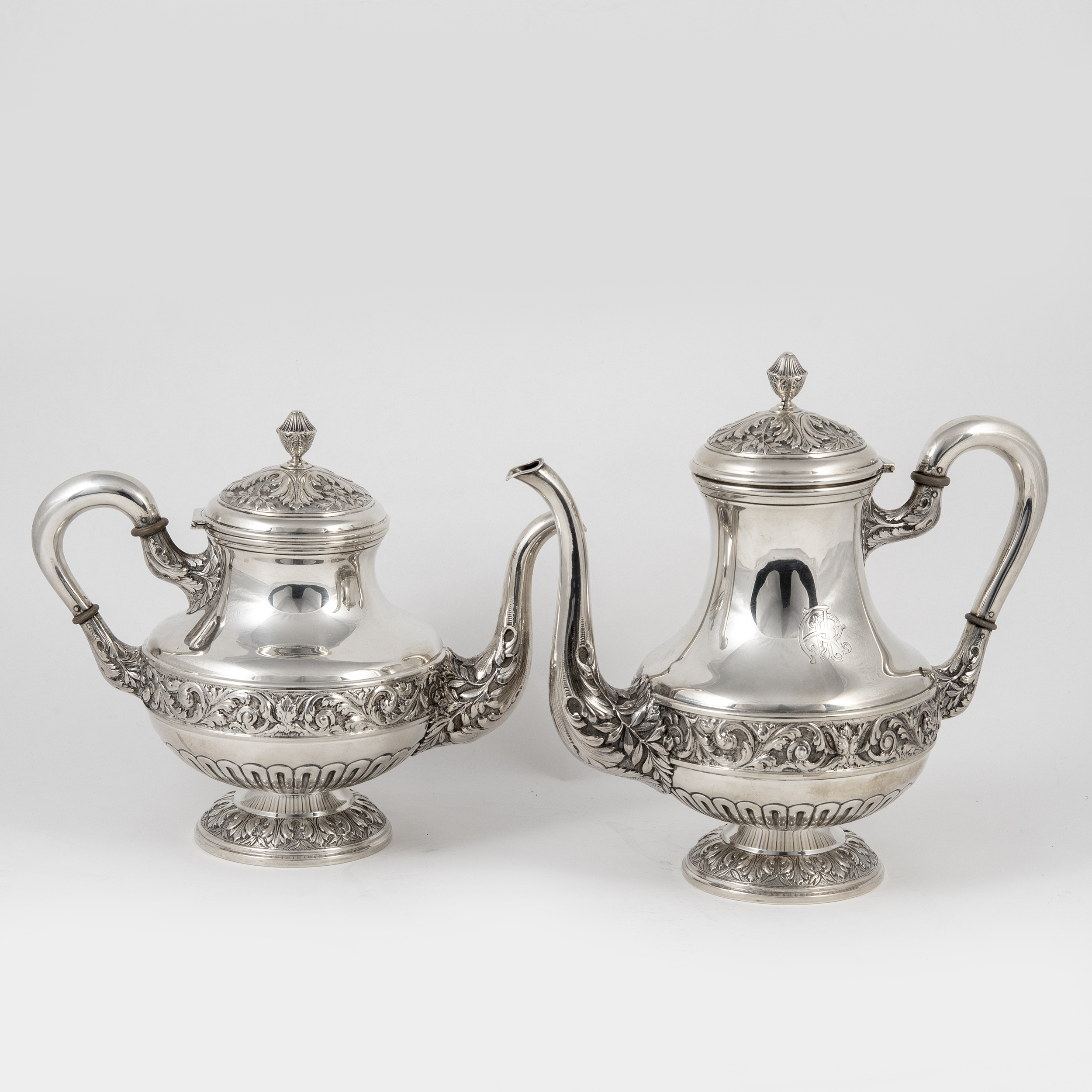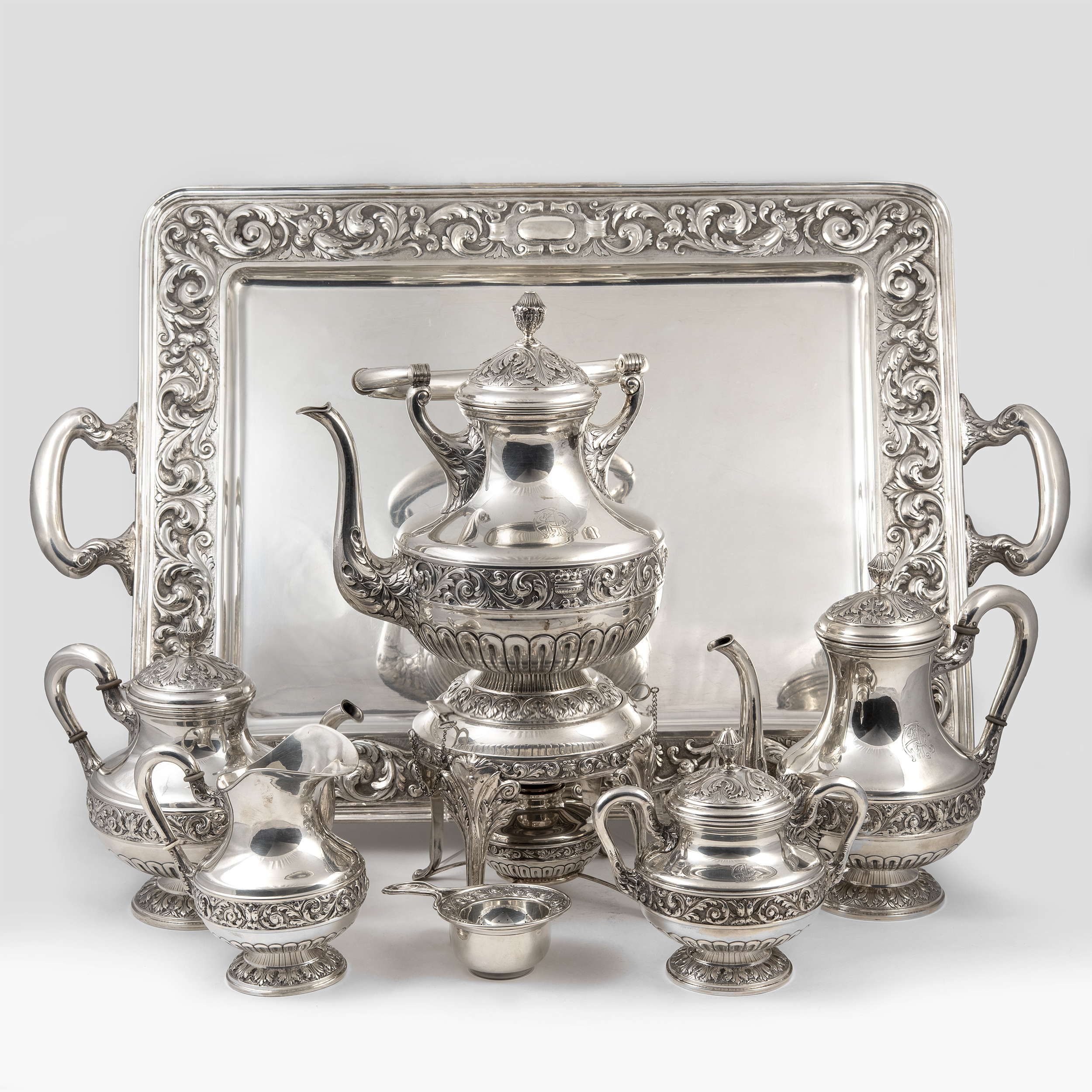 Кофейник, чайник, бульотка со спиртовкой, сливочник, сахарница, ситечко для чая на подставке и поднос (7 предметов). Предметы украшены поясными растительными орнаментами, ручки кофейника, чайника и сливочника оканчиваются стилизованными листьями аканта.