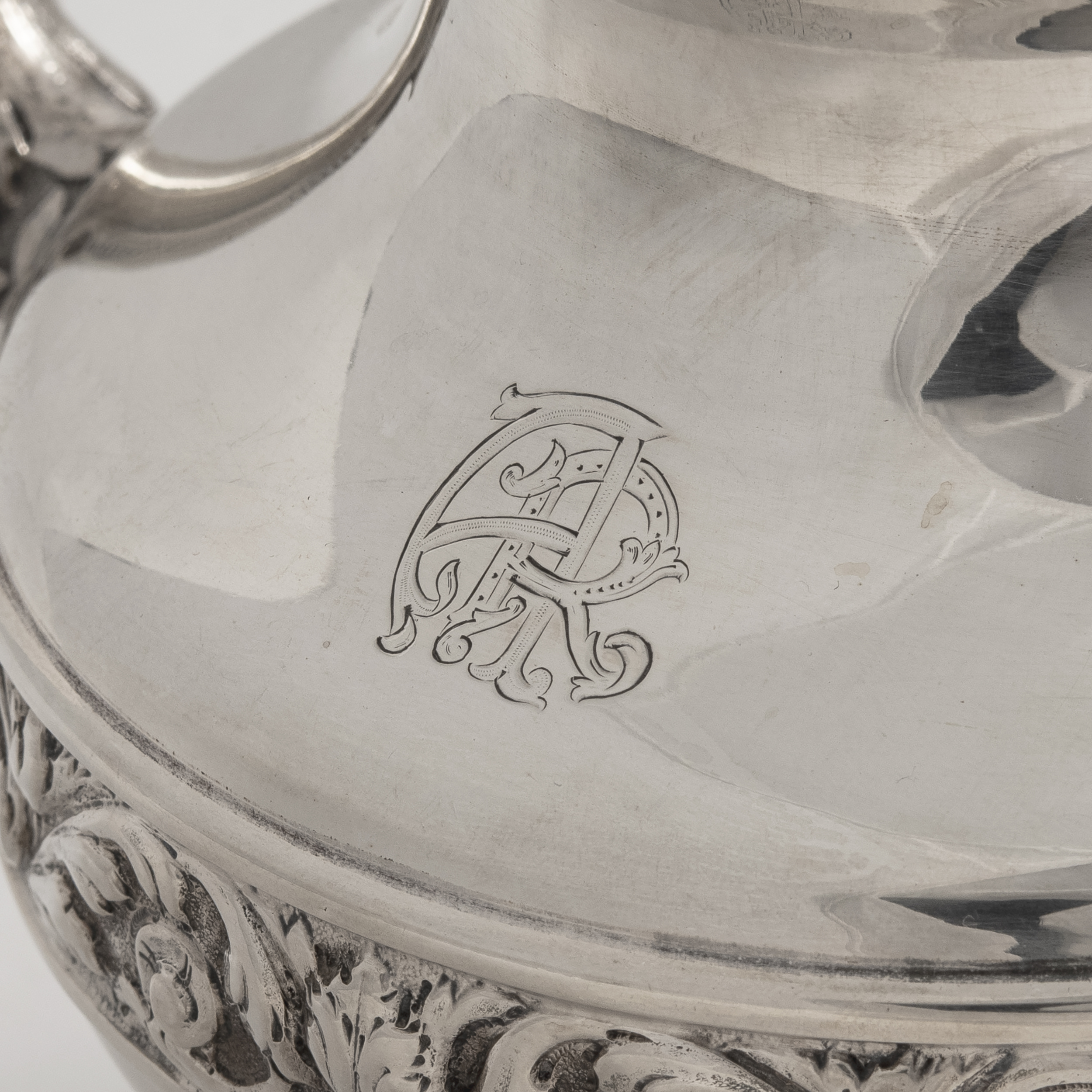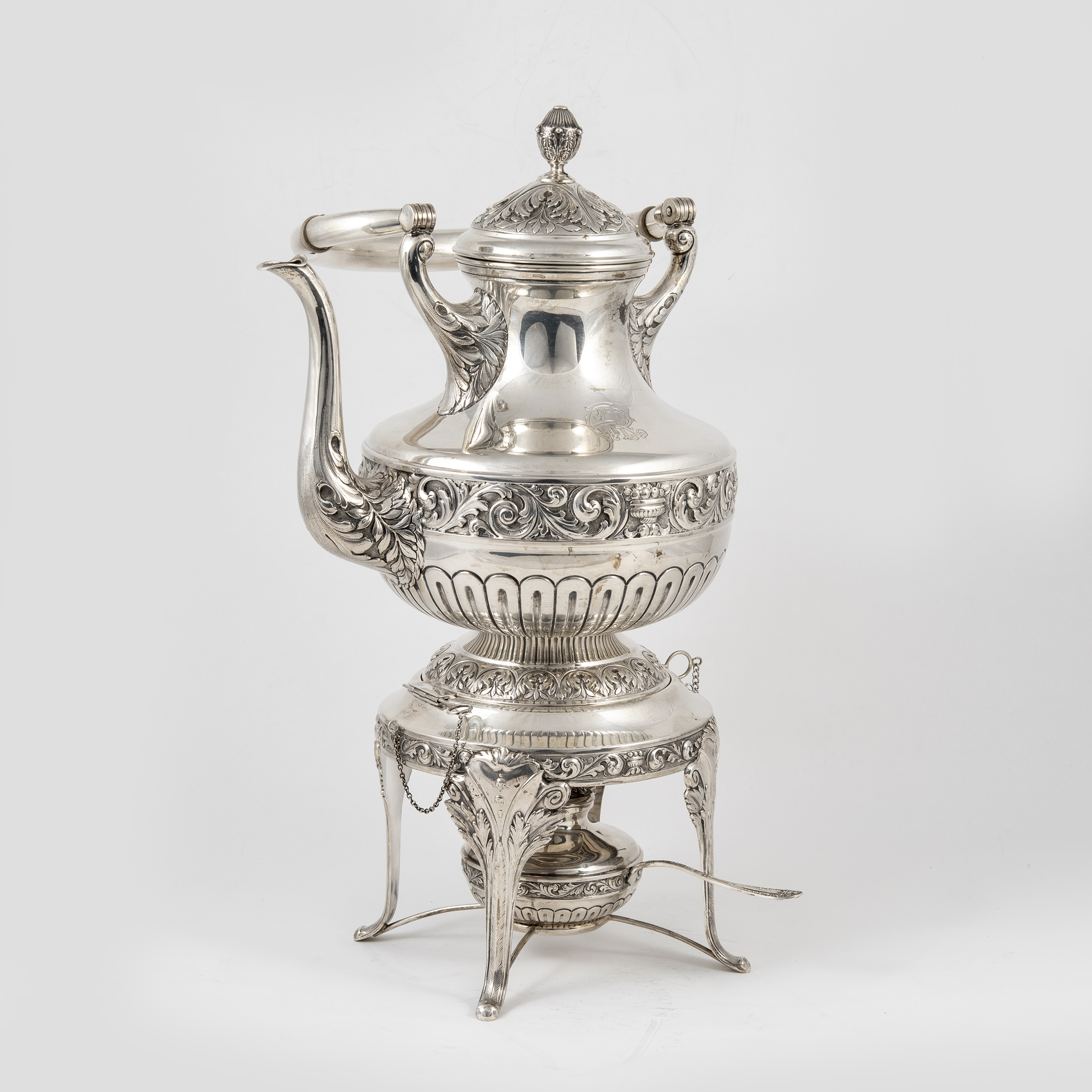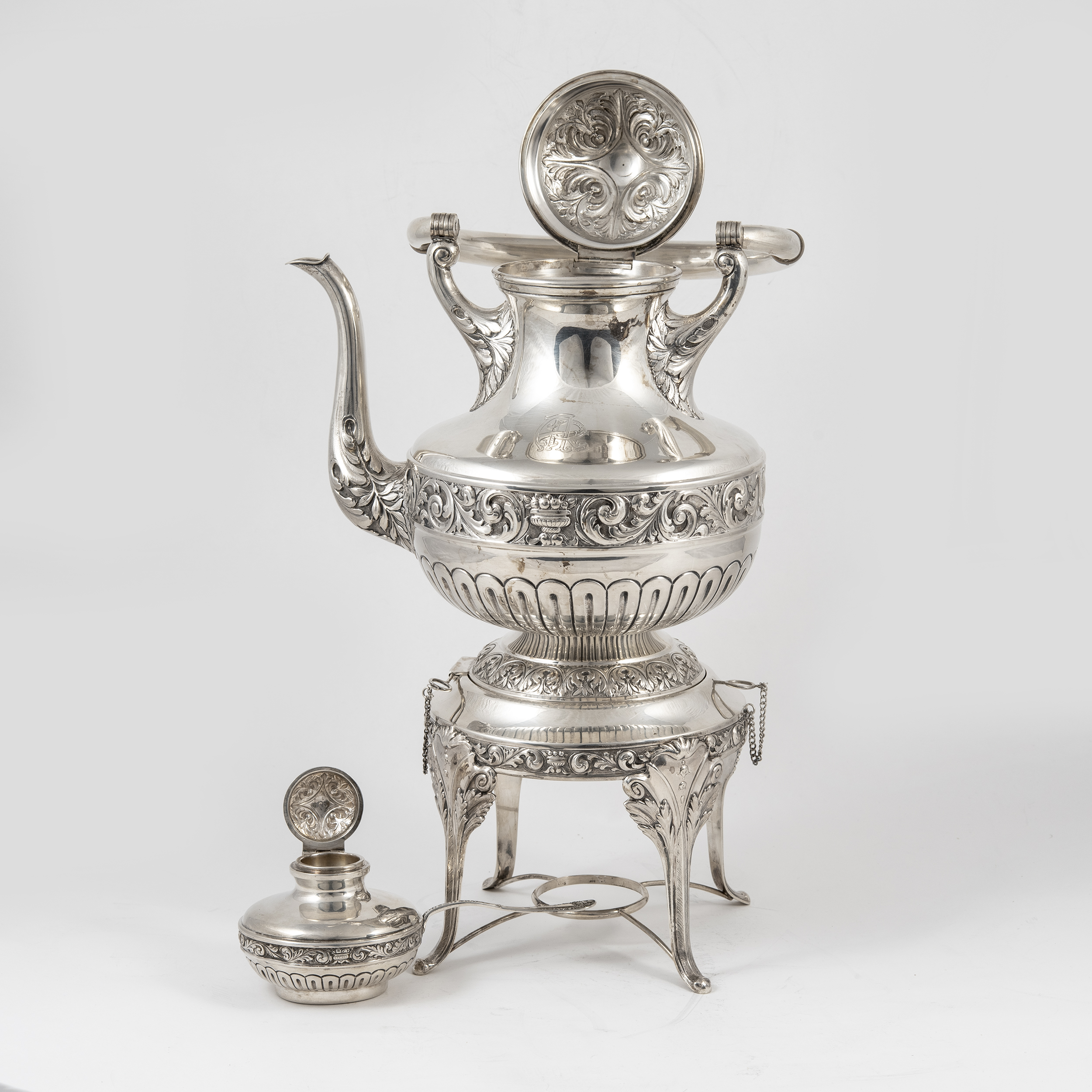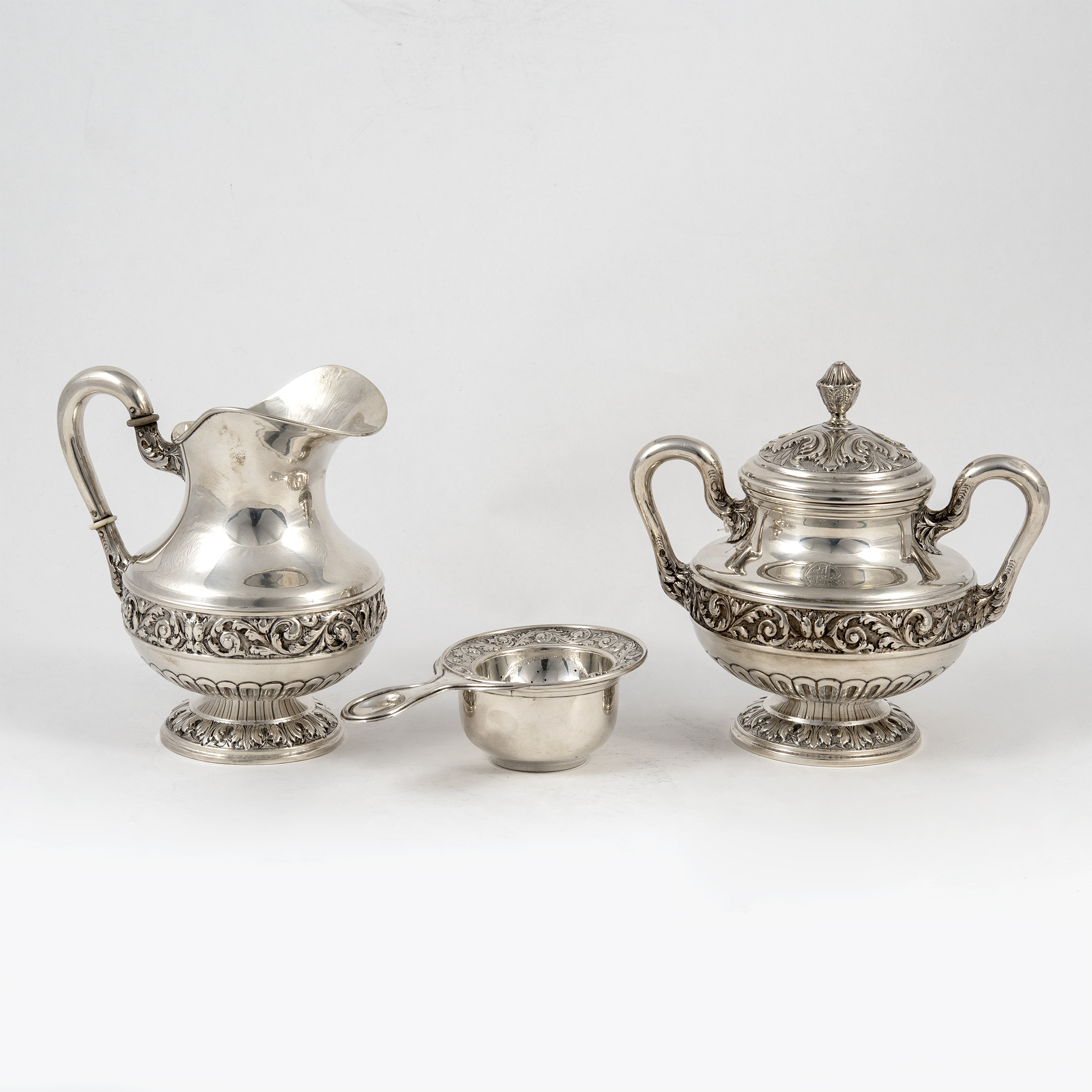 Кофейник, чайник, бульотка со спиртовкой, сливочник, сахарница, ситечко для чая на подставке и поднос (7 предметов). Предметы украшены поясными растительными орнаментами, ручки кофейника, чайника и сливочника оканчиваются стилизованными листьями аканта.