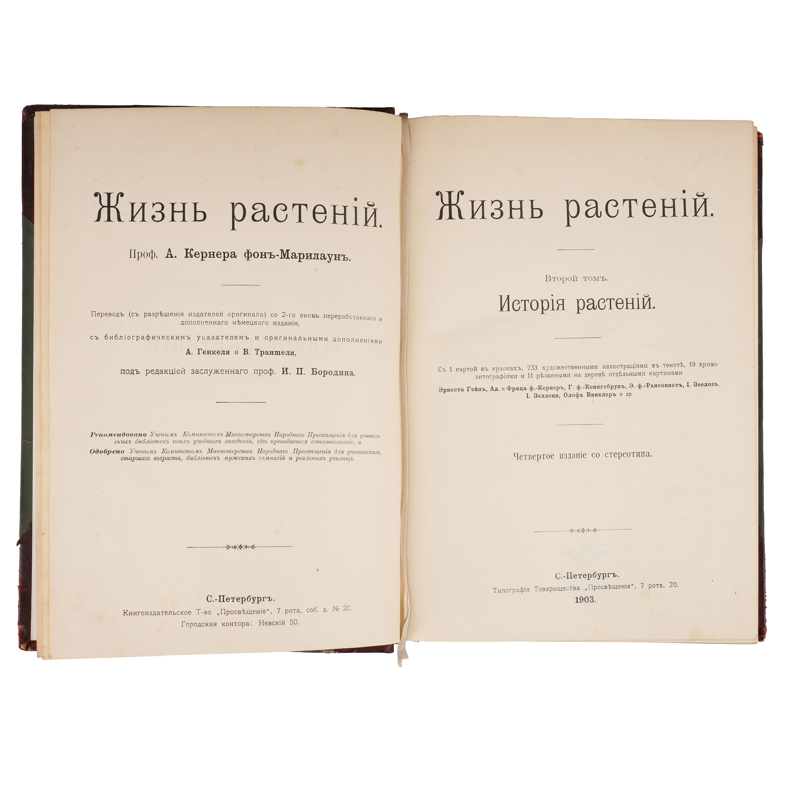 Том 1. Форма и жизнь растения. 773 ст. 34 л. ил.; 215 рис. в тексте, хромолитографий Эрнеста Гейна, Ад. И Фрица ф.-Кернера, Г. Ф.-Кенигсбруна Олофа Винклера и др.