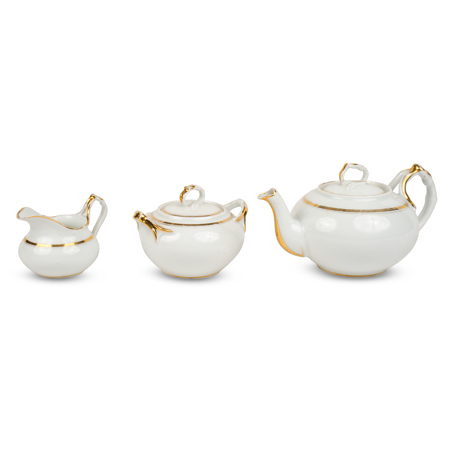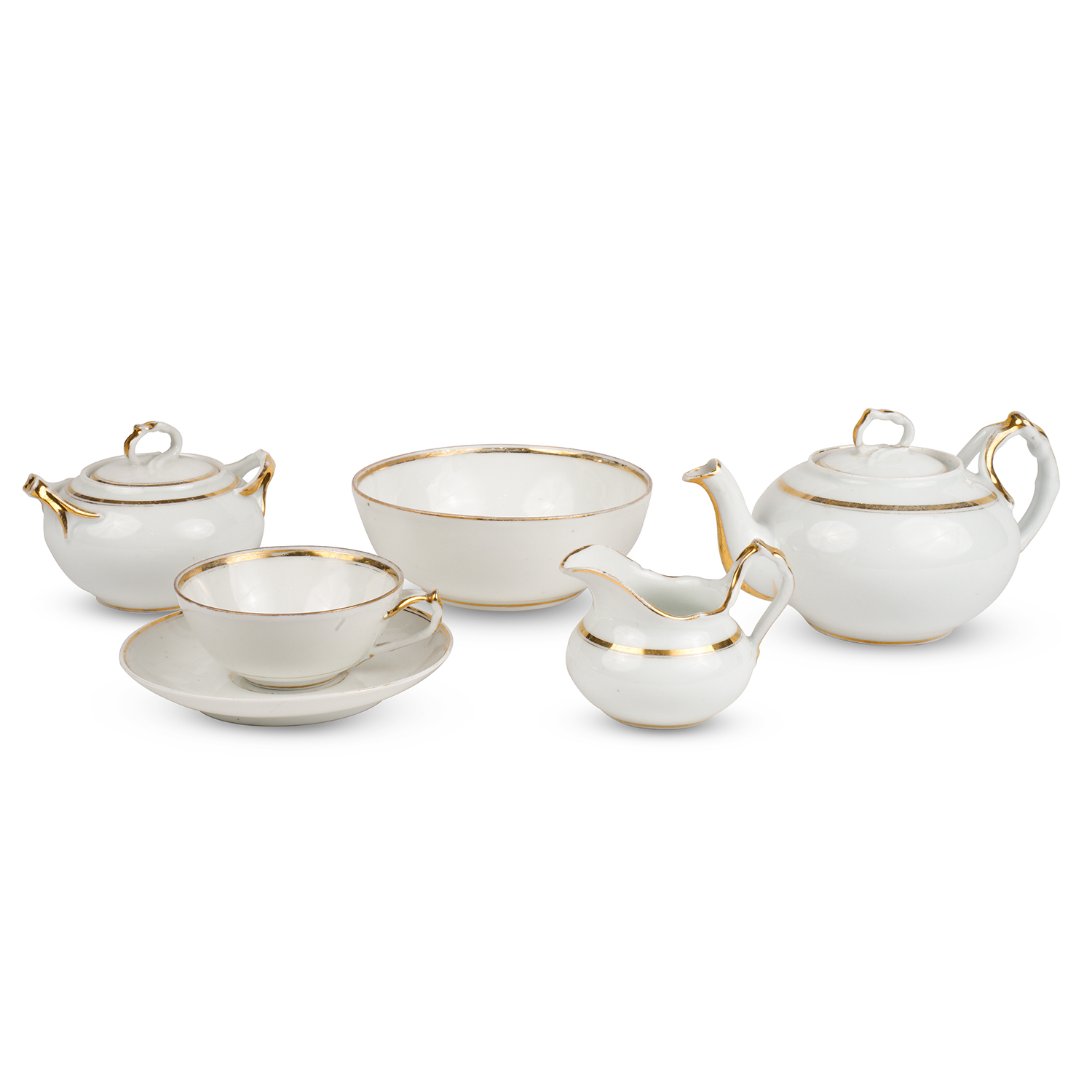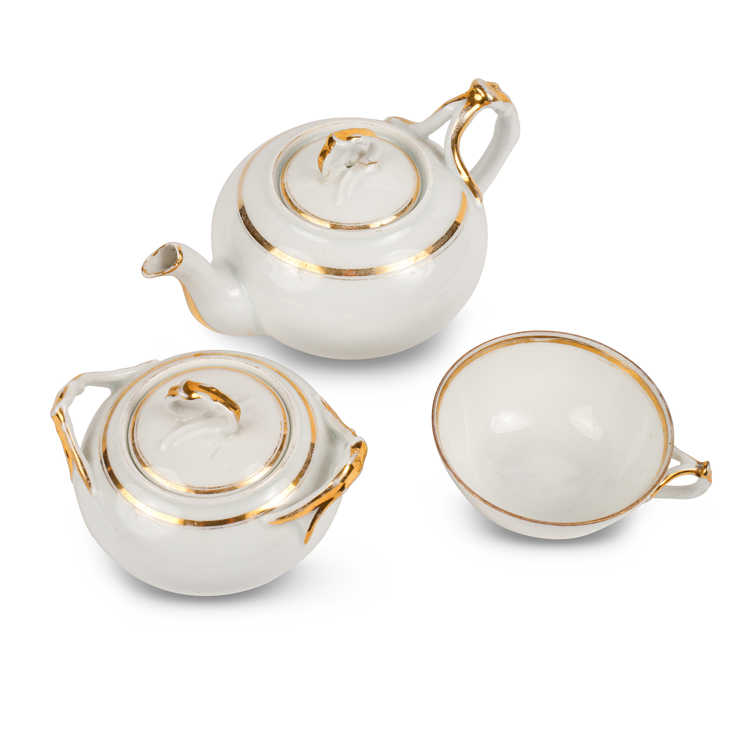 Детский чайный сервиз «Эгоист» состоит: чайник и сахарница, сливочник, полоскательница и чайная пара. Фарфор, золочение, марка: синим печатью «М.С. Кузнецова въ Дулеве под двуглавым орлом. Россия, завод М.С. Кузнецова, 1864-1889 годы. Размеры: