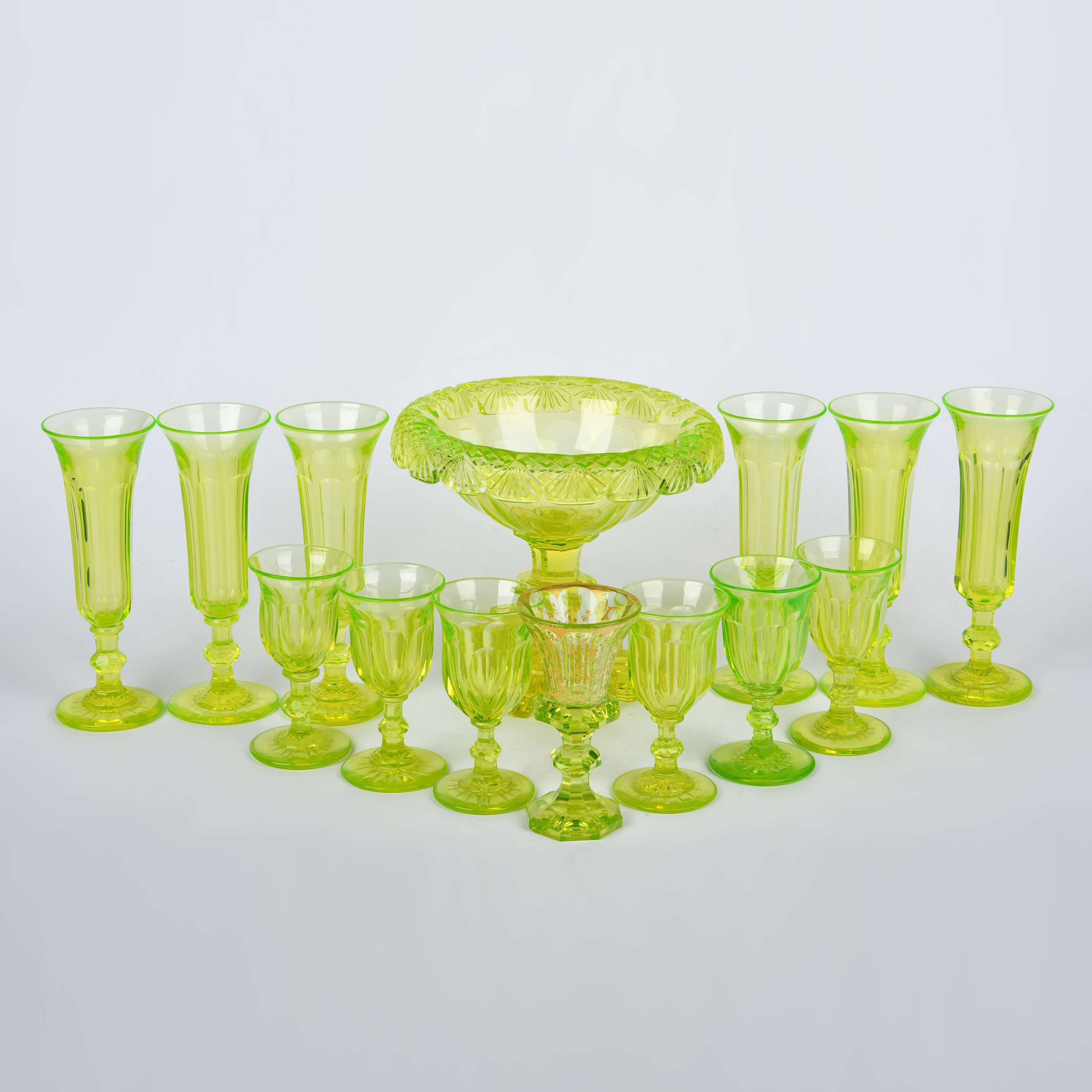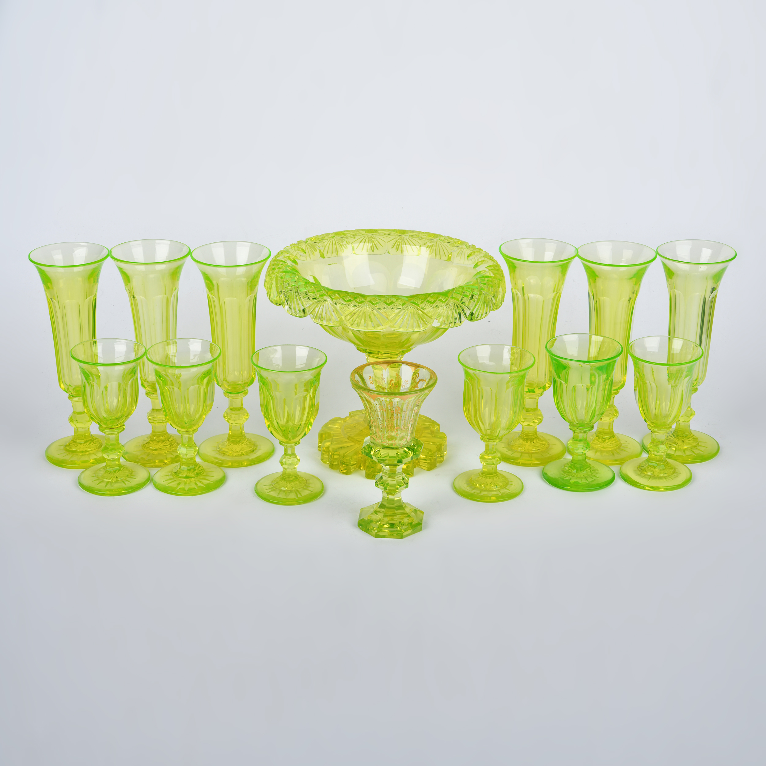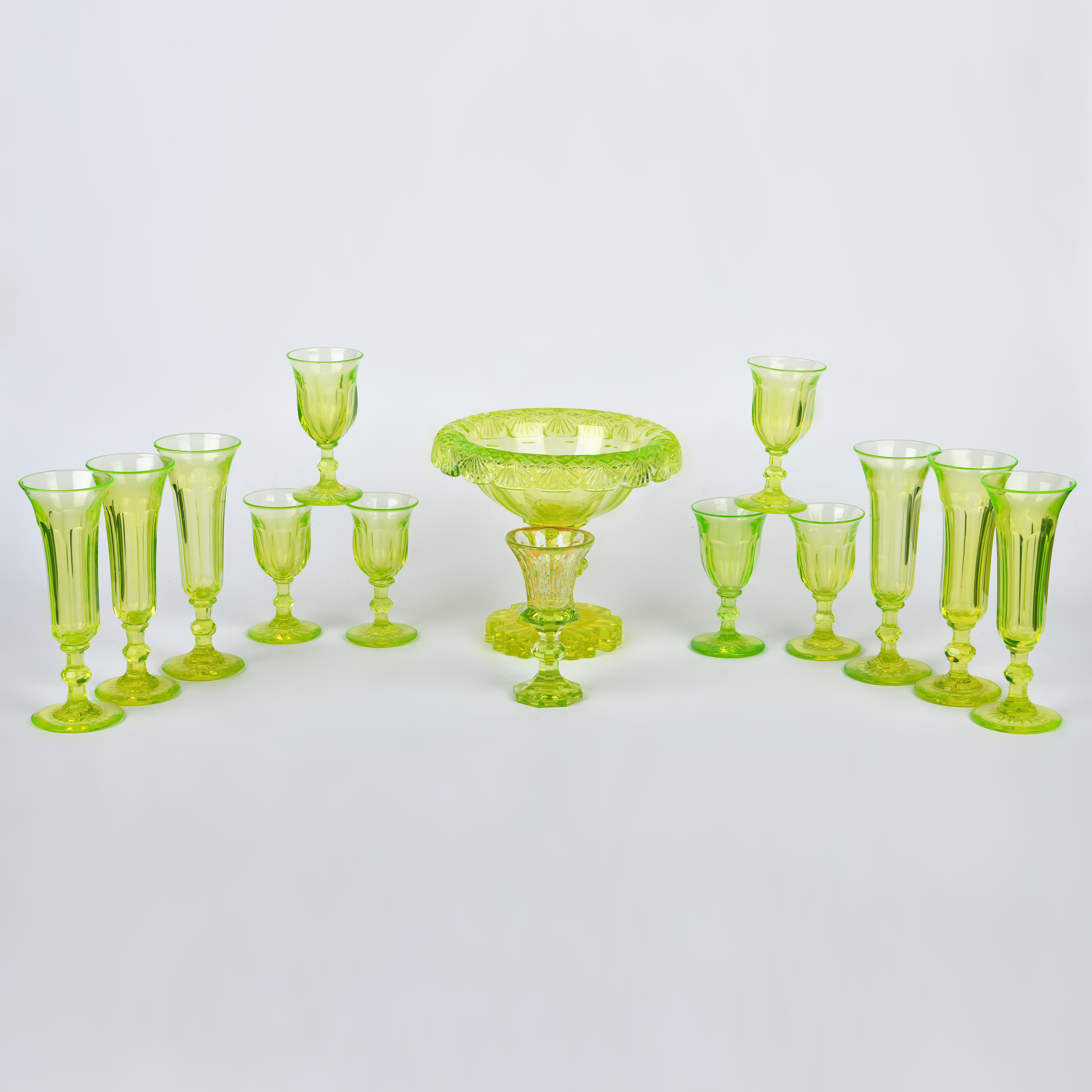 Комплект состоит из вазочки для конфет, шести бокалов-флюте и семи рюмок. Урановое стекло, выдувание, гранение, на одной из рюмок роспись золотом; Россия, высота вазы – 16,5 см, диаметр – 18 см, высота бокалов-флюте – 17 см, рюмок – 11 см.