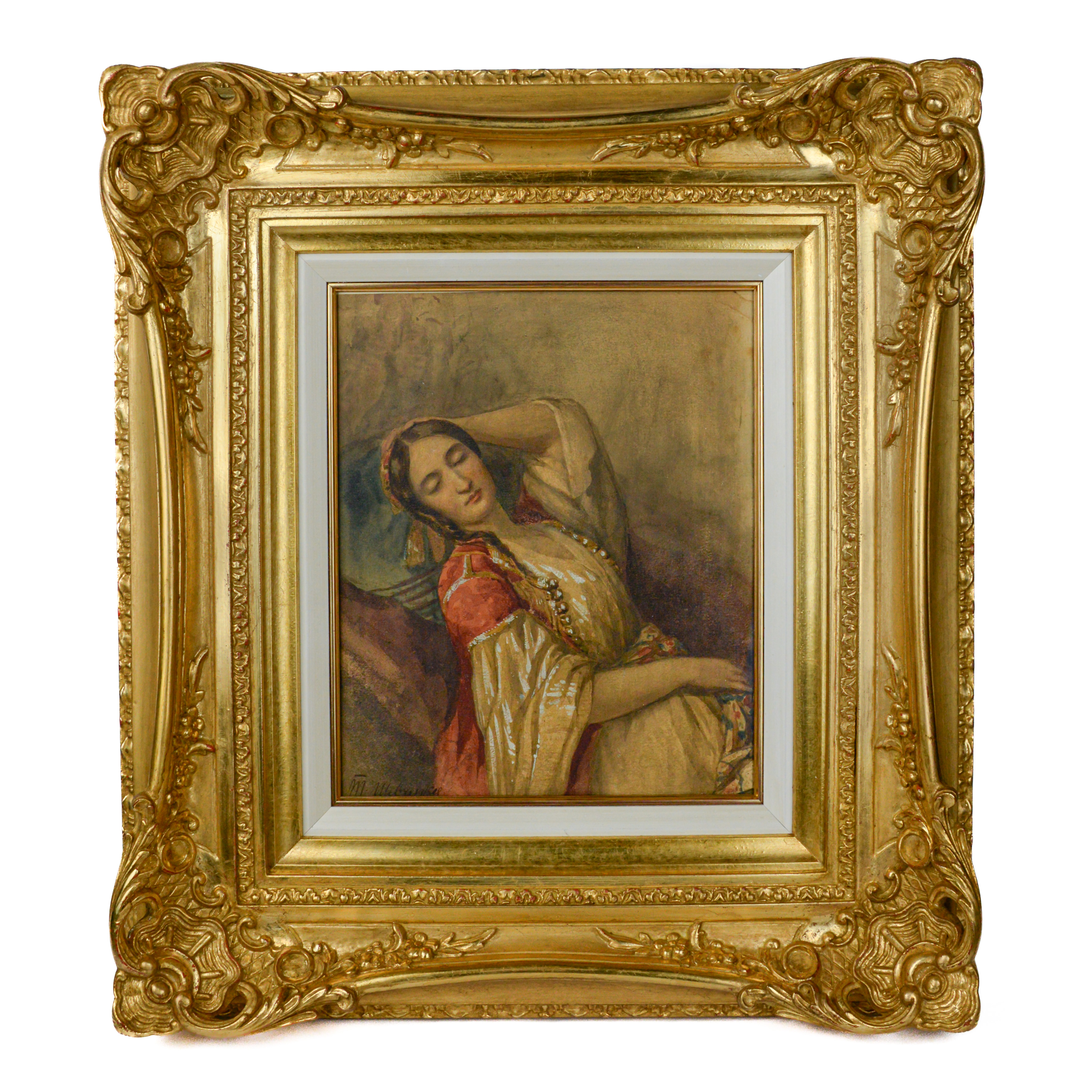 Перед зрителем предстаёт юная красавица в восточном костюме, погруженная в мечтательную негу: её нежный, будто неземной образ словно растворяется в пространстве комнаты, становясь едва осязаемым, так мягко переливаются цвета и тона мягких светотеневых переходов, подчёркнутых тончайшими мазками подобных солнечным бликам белил, бегущим по складкам платья.