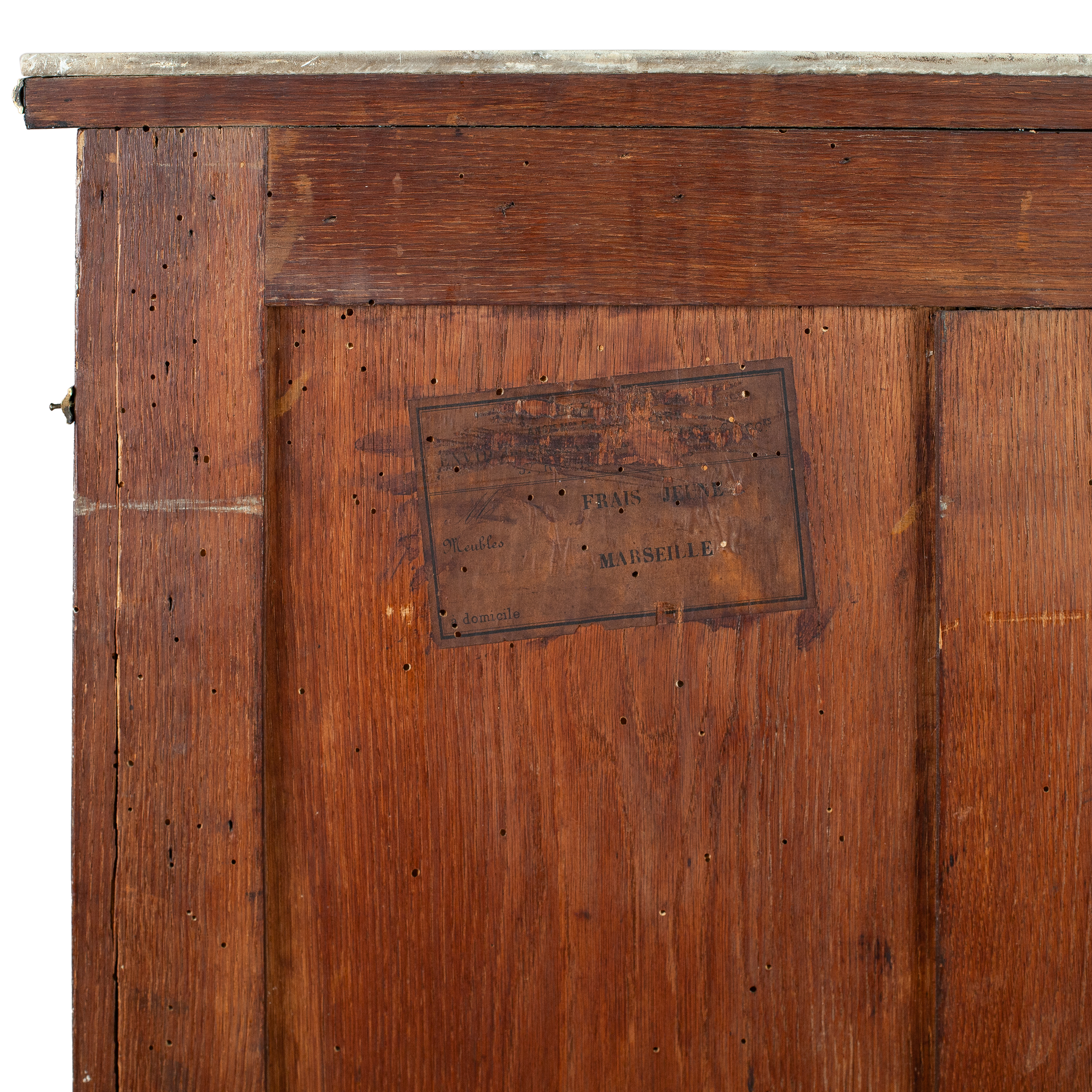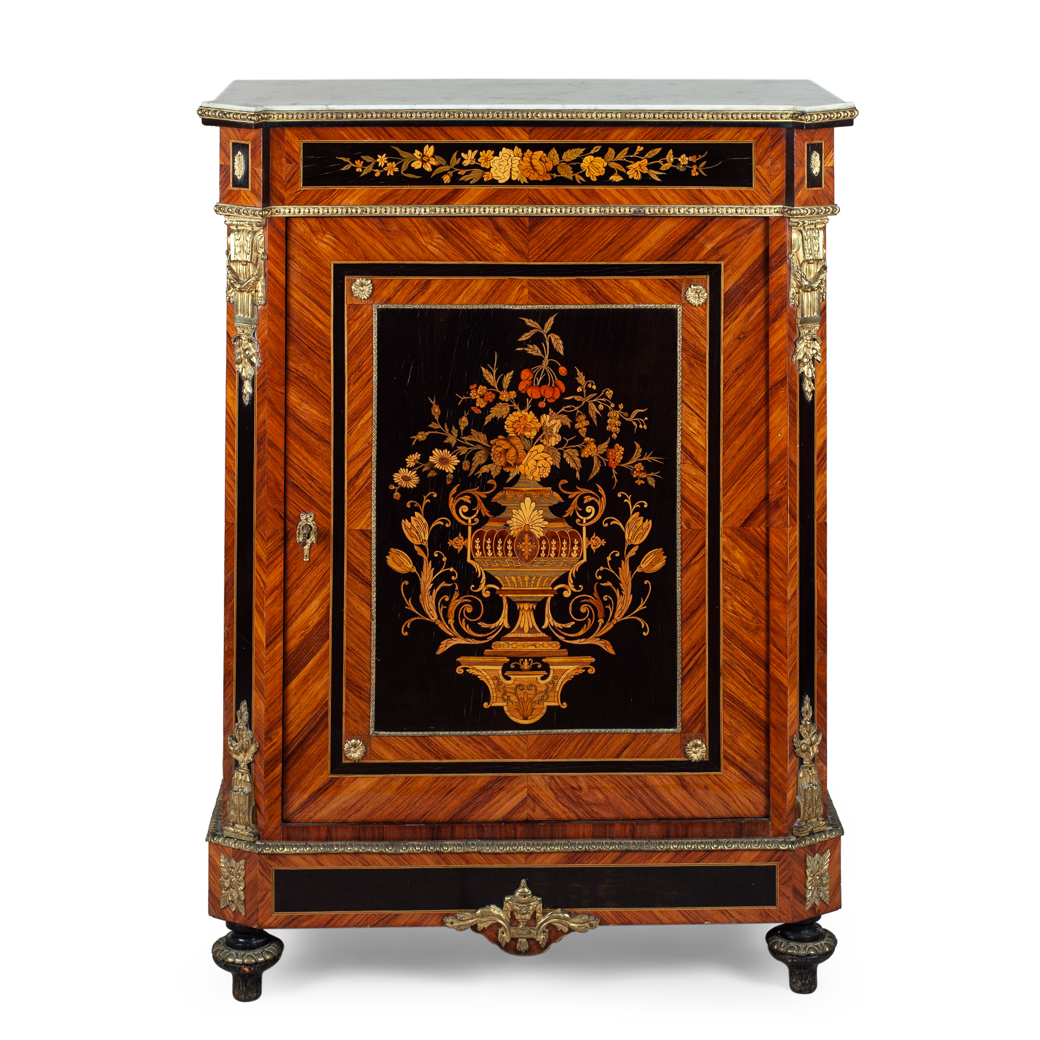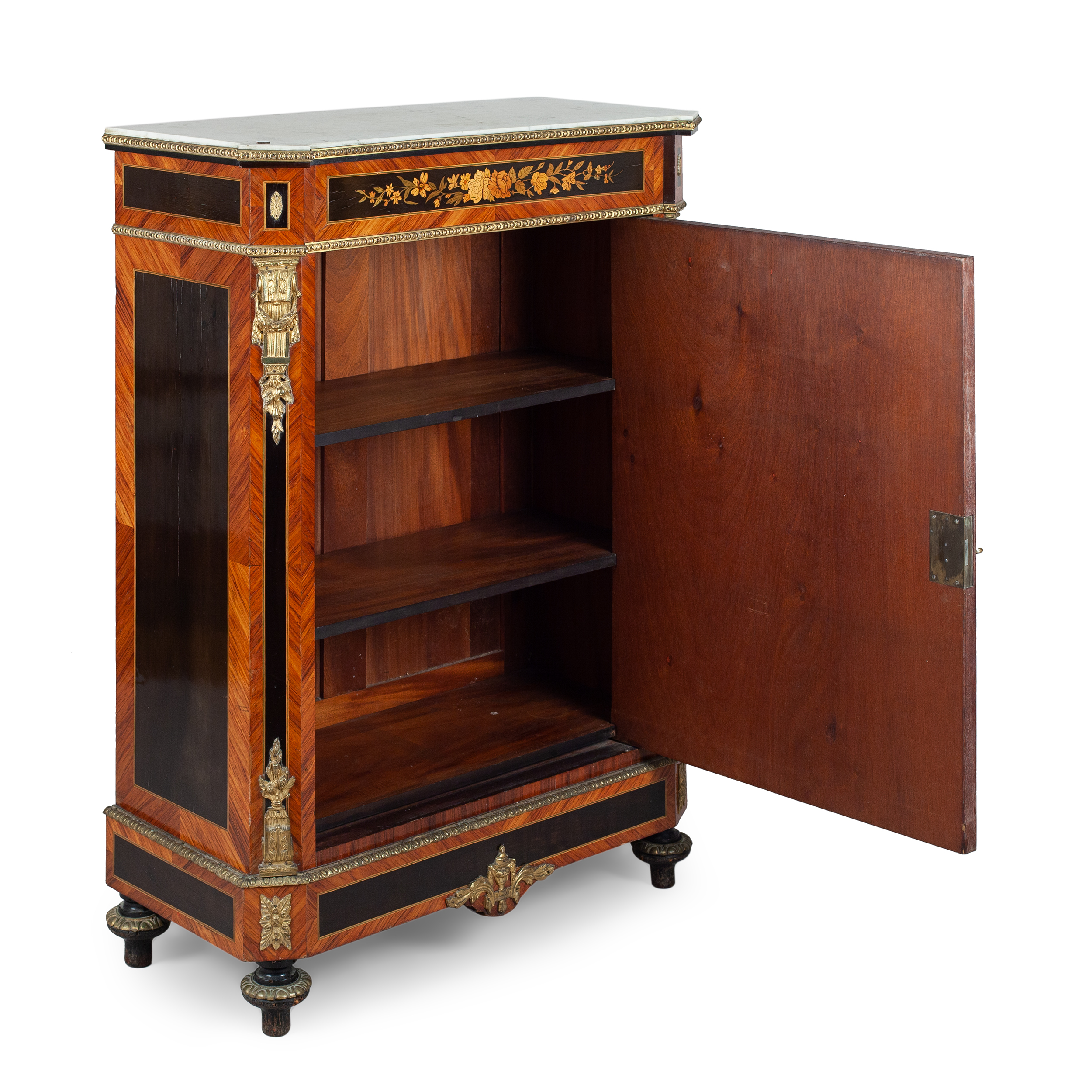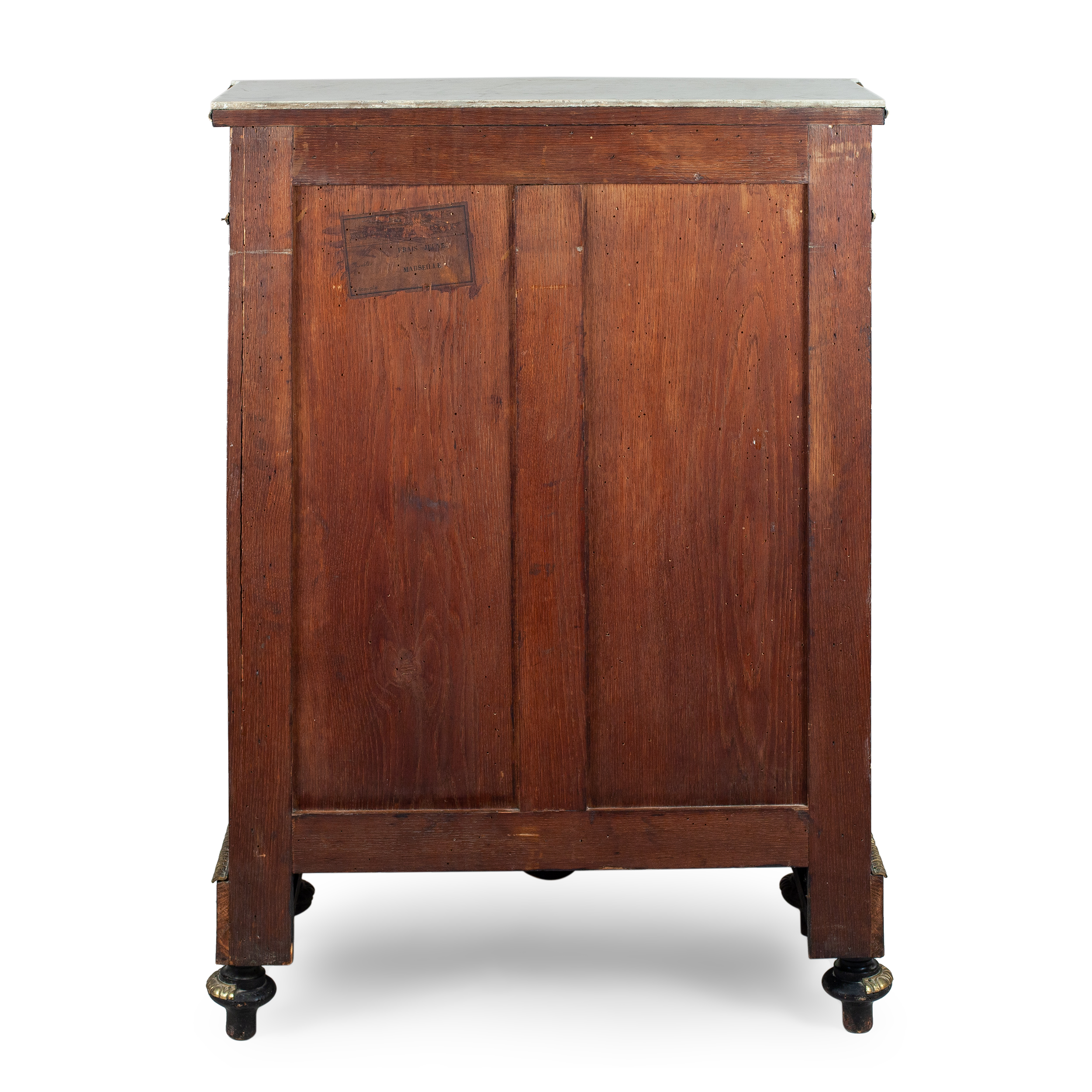 Шкафчик пристенный. Массив дерева, фанерование в технике маркетри, палисандр, тонировка, фигурные бронзовые золоченые накладки, мраморная столешница, на оборотной стороне этикетка «Frais Jeune, Marseille», Франция, последняя треть XIX века, размер (в/ш/г): 102 х 75 х 35 см