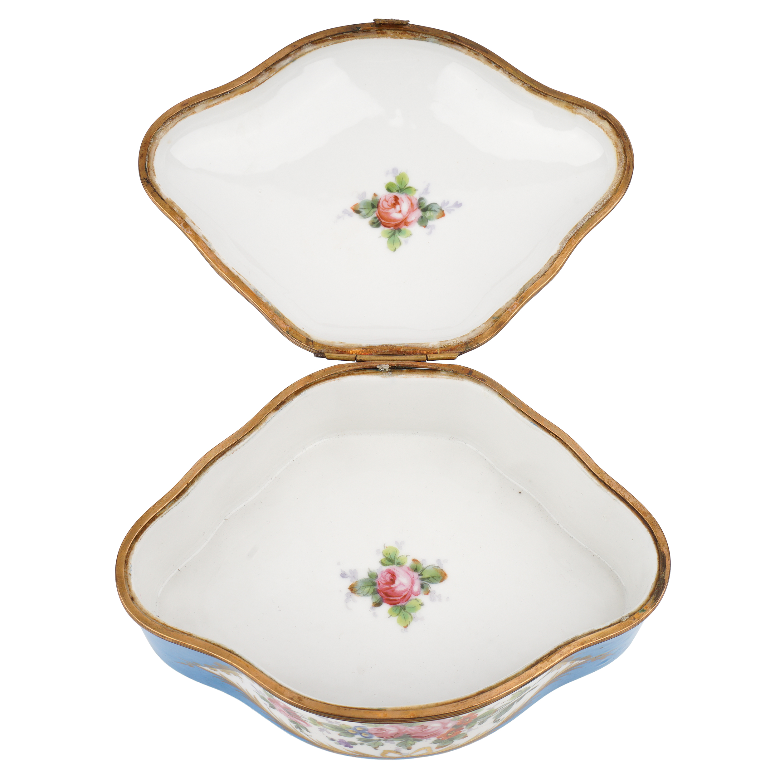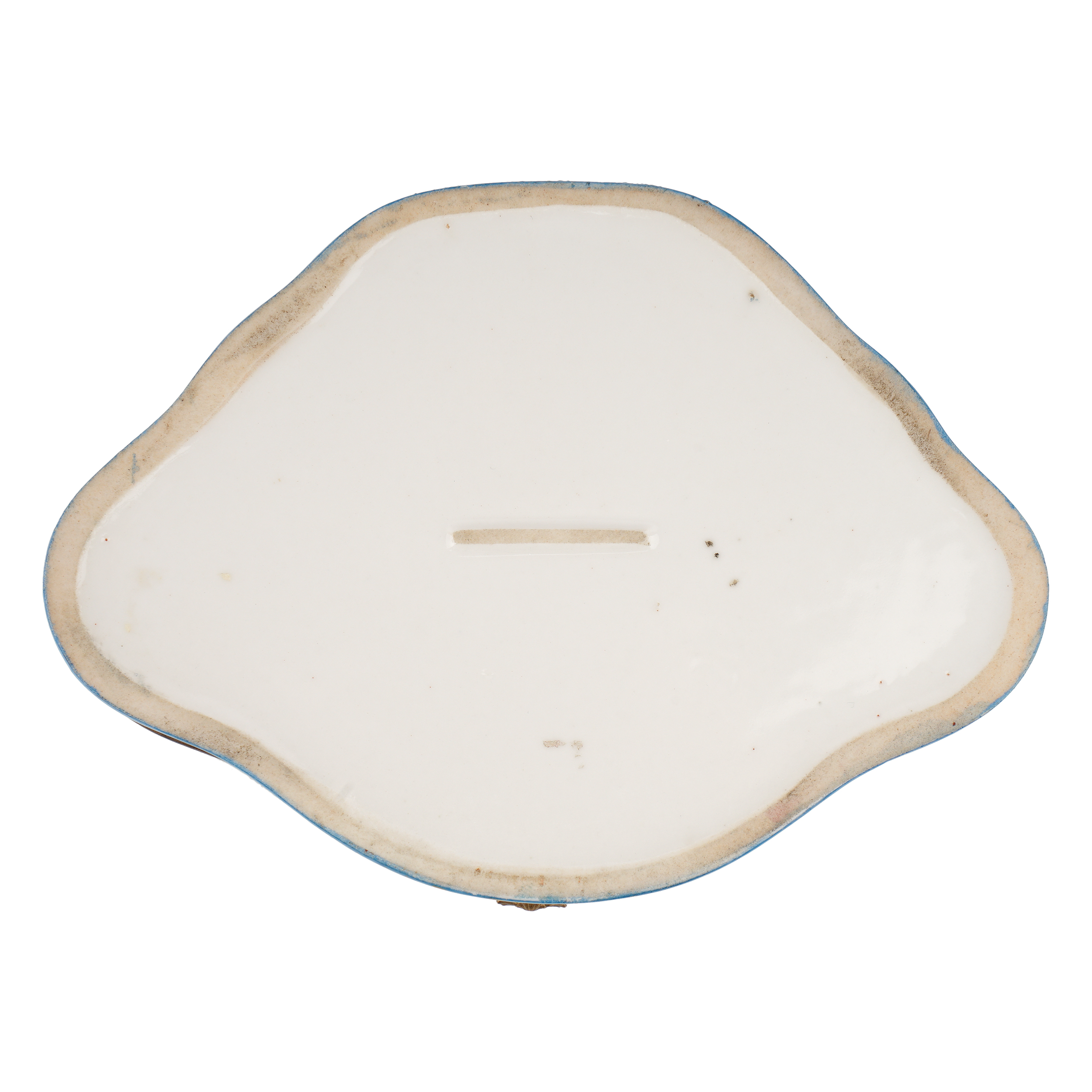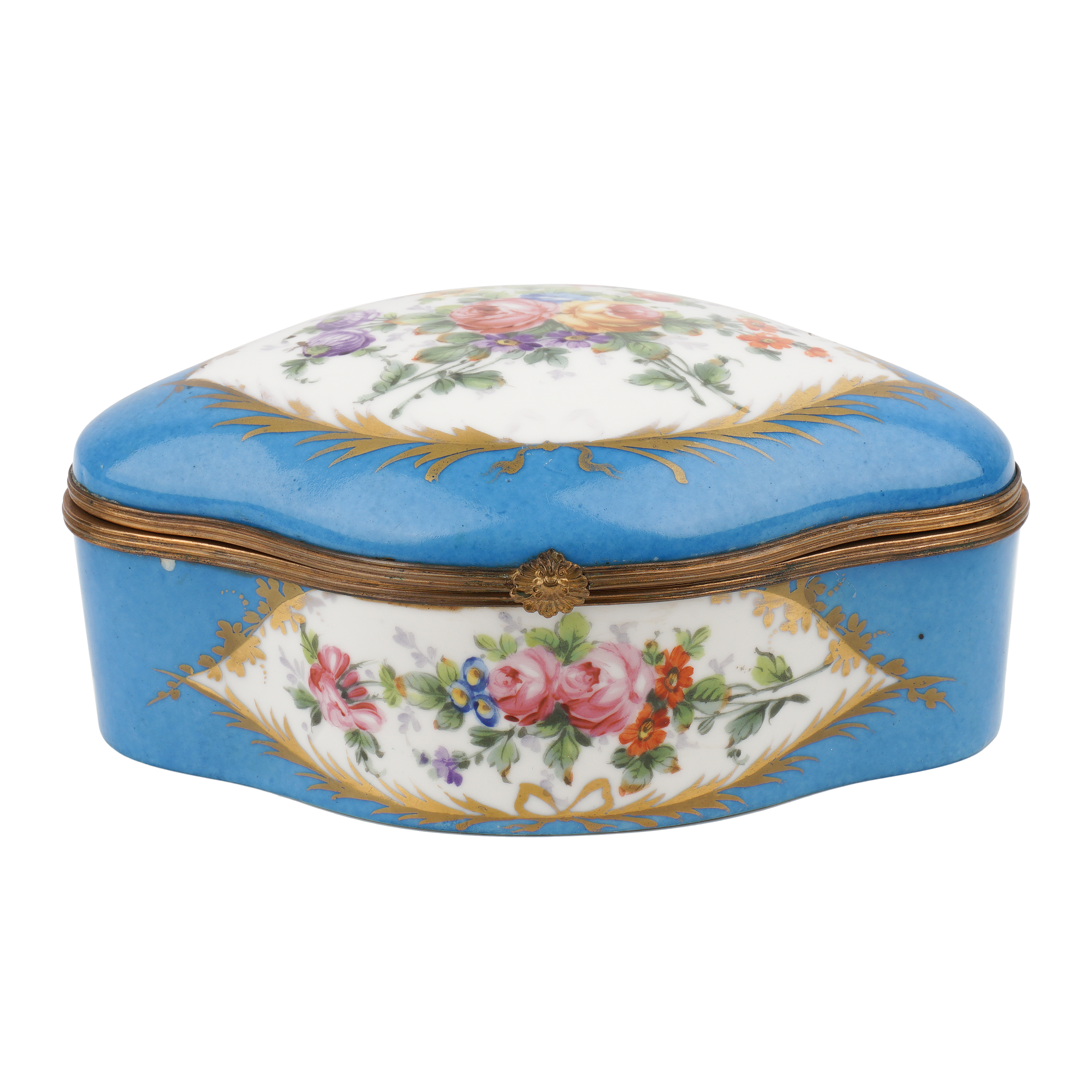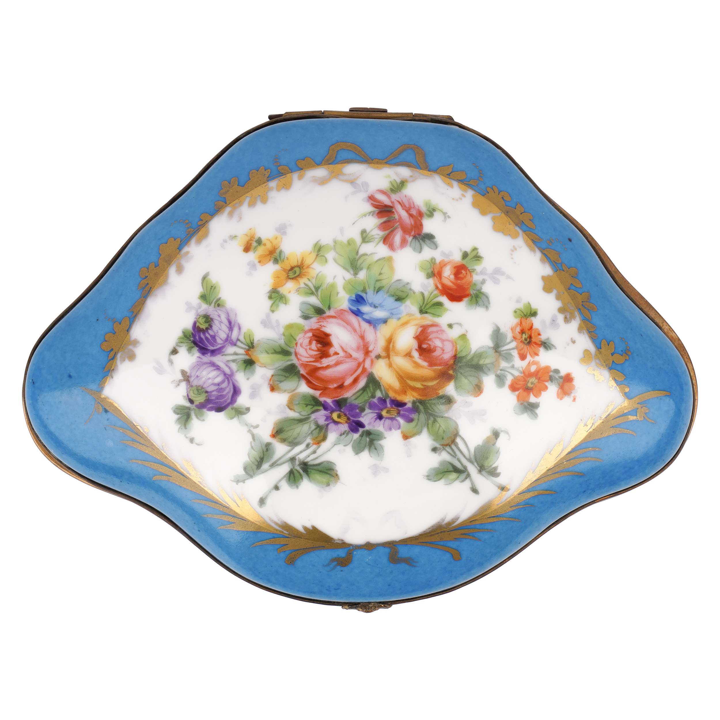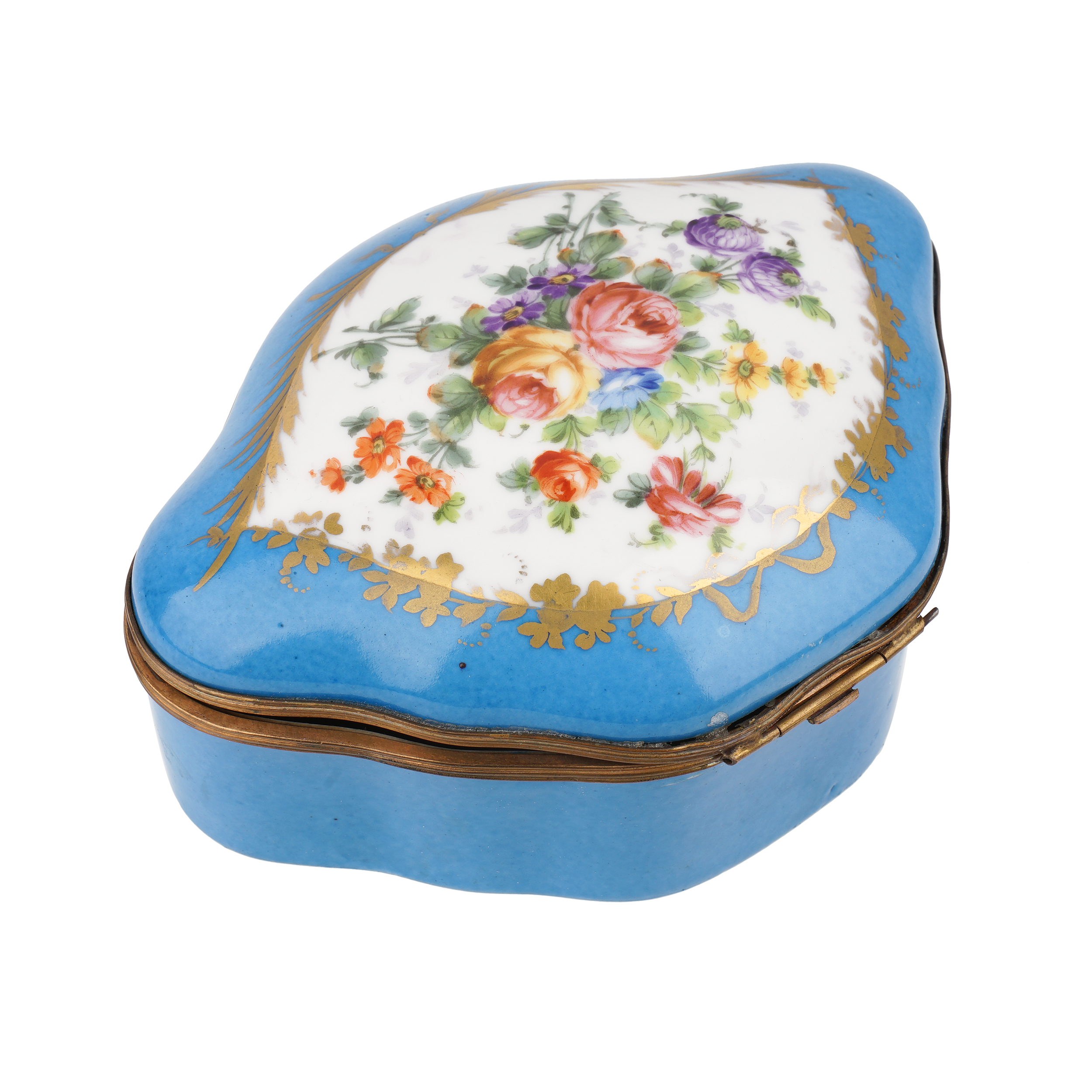 Фарфор, крытье голубым, роспись, золочение, латунь, нет клейма, Европа, вторая половина 19 века, размеры: длина 19см, ширина 13,5 см, высота 8 см